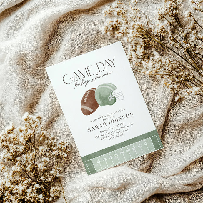 2032 Sage green Game day Football Sports Baby Boy Shower Invite, Editable Template, Digital Download
