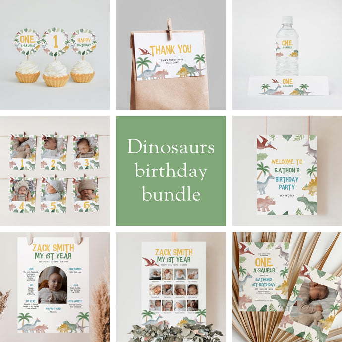 0323 Dino One a Saurus 1st Birthday Template Bundle - Editable Jungle Party Digital Download