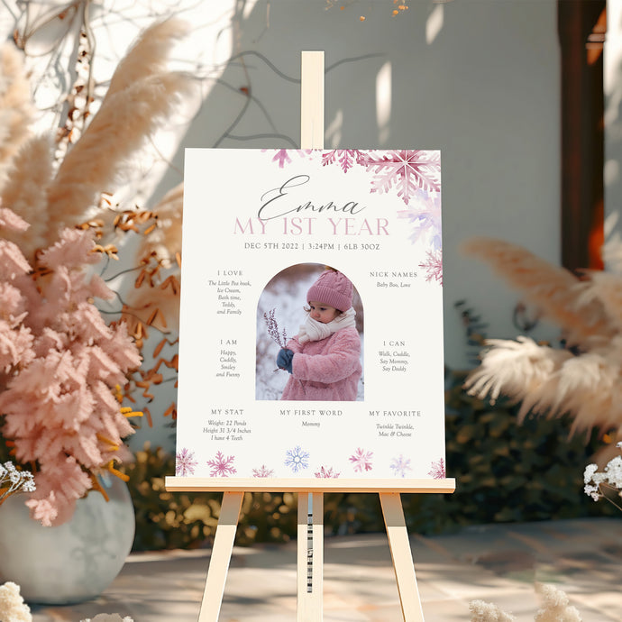 0319 Pink Snowflakes Winter Onederland Milestone Sign - Printable 1st Birthday Stats Template - Digital Download