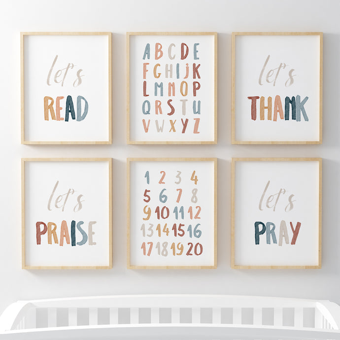 set of 6 boho Christian kids bible verse and alphabet art prints 07-186