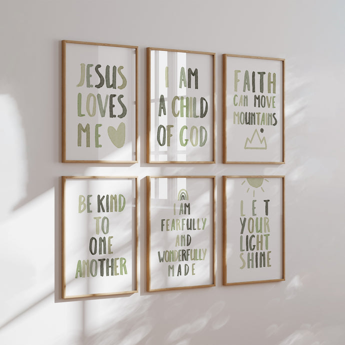 set of 6 sage green let your shine Christian kids bible verse art print 07-123