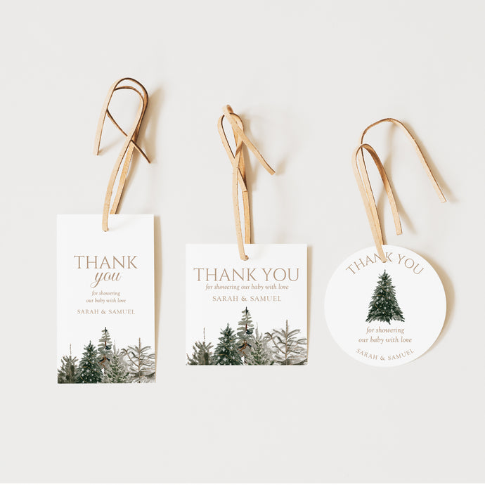 2024 Christmas Tree Baby Shower Favor Tags | Winter Woodland Holiday Thank You Stickers