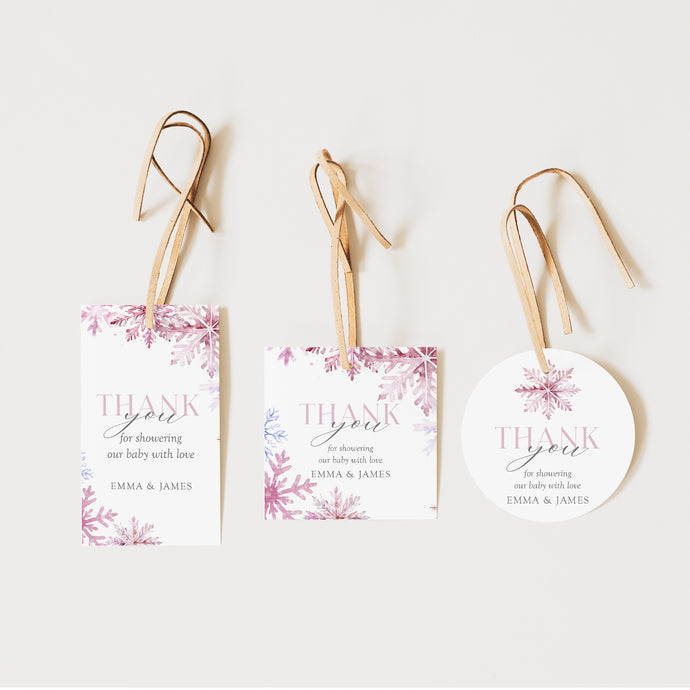 2024 Pink Snowflake Baby Shower Favor Tag, Winter Baby Shower Thank You Label, Holiday Shower Favor Tags, Editable Template