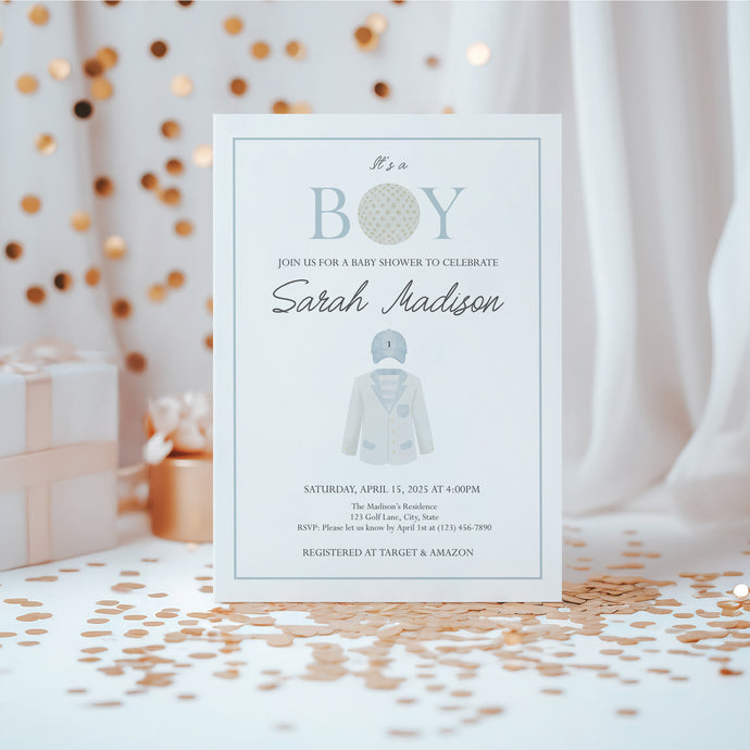 Blue Golf Monogram Gingham Baby Shower Invitation