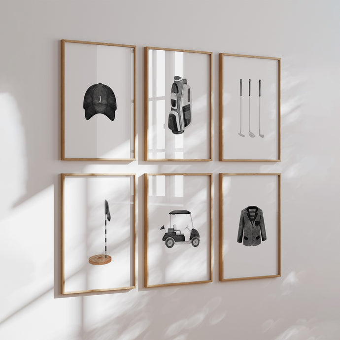 Black gingham pattern watercolor golf set of 6 art print 07-31102