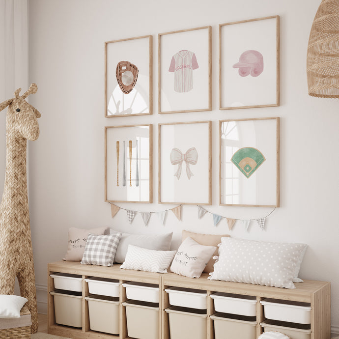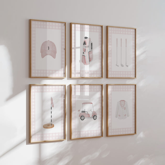 Pink gingham pattern watercolor golf set of 6 art print 07-31103