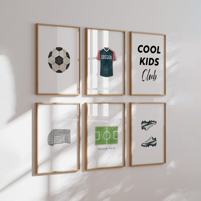 watercolor soccer jersey, ball, cool kids club, soccer field set of 6 wall art prints 07-27313