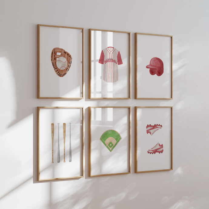 watercolor red baseball jersey, ball, glove, cap, bat, shoes, ground set of 6 wall art prints 07-27311