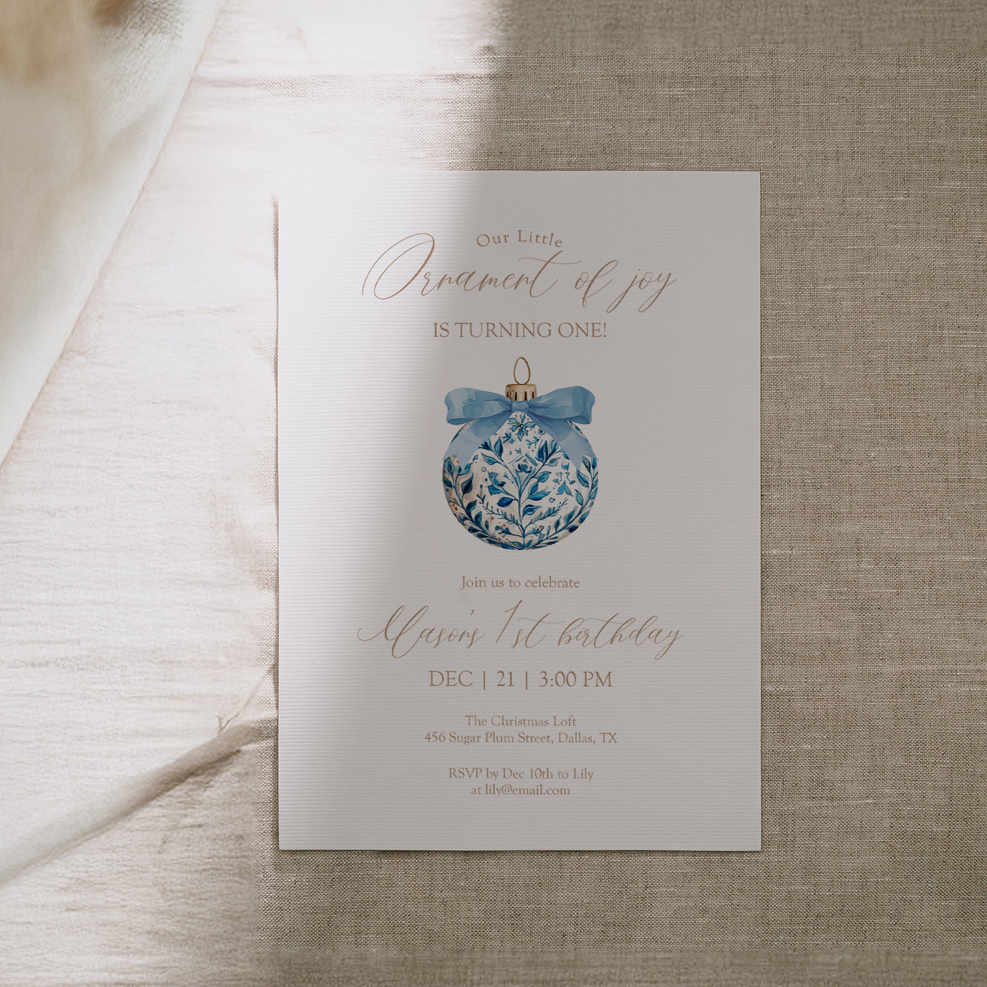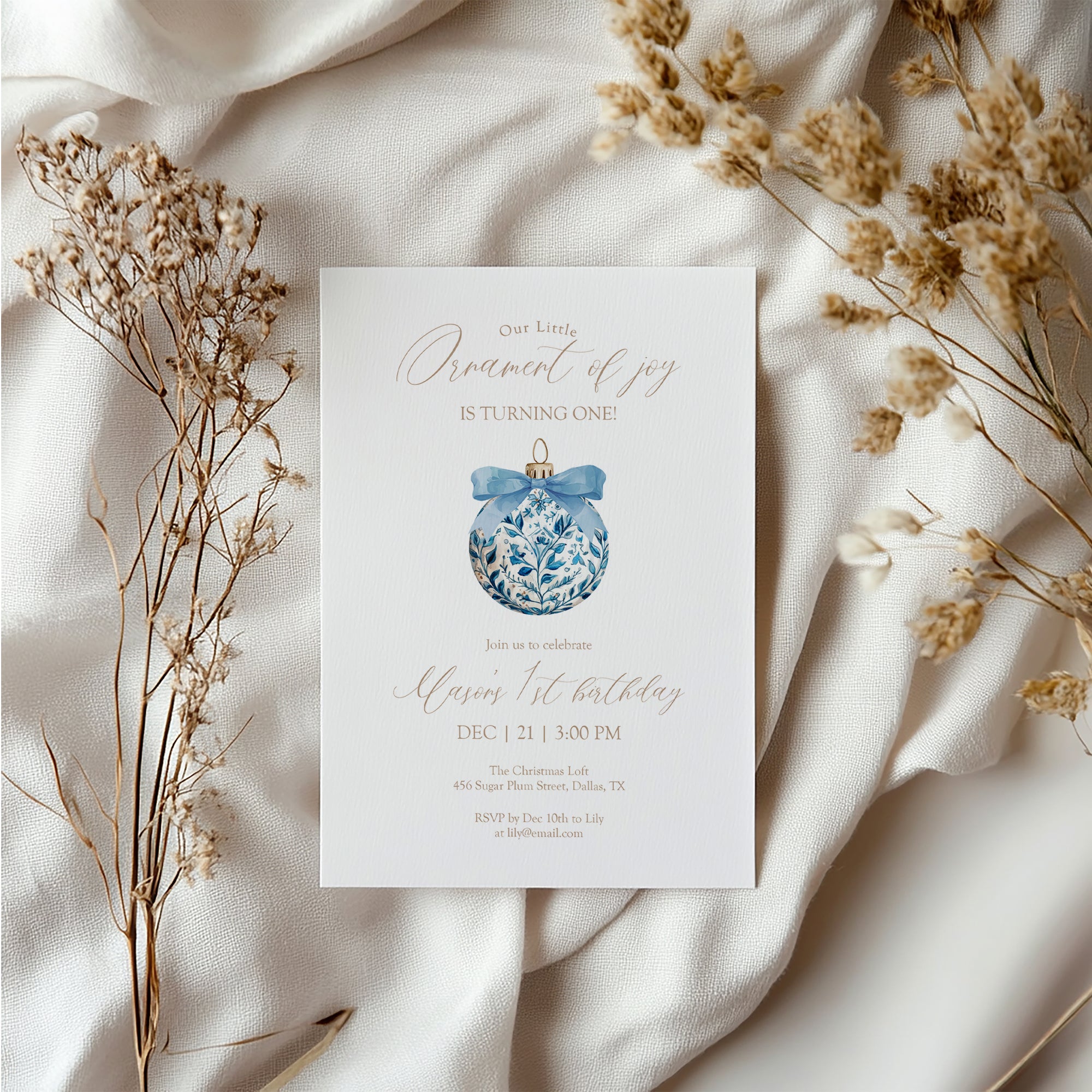 “Our Little Ornament of Joy is Turning One!” — a festive blue ornament watercolor design makes this the perfect Christmas-themed birthday invitation. A sweet and elegant way to celebrate a holiday season first birthday.