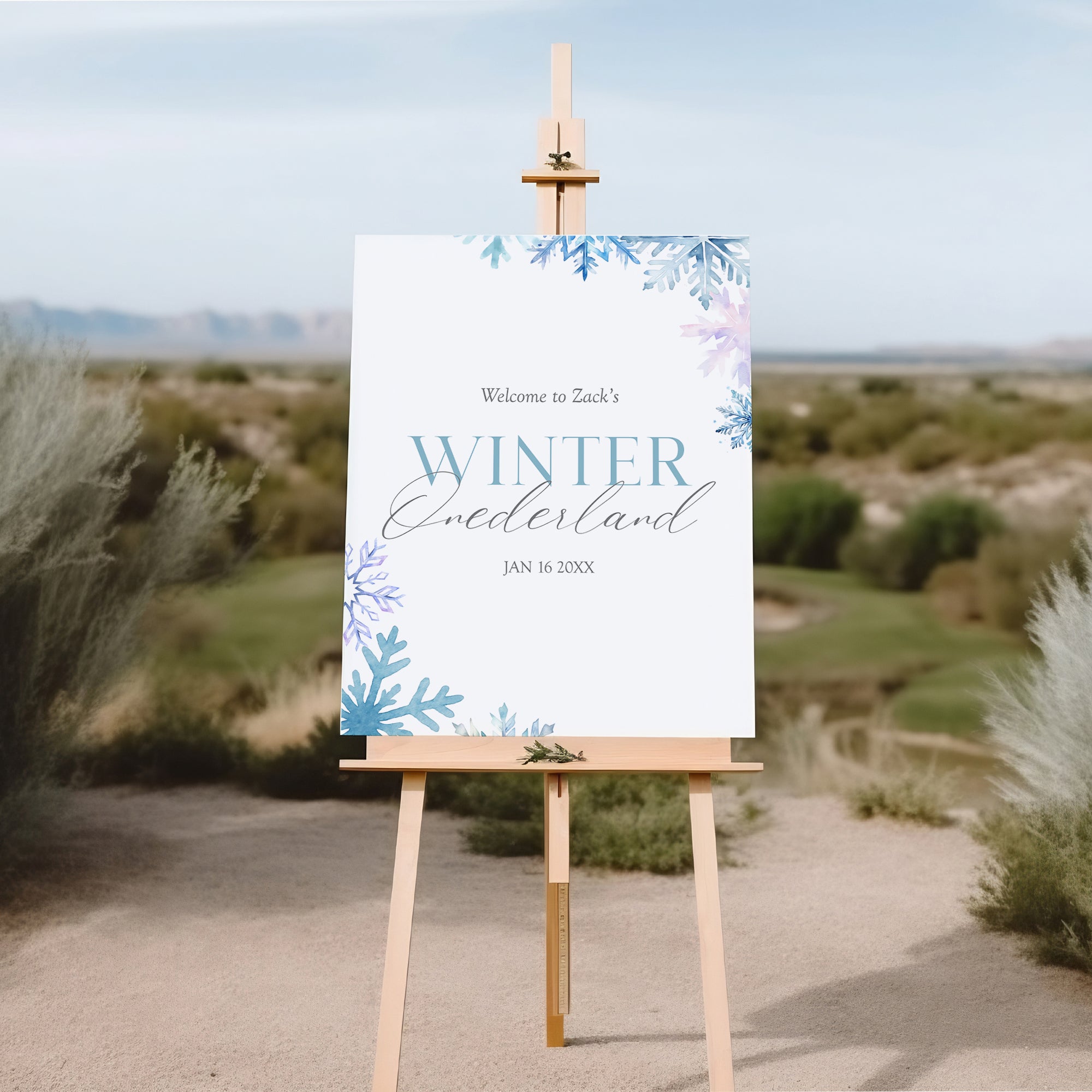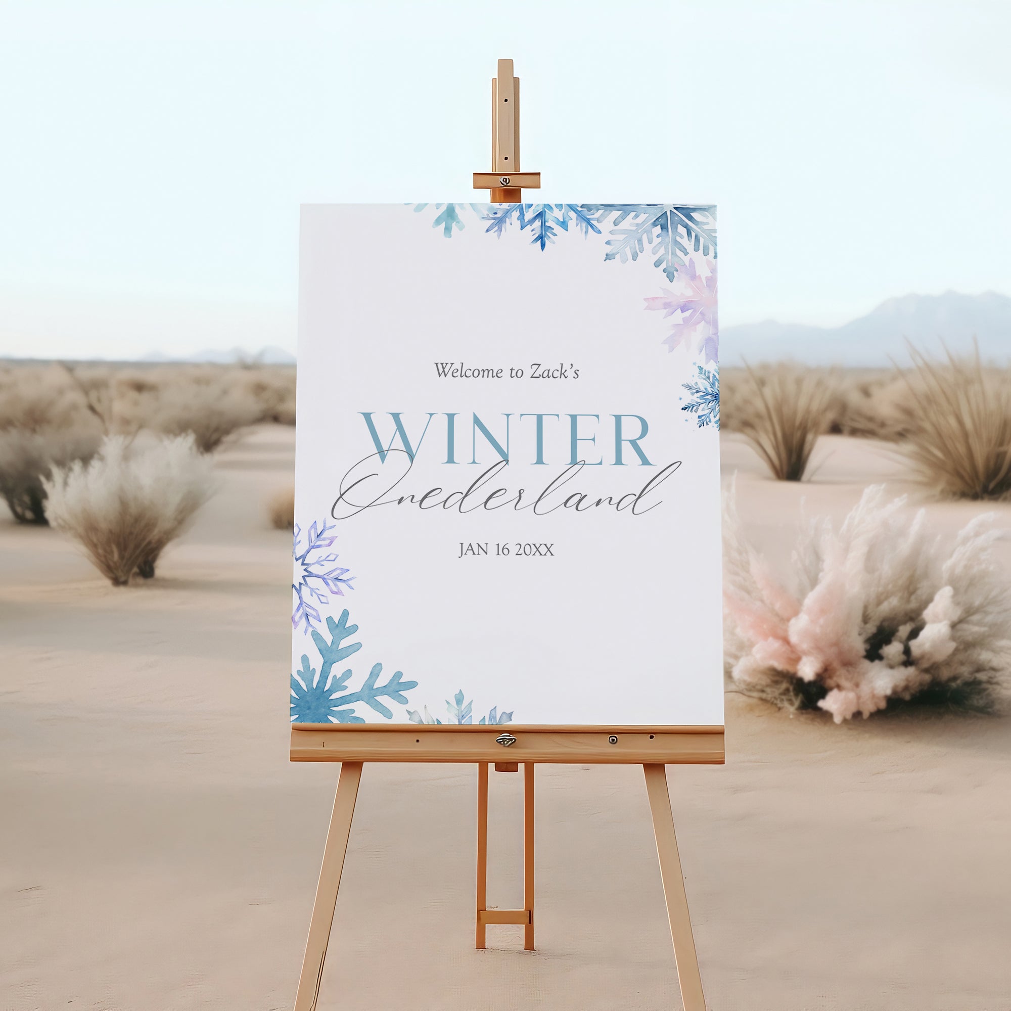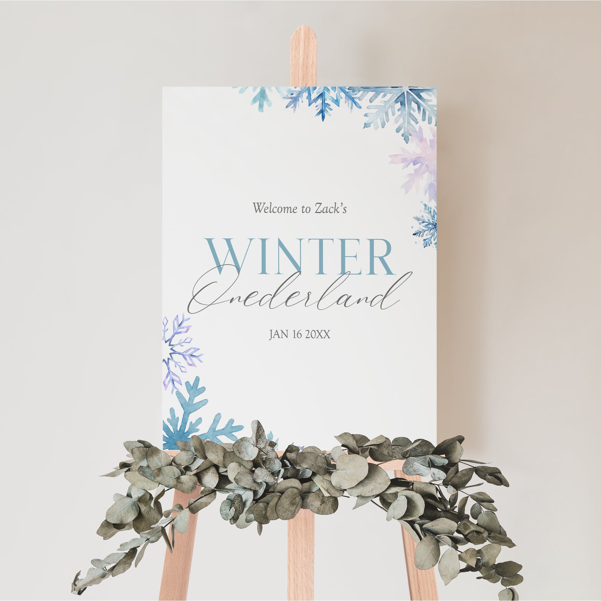 Welcome your little one to their Blue Watercolor Snow Flakes Winter Wonderland 1st Birthday party with our beautiful digital download Welcome sign template! This enchanting design features delicate blue snowflakes, perfect for creating a cozy winter atmosphere. Simply download, customize with your child's name and details, and print at home or your favorite print shop. Easy to use and charming, this template is ideal for celebrating a magical milestone. Make your party unforgettable with this lovely welcome sign!