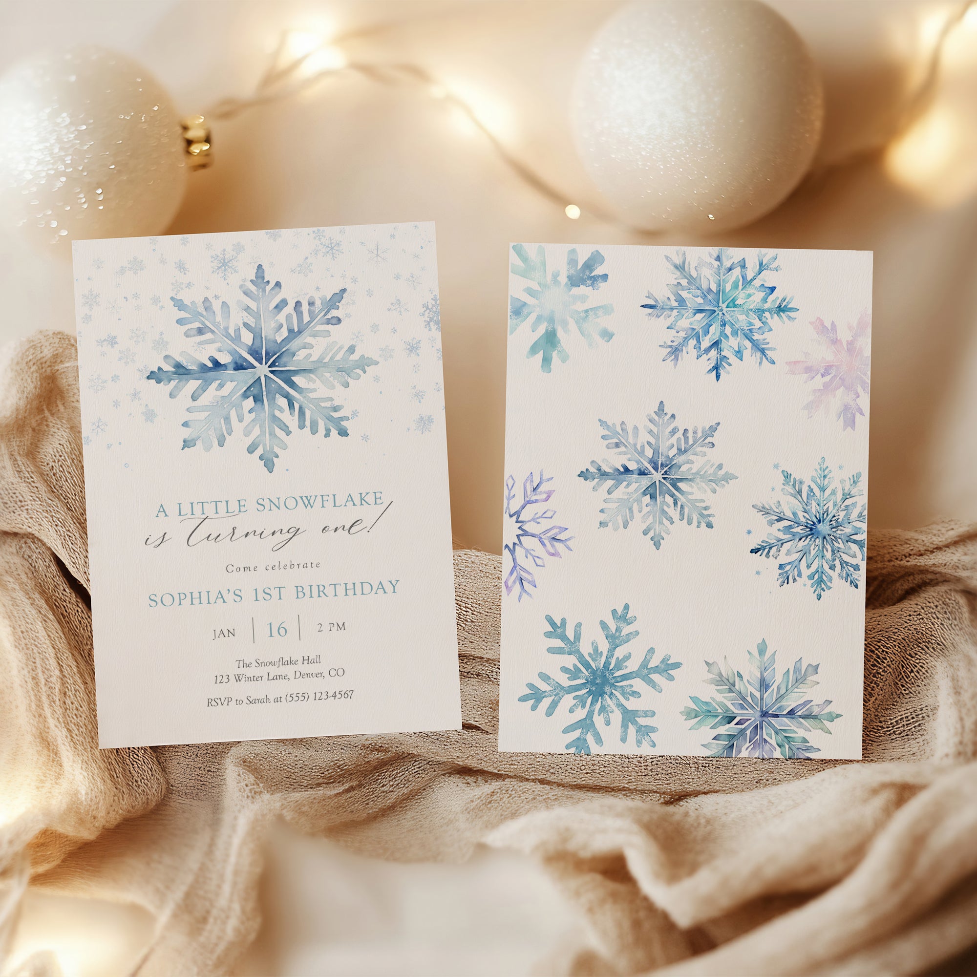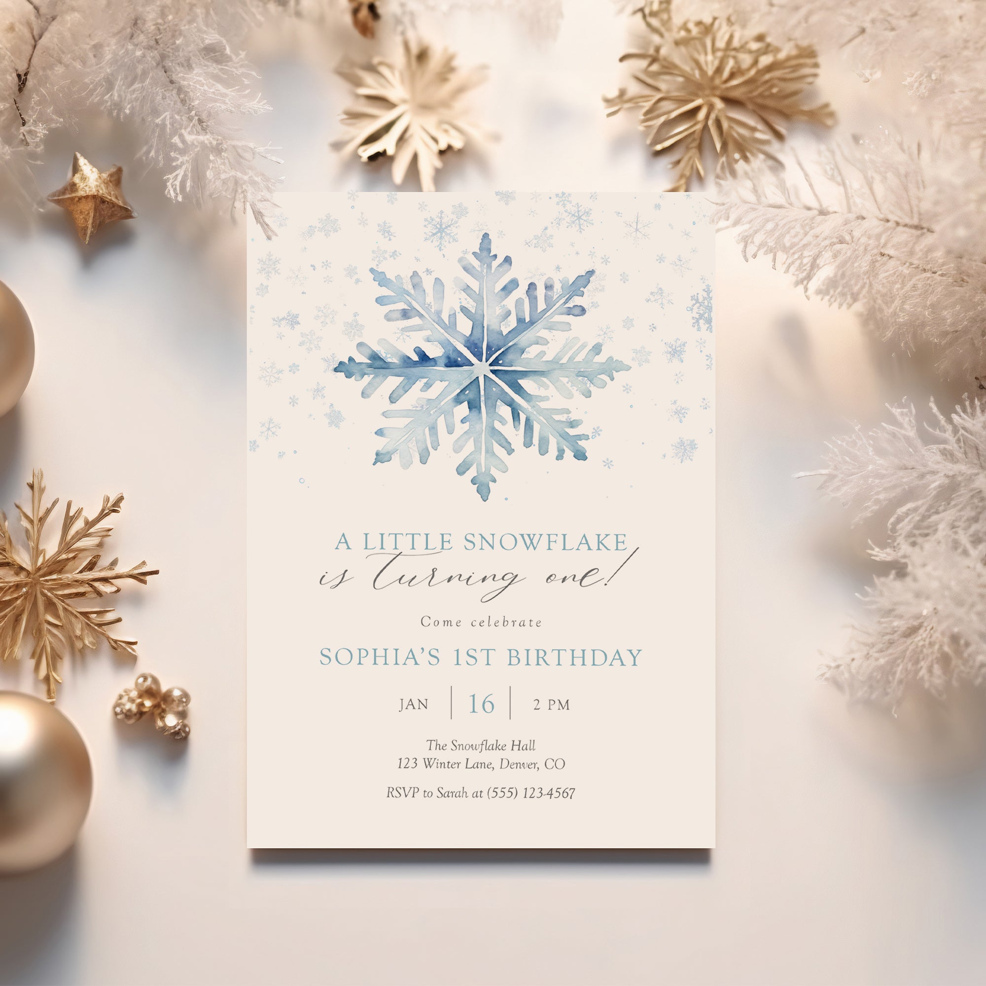 A little snowflake is turning one! This sweet winter-themed invitation in blue snowflake watercolor is perfect for celebrating your child’s first birthday. Ideal for a Winter ONE-derland or snowflake birthday theme. Customize with your own details instantly.