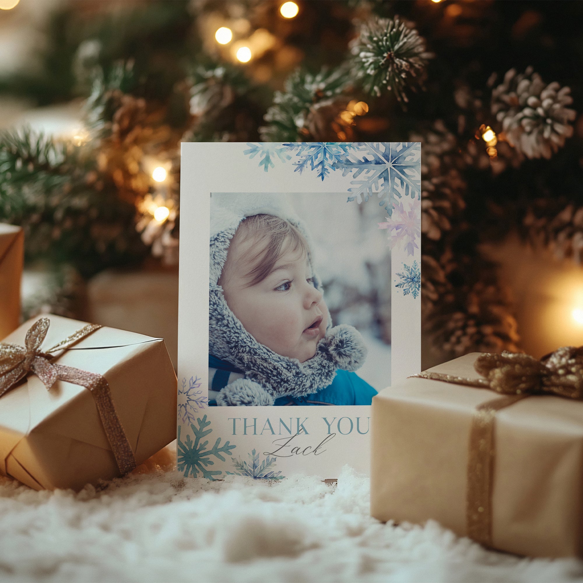 Capture the magic of winter with our Blue Snow Flakes Winter Onederland Photo Thank You Card Template. Perfect for your little one's first birthday, this editable design makes customizing a breeze! Easily personalize your cards using Corjl, and have them ready in minutes. This digital download allows you to print at home or through a professional service. Thank your guests in style with this charming and whimsical thank you card! Get started on your unique creation today!