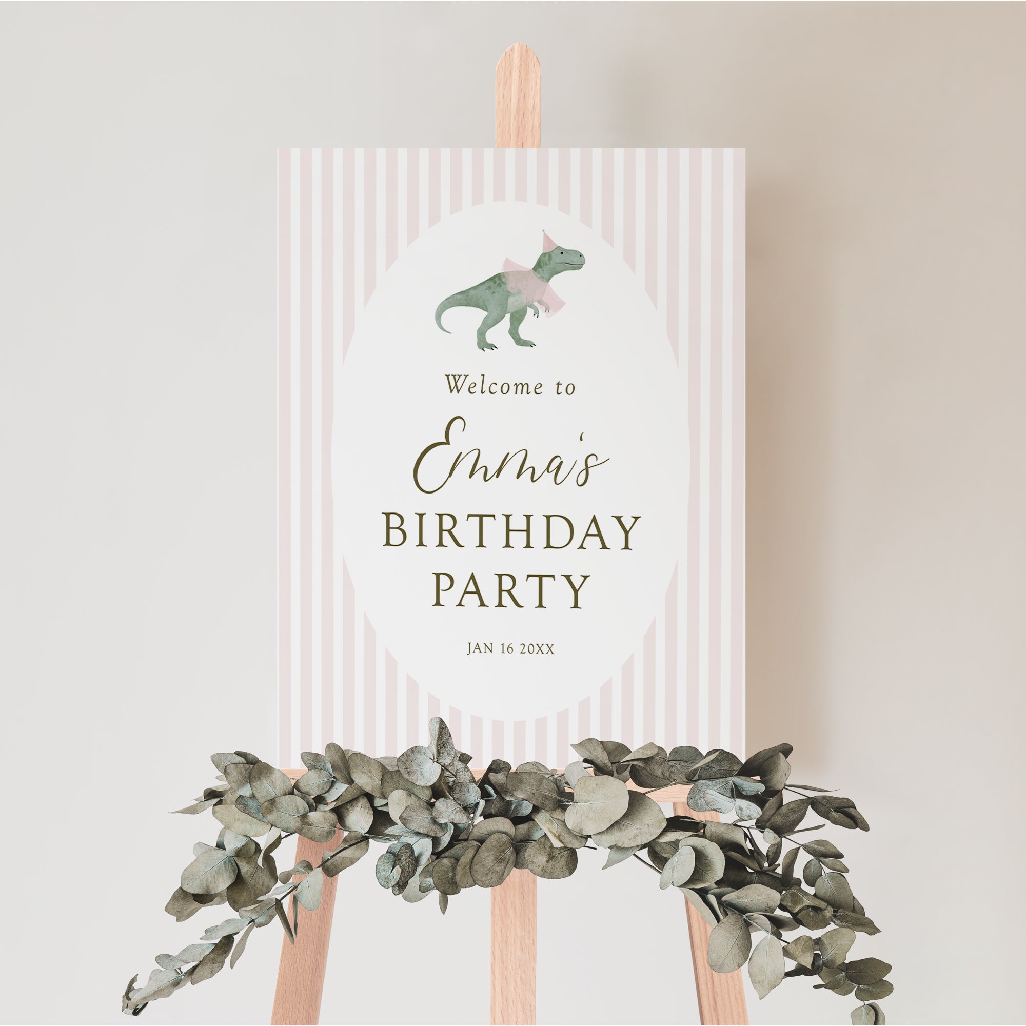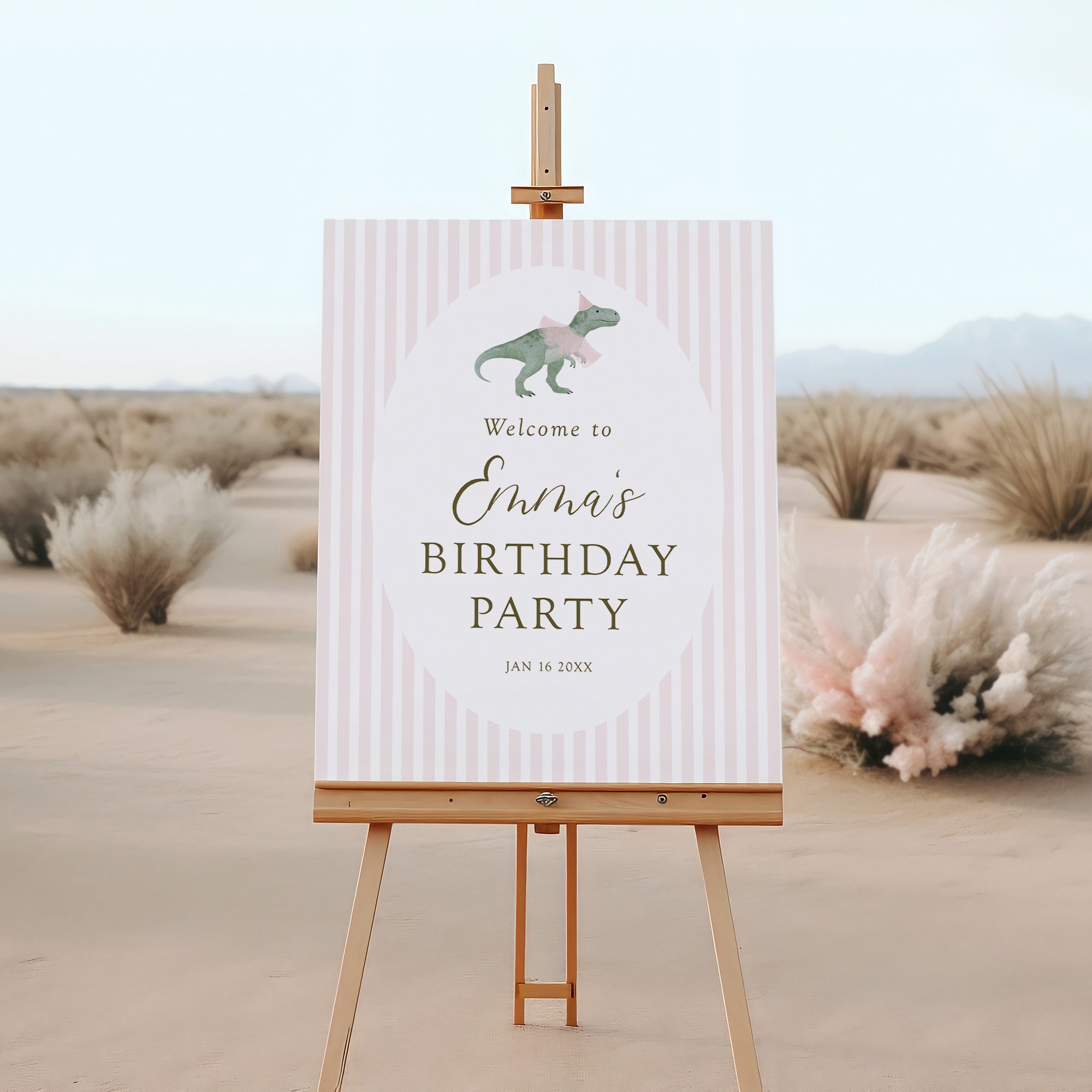 Welcome your little dinosaur enthusiast with our Pink T-Rex Birthday Welcome Sign! This charming design features a delightful ballerina T-Rex, perfect for a fun girl birthday theme. Celebrate your child's special day with this unique dino birthday decor that sets the stage for an unforgettable party. Whether it’s for a girl’s birthday party or dino-themed celebration, this birthday sign will add a whimsical touch to your event! Make her day one to remember with this adorable T-Rex ballerina decor!
