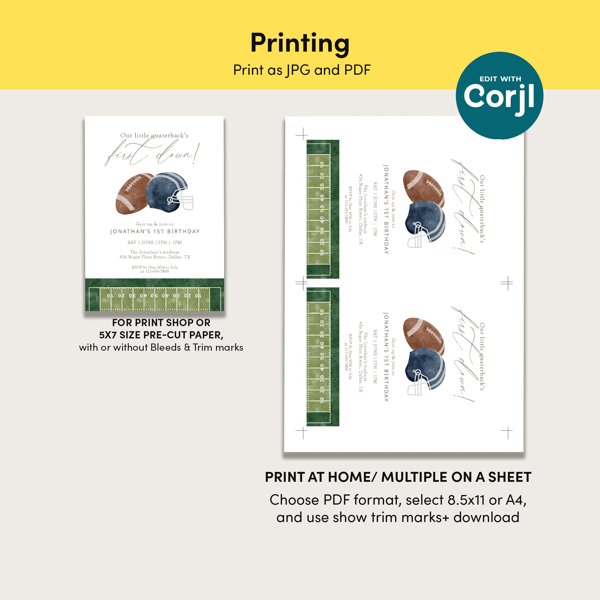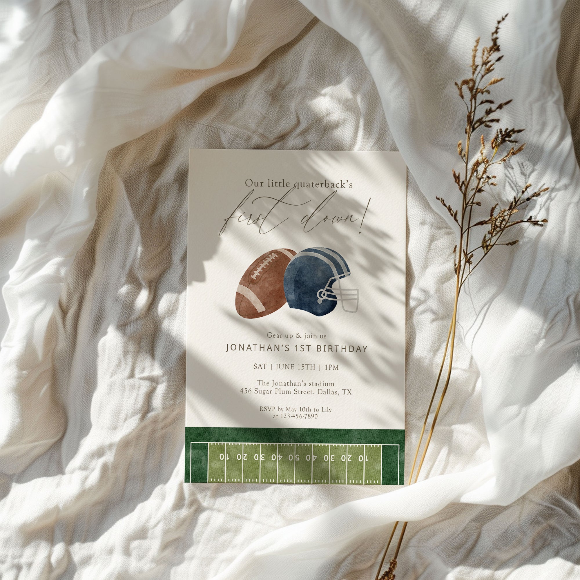 Celebrate your little champ’s big day with our First Down Football Boys 1st Birthday Invitation Template! This editable template features a charming watercolor hand-drawn design, making it perfect for your young sports fan’s celebration. Easily customize all the details to create a unique invite that suits your style. As a convenient digital download, you can print it at home or at your favorite print shop. Make their first birthday unforgettable—get your invitation template today!