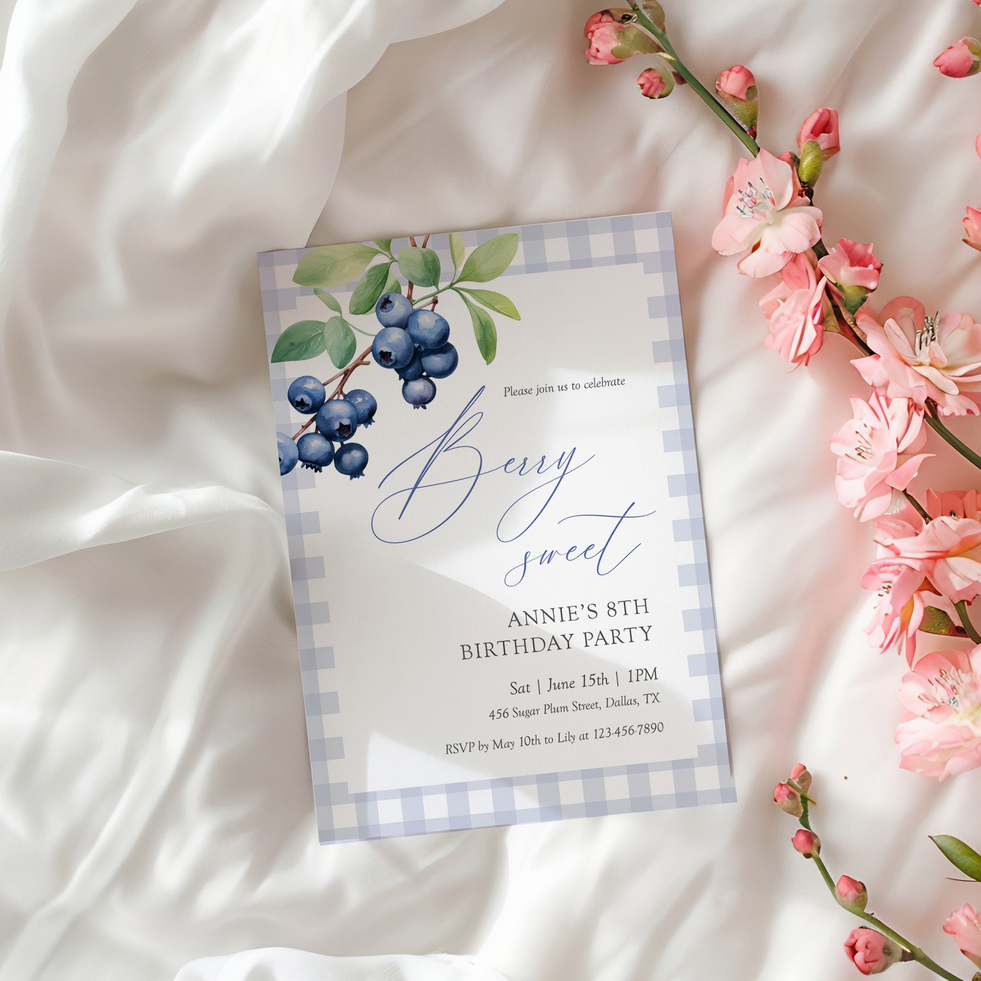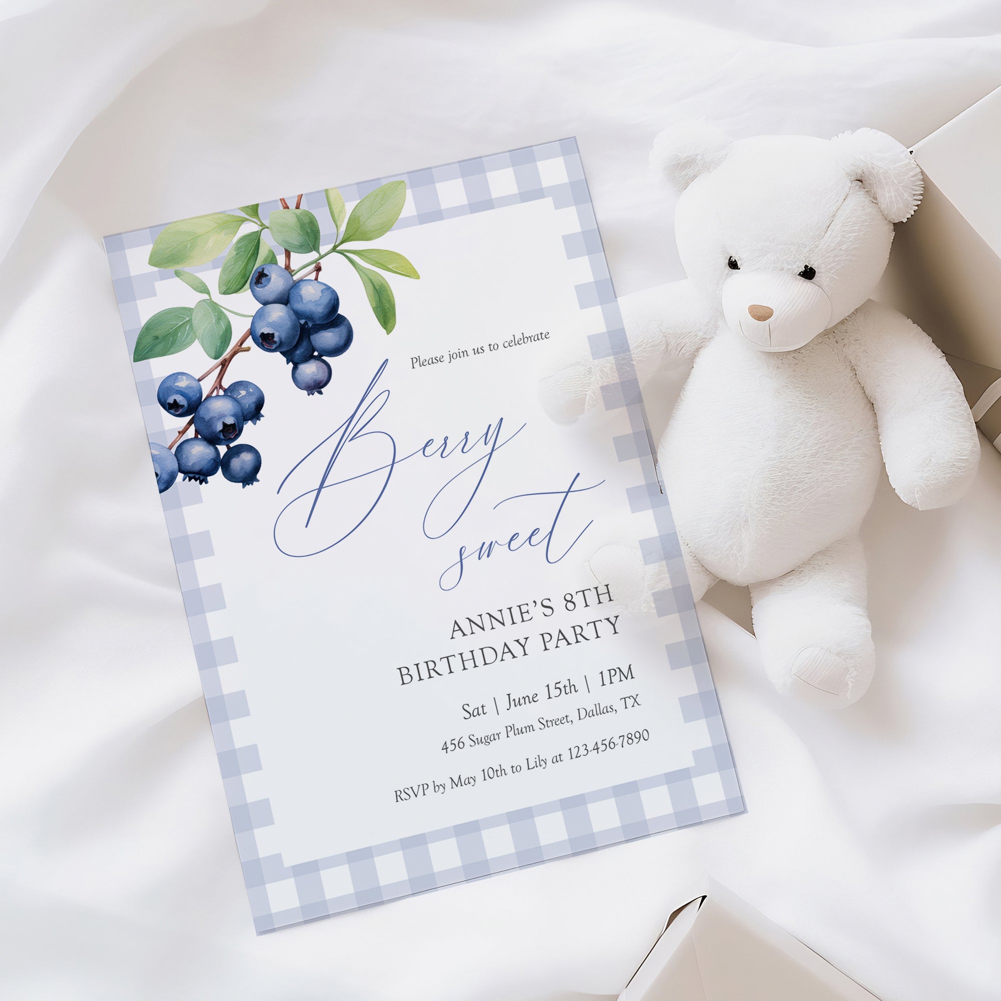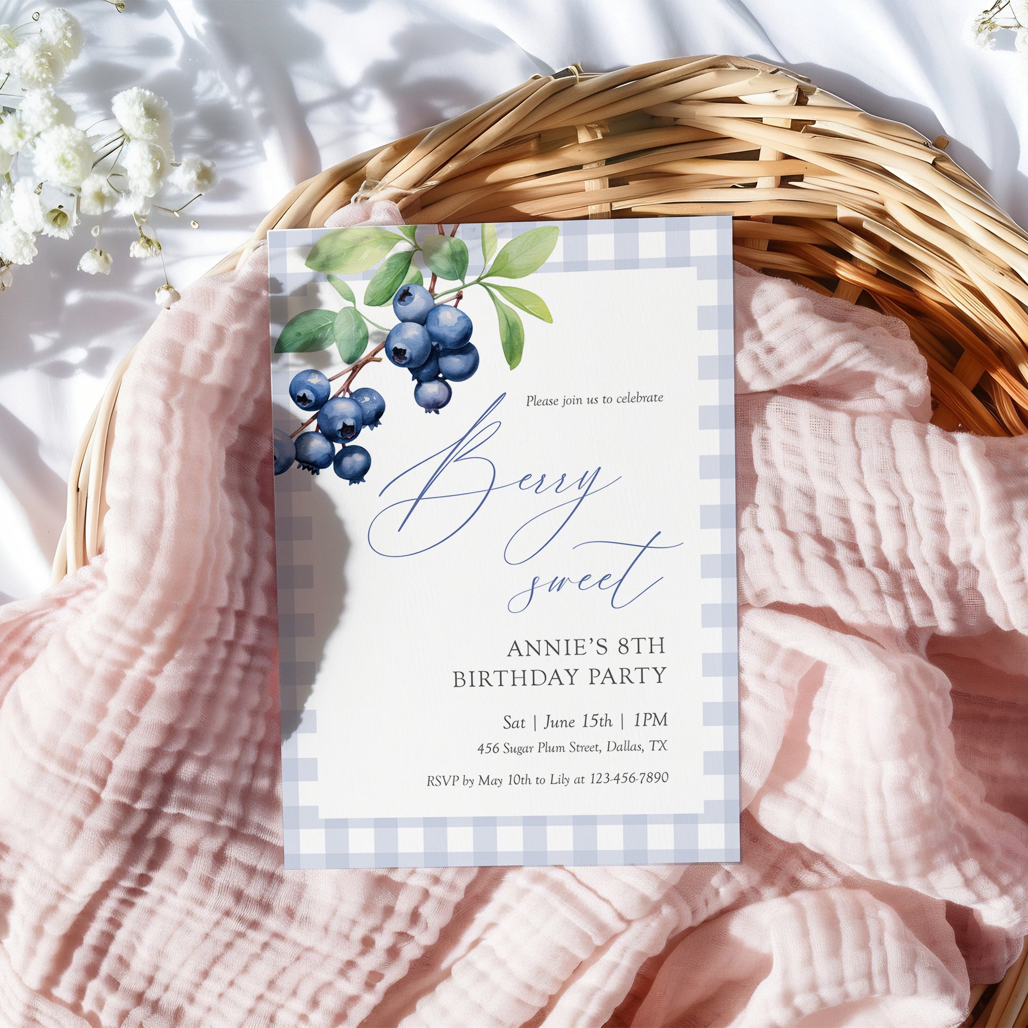 Celebrate your little one’s 8th birthday with our adorable Blueberry Berry Sweet Birthday Invitation! This charming blue gingham invitation is perfect for a fun-filled celebration. With our digital download, you can easily edit the template to add your personalized details. Simply customize, print, and send! Make their special day memorable with this delightful invite that captures the essence of summer fun. Order now and get ready to party in style!