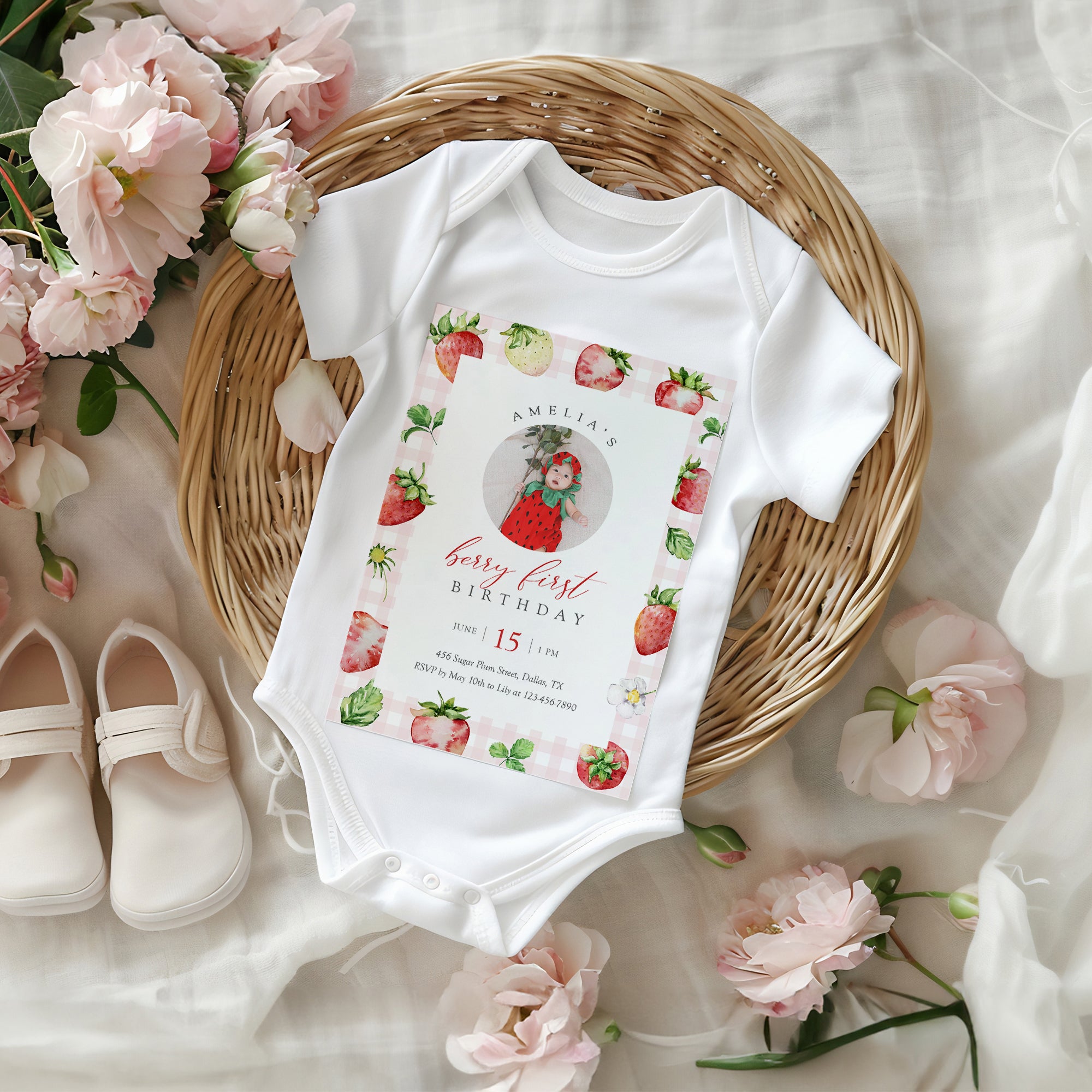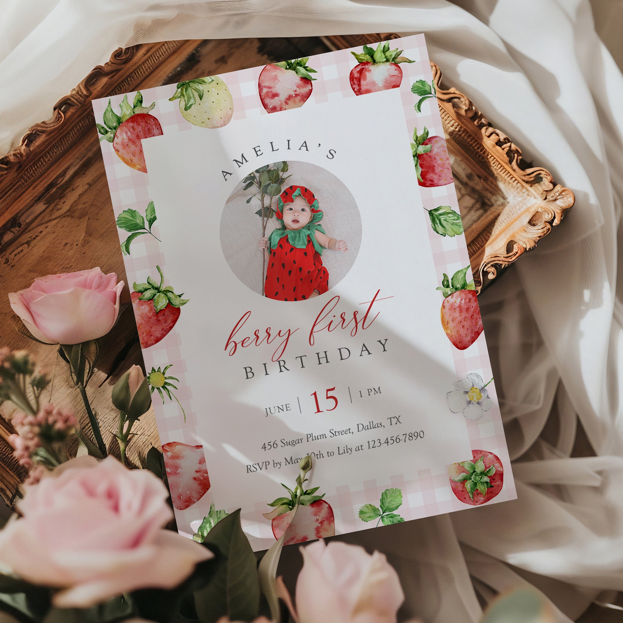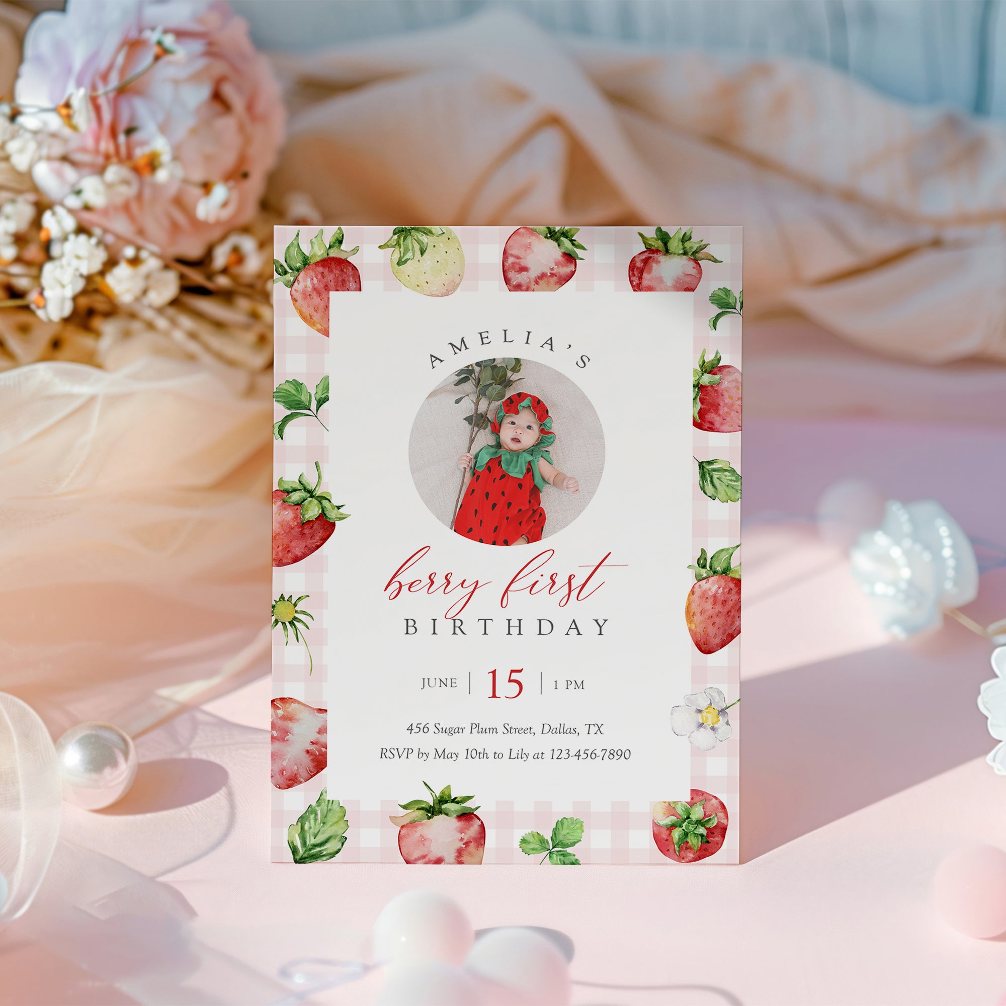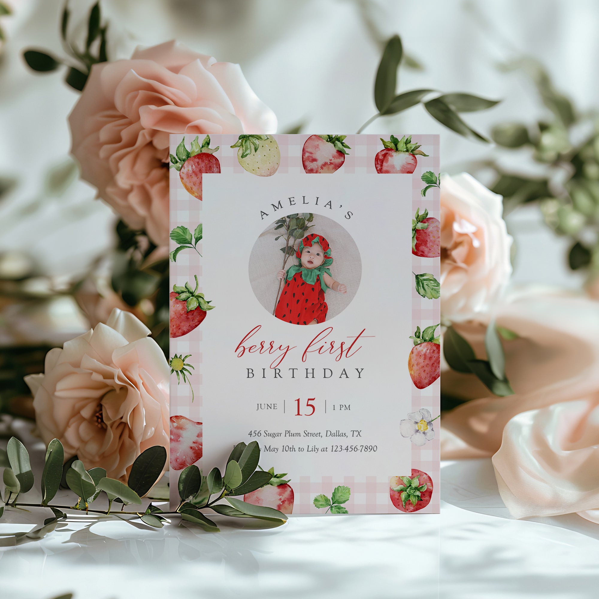 0326 Pink Gingham Strawberry Berry First Birthday Photo Invite, Editable Template, Digital Download