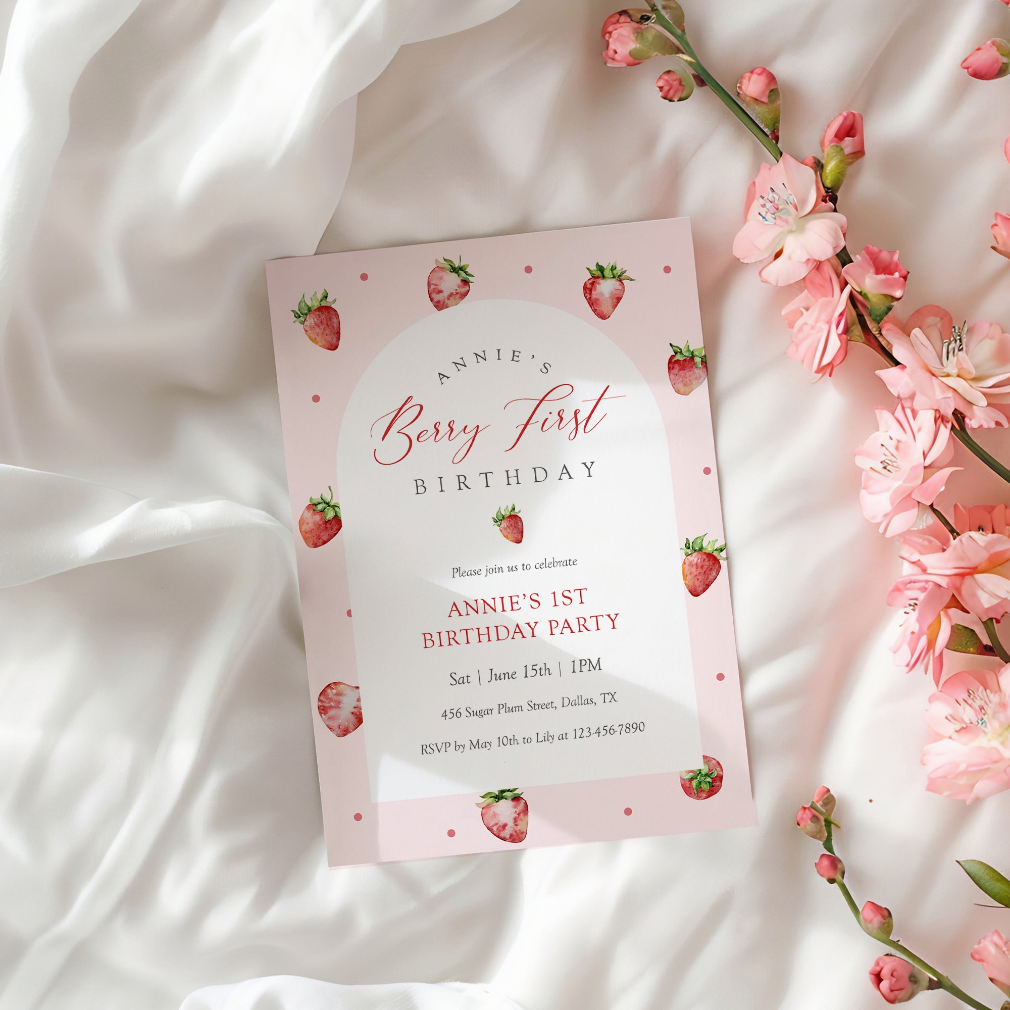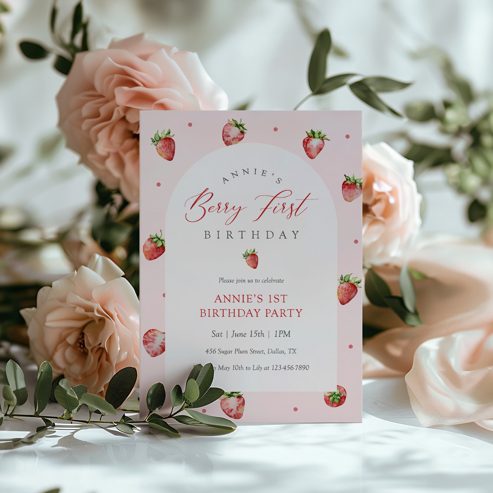 0326 Pink Strawberry Berry 1st Birthday Photo Invite, Editable Template, Digital Download