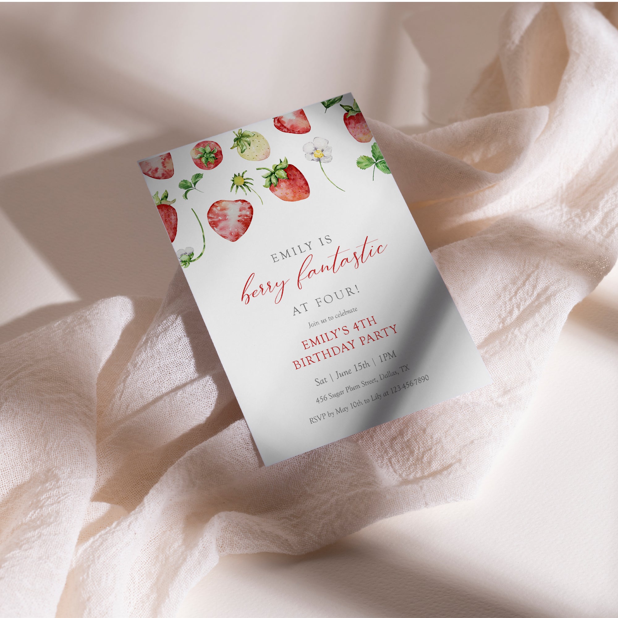 Celebrate your little one's special day with our Strawberry Berry Four Invite! This Editable Girl 4th Birthday Template is perfect for adding a personal touch to your celebration. With an adorable design featuring fun strawberries, it's sure to delight guests of all ages. Download your digital invitation instantly and customize it easily to match your party theme! Make your child's birthday unforgettable with this charming invite. Ideal for quick and hassle-free planning—grab yours today!