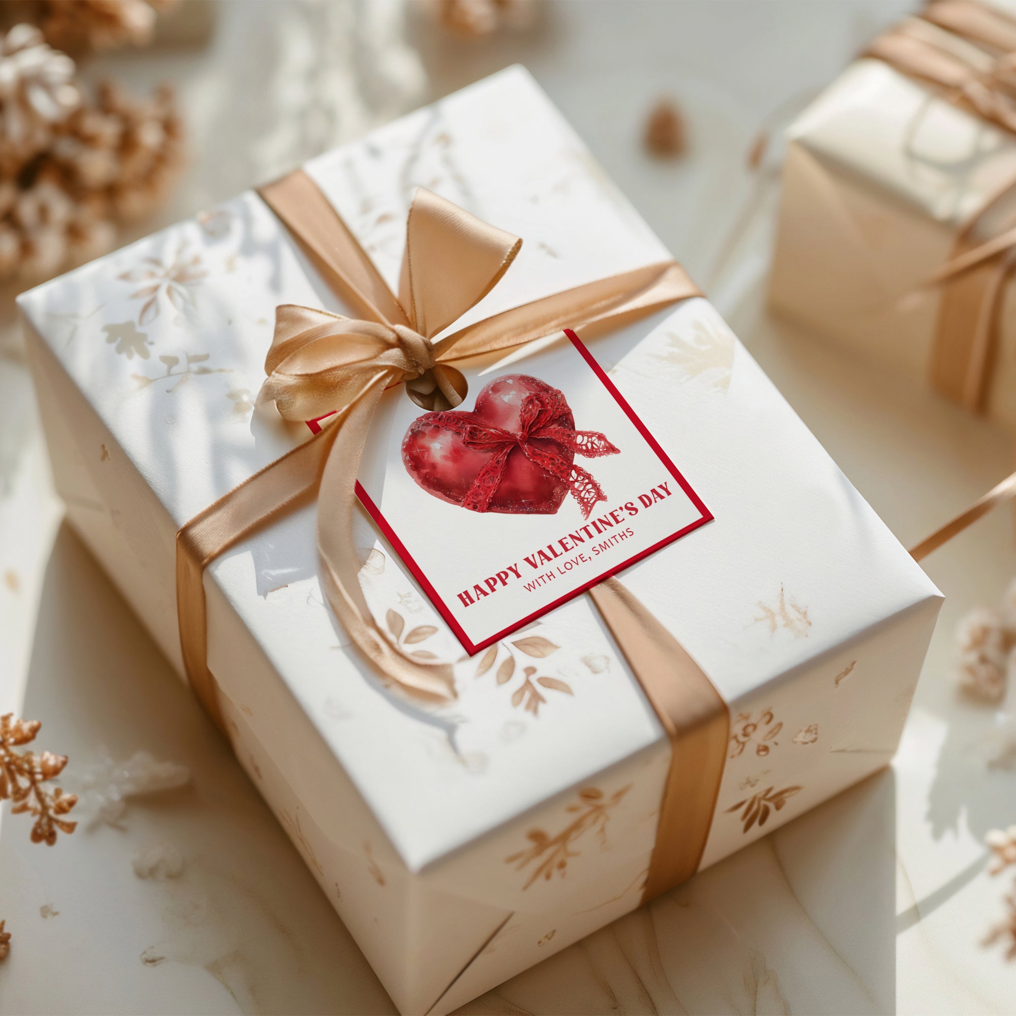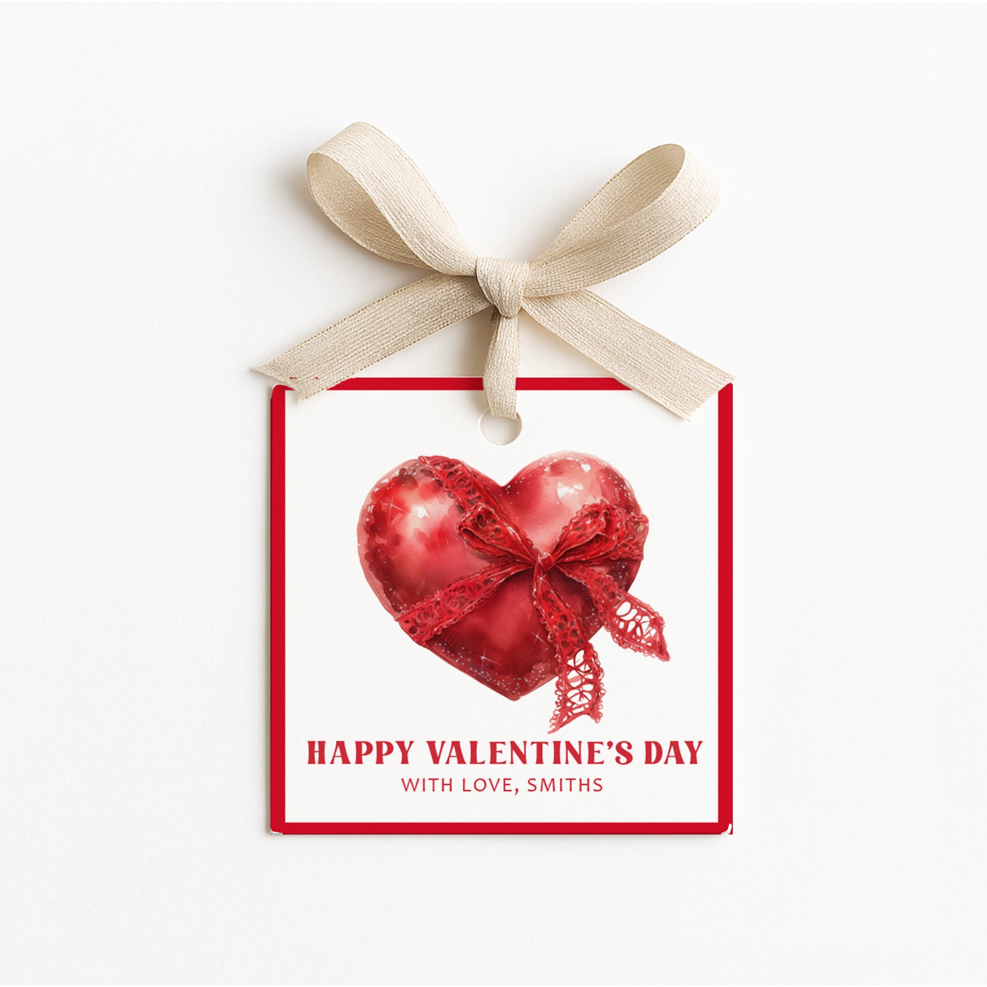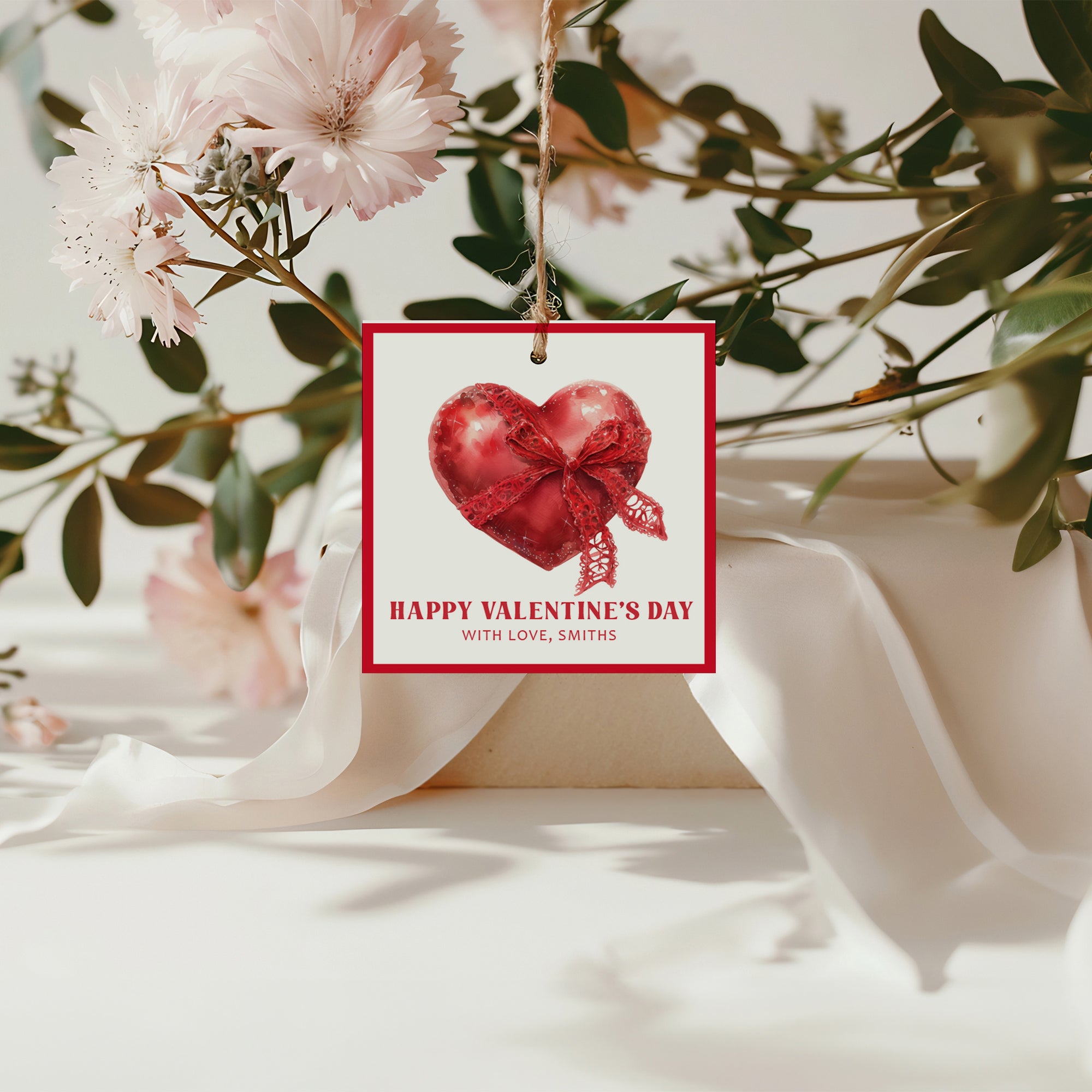An elegant Valentine’s Day gift tag featuring a heart with ribbon detail. Perfect for teachers, coworkers, friends, neighbors, and family gifts. A versatile design that fits chocolates, candles, gift bags, and Valentine treats.