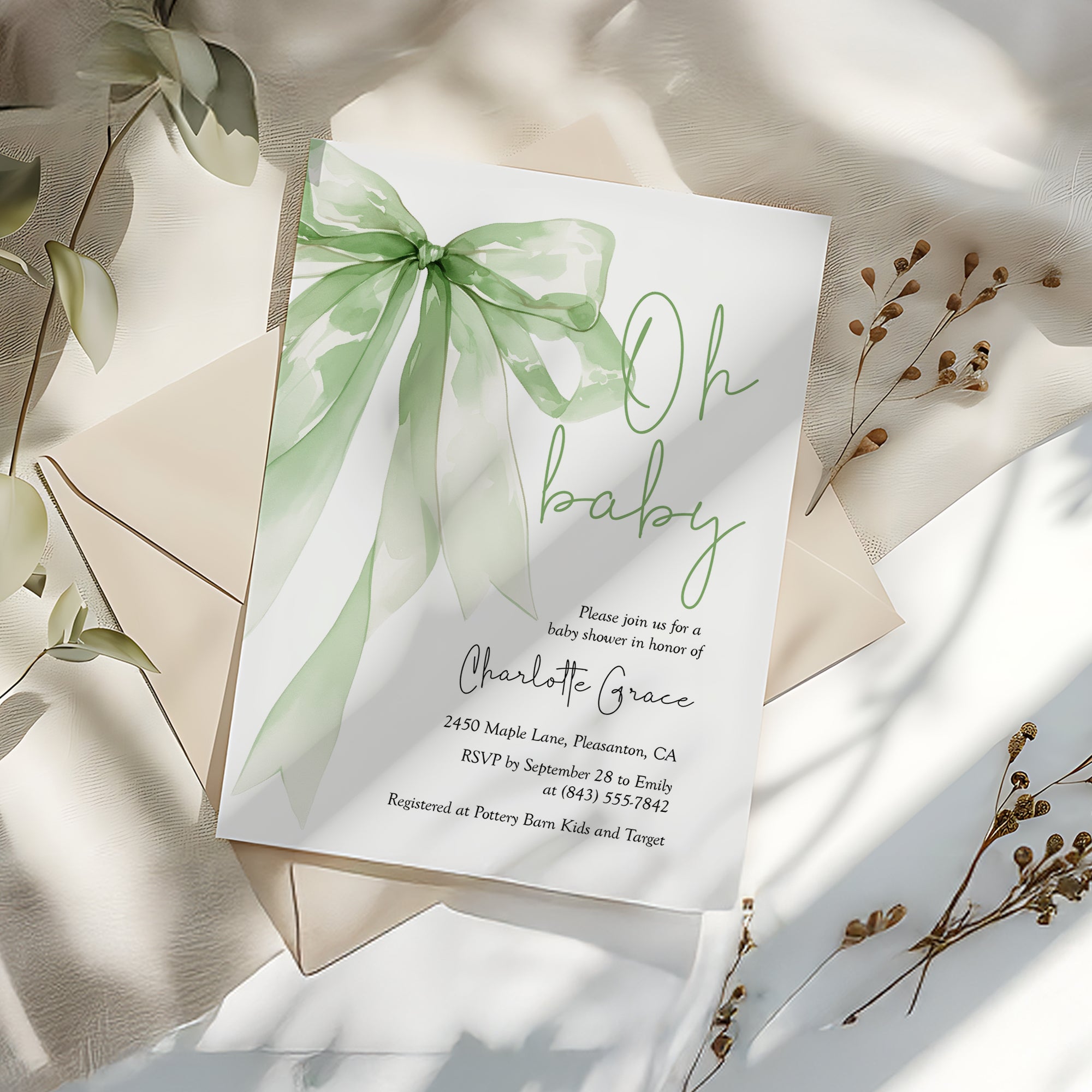 2021 sage green bow baby shower invitation