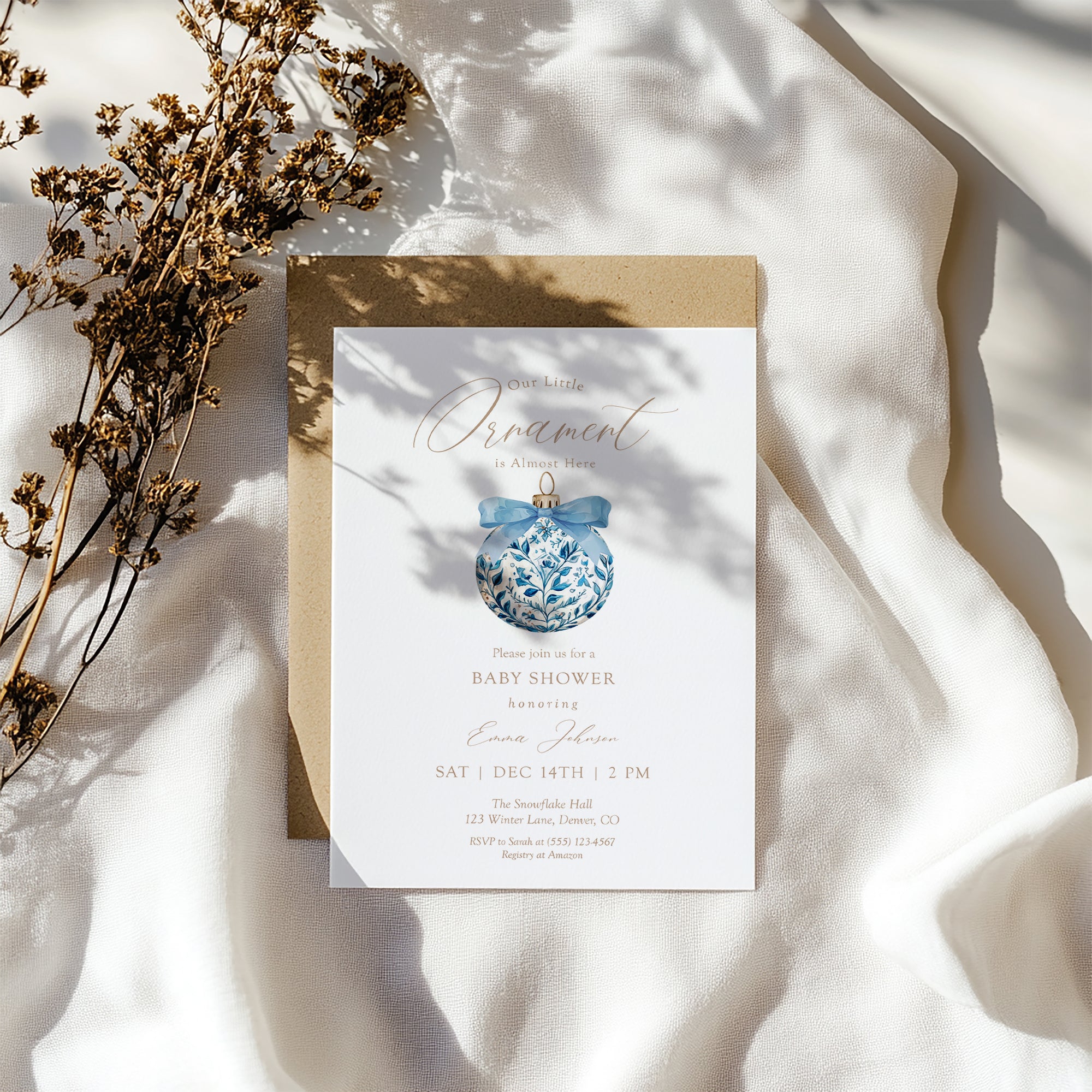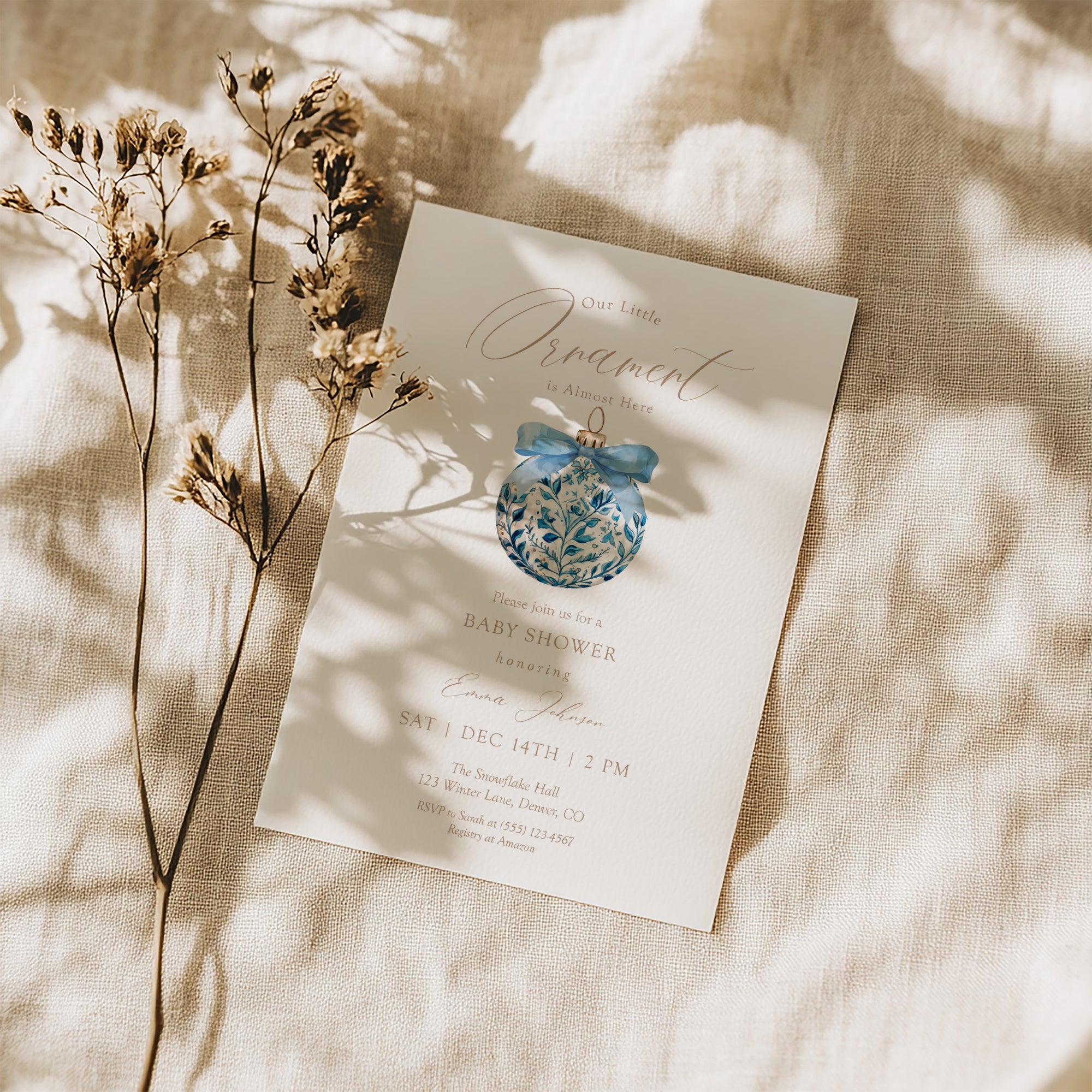 “Our Little Ornament is Almost Here!” Celebrate your baby shower in festive winter style with this elegant blue ornament invitation. Featuring a watercolor Christmas ornament with a blue ribbon, this design is perfect for holiday and winter baby showers. Personalize easily with your event details and print at home or through your favorite printing service.