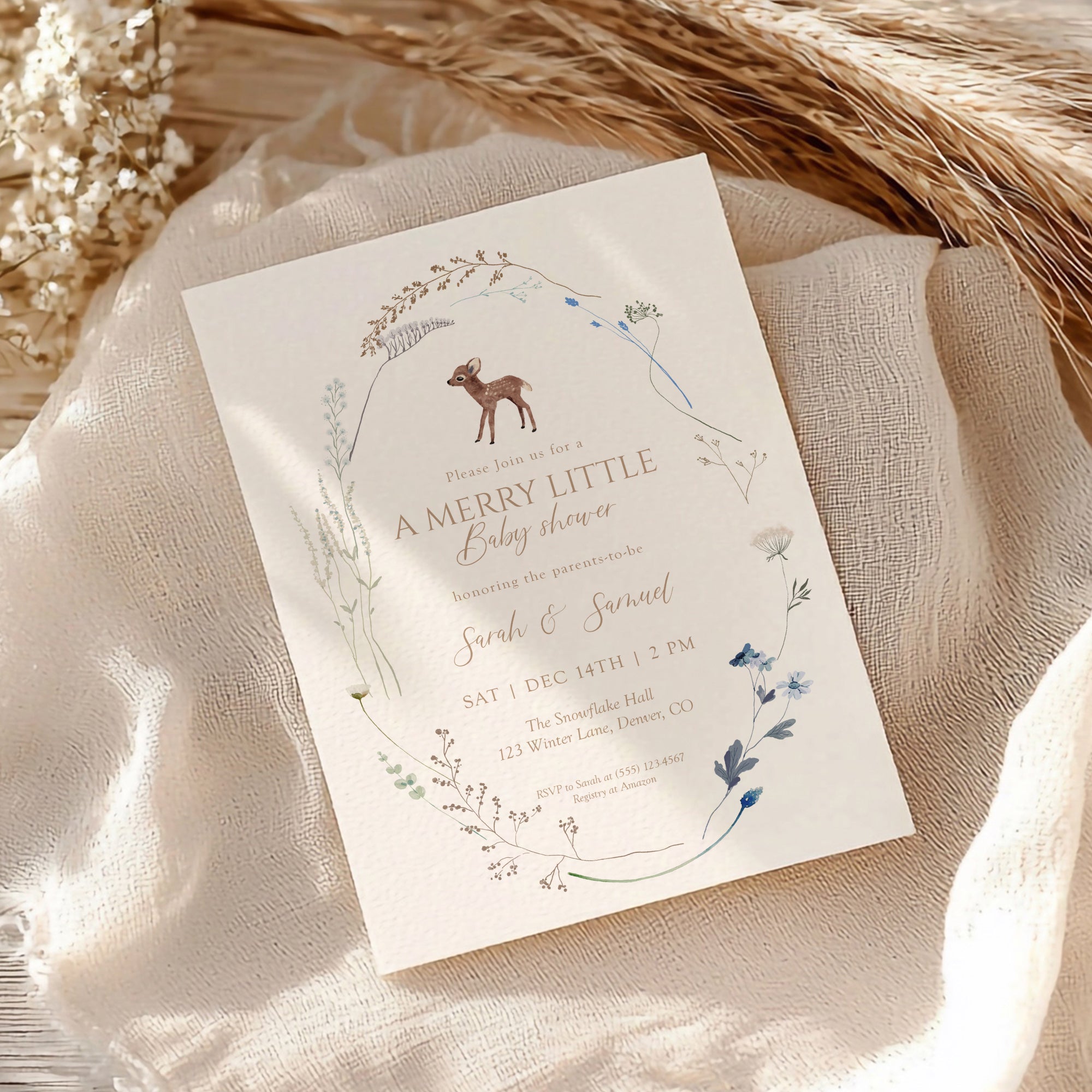 Host a magical winter celebration with this “A Merry Little Baby Shower” invitation. Decorated with delicate winter florals and a sweet woodland fawn, this gender-neutral design is perfect for rustic, woodland, or winter baby showers. Easily editable and printable to fit your party details.