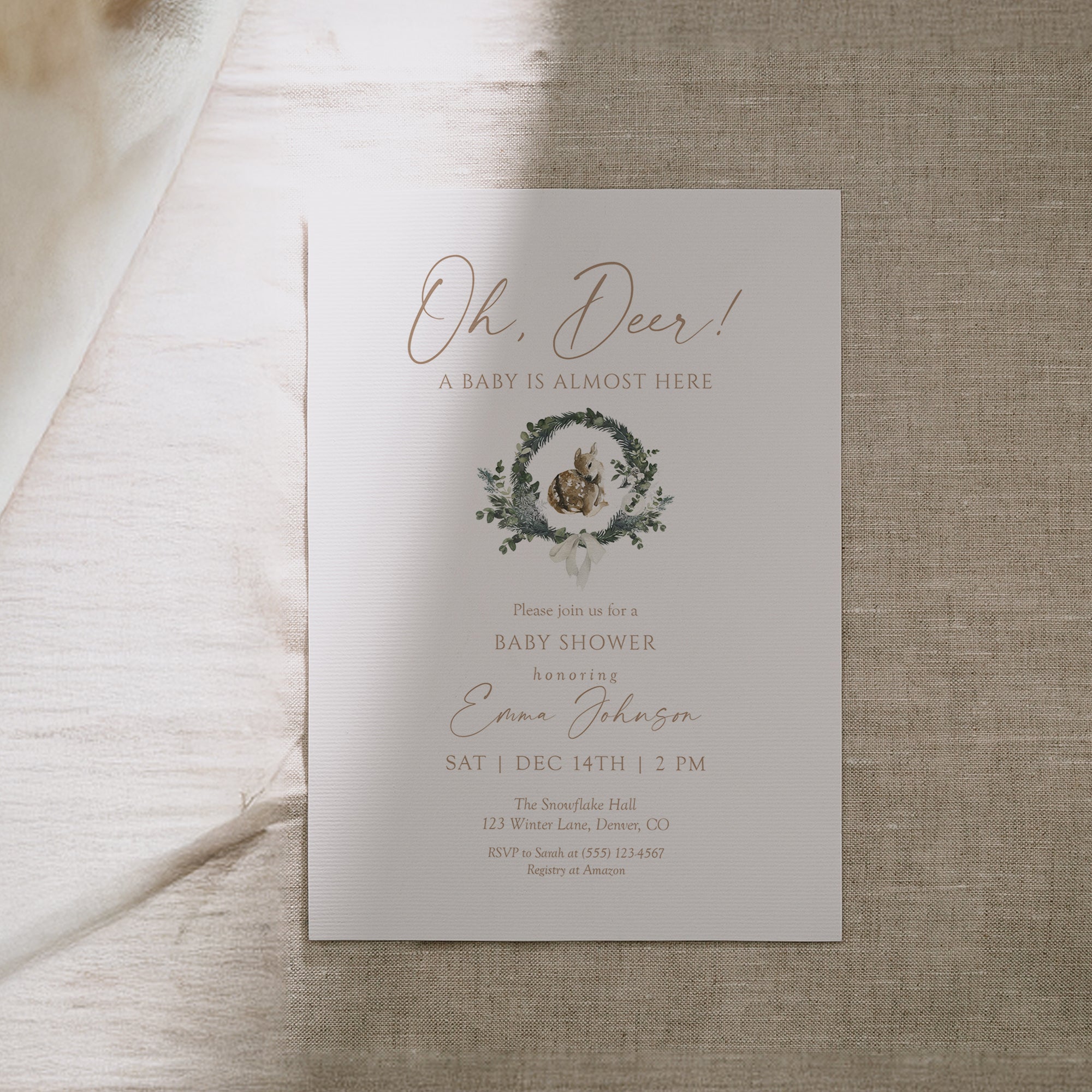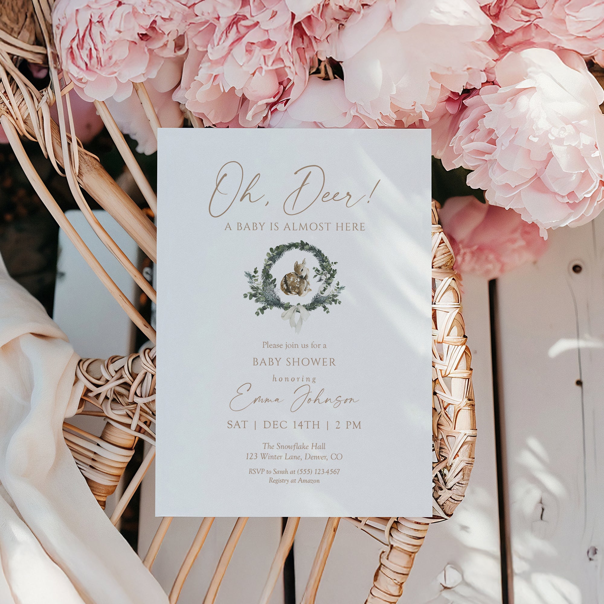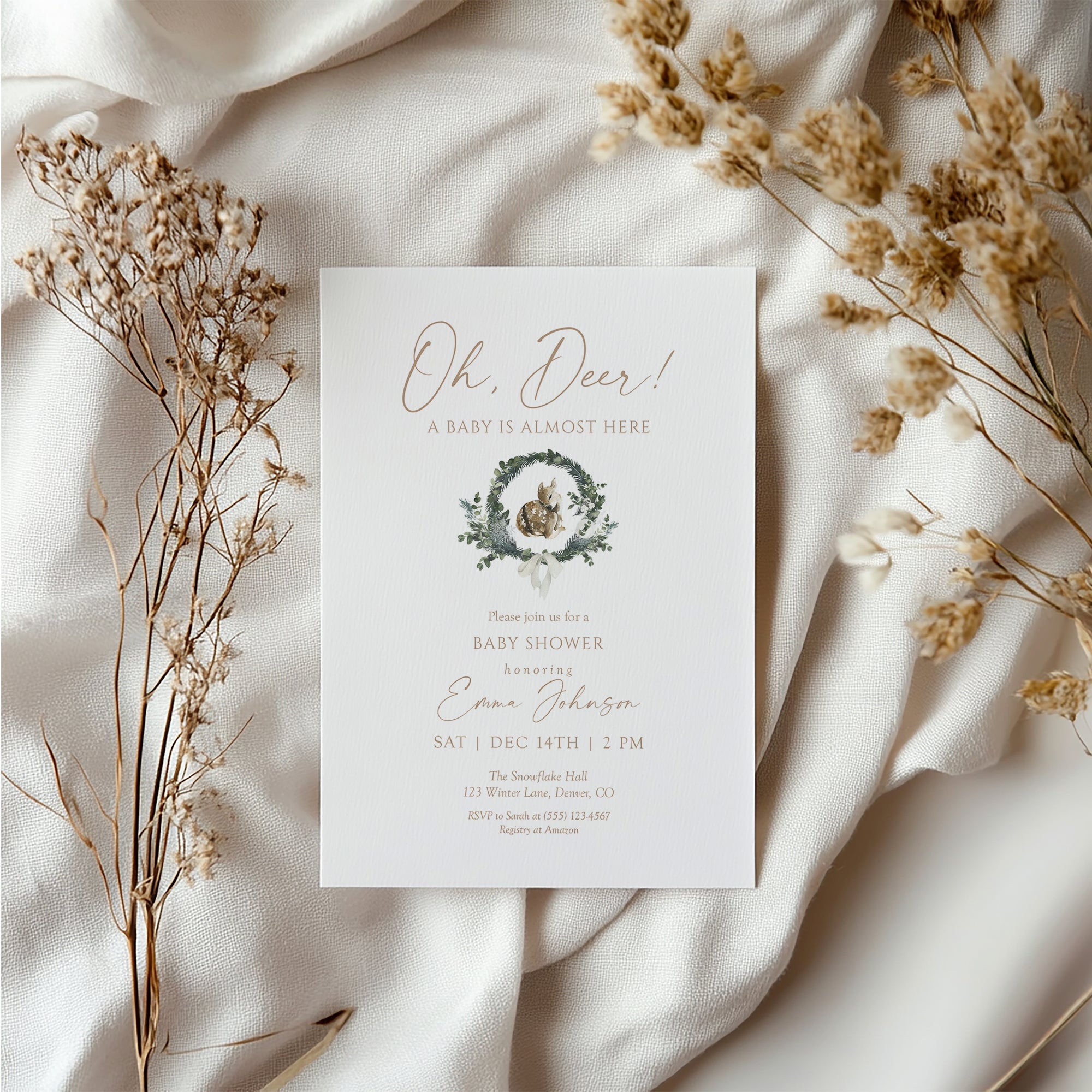 Celebrate a little one on the way with this charming “Oh Deer” baby shower invitation. Featuring a watercolor fawn inside a winter greenery wreath, this woodland-themed design is perfect for rustic, neutral, or winter baby showers. Edit and print at home or with your favorite print shop for an unforgettable celebration.