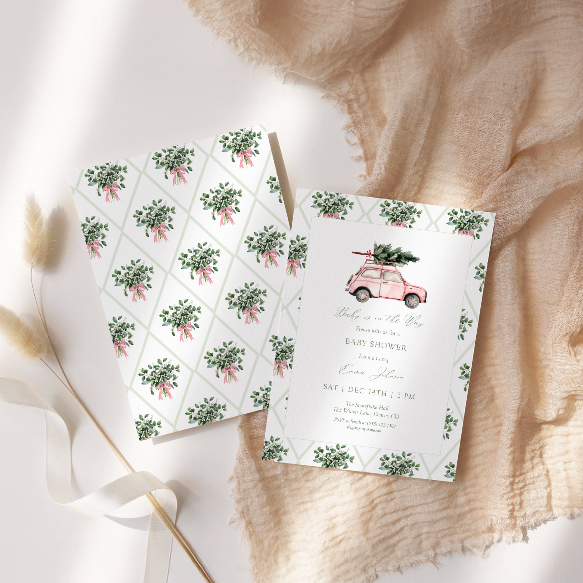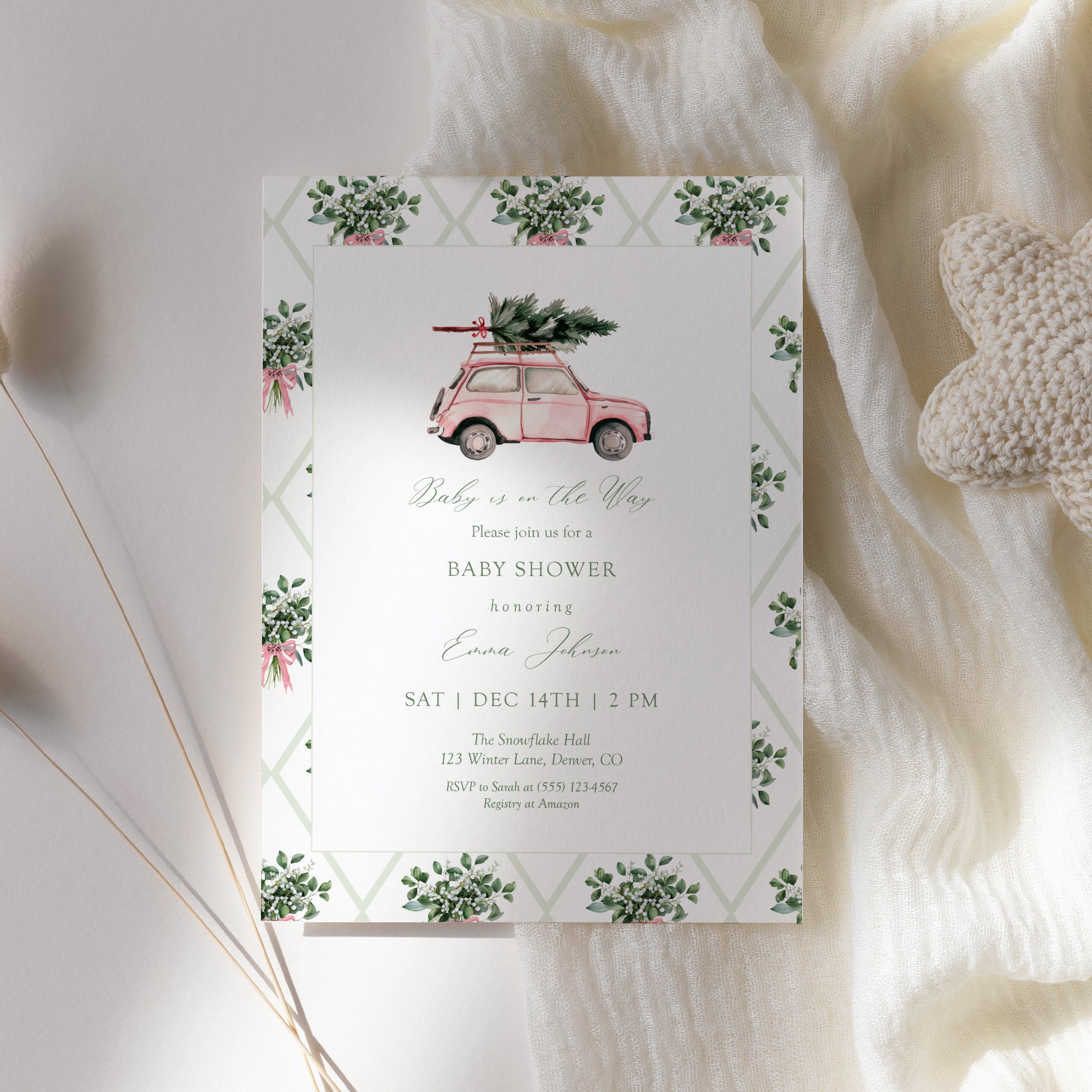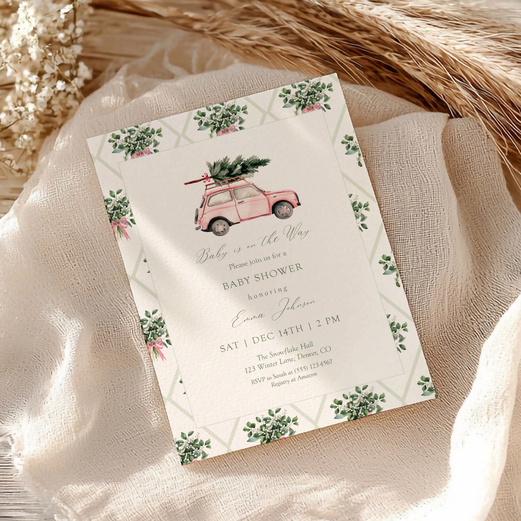 Celebrate your little one on the way with this charming pink car baby shower invitation. Featuring a vintage watercolor car carrying a Christmas tree, this festive design is perfect for a winter or holiday-themed baby shower. The pastel greenery and ribbon details add a sweet seasonal touch. Easily customize with your details and print at home or through your favorite print service.