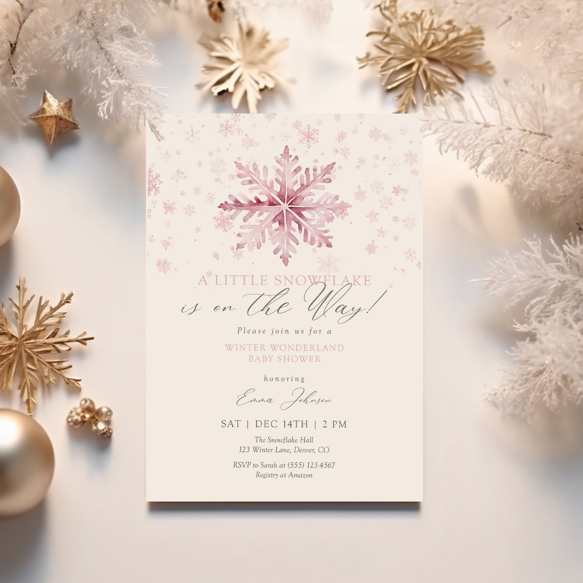 2024 pink little snowflake is on the way winter wonderland invitation template