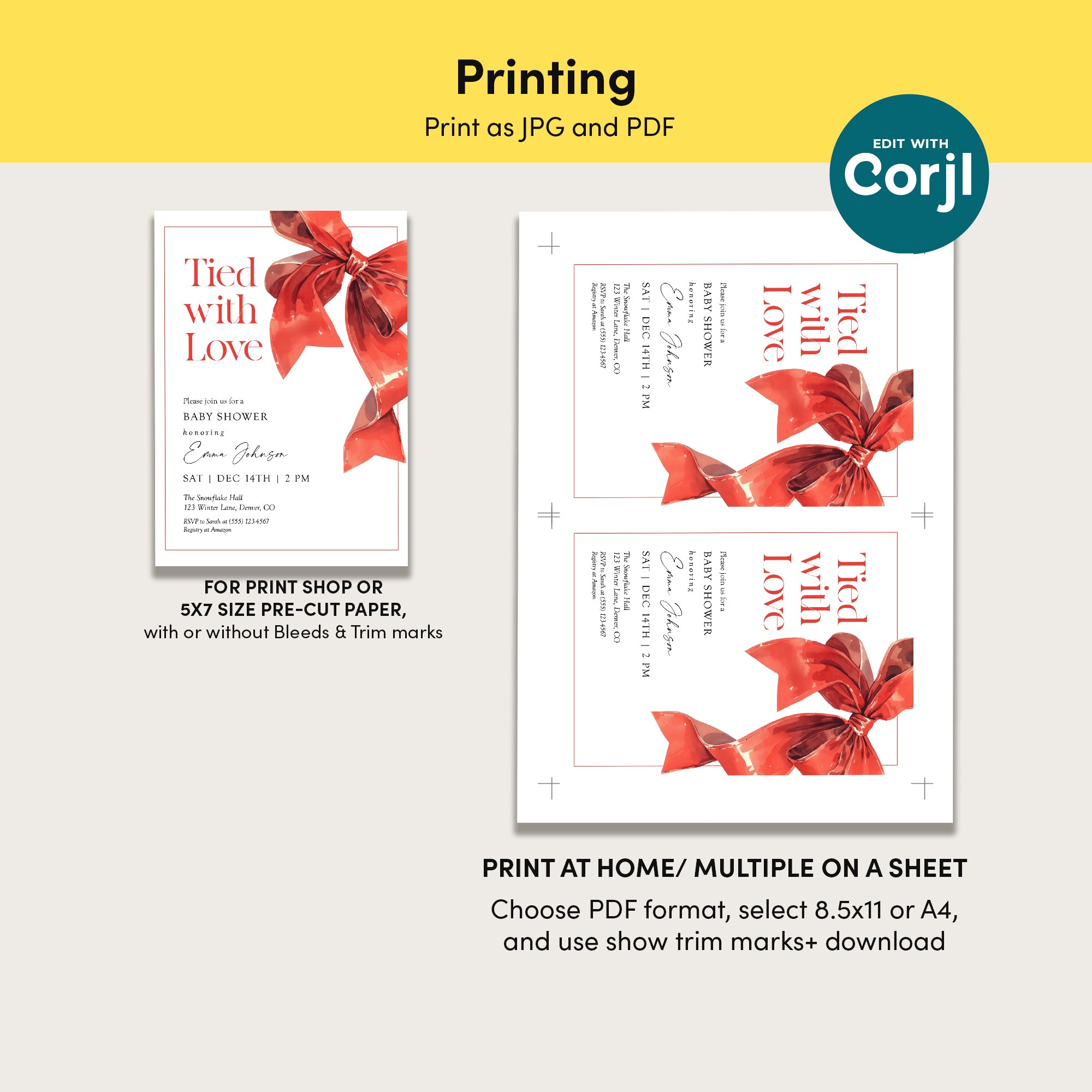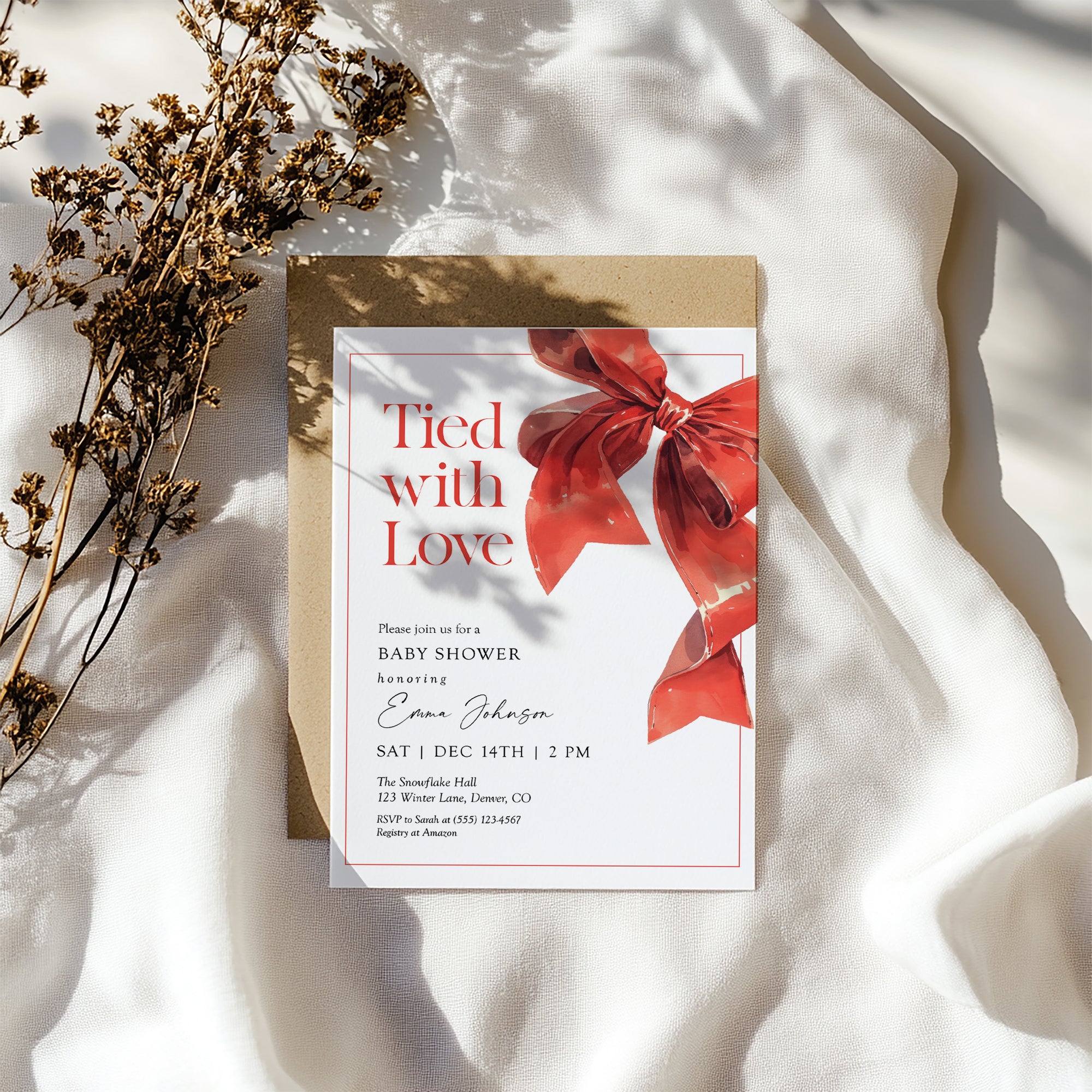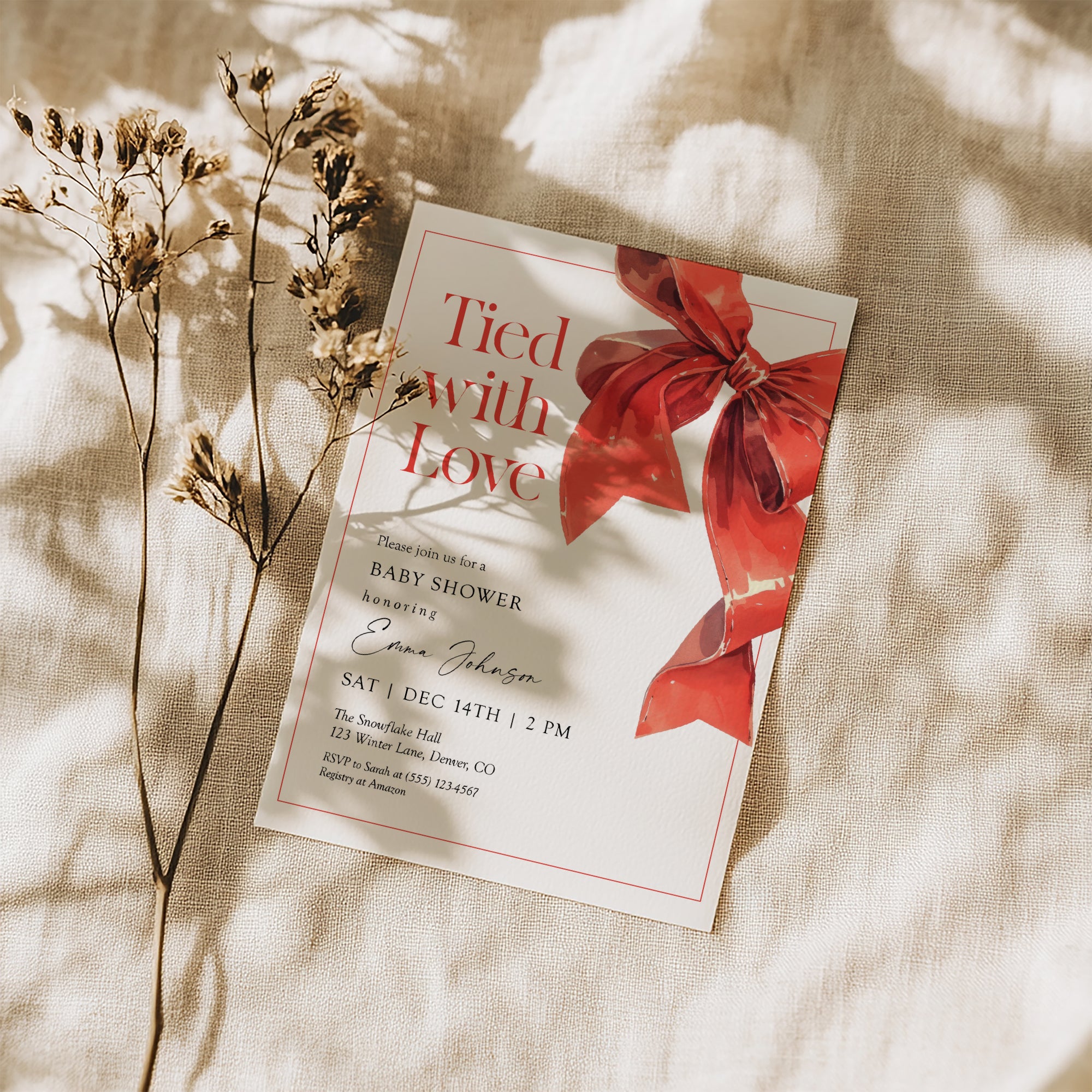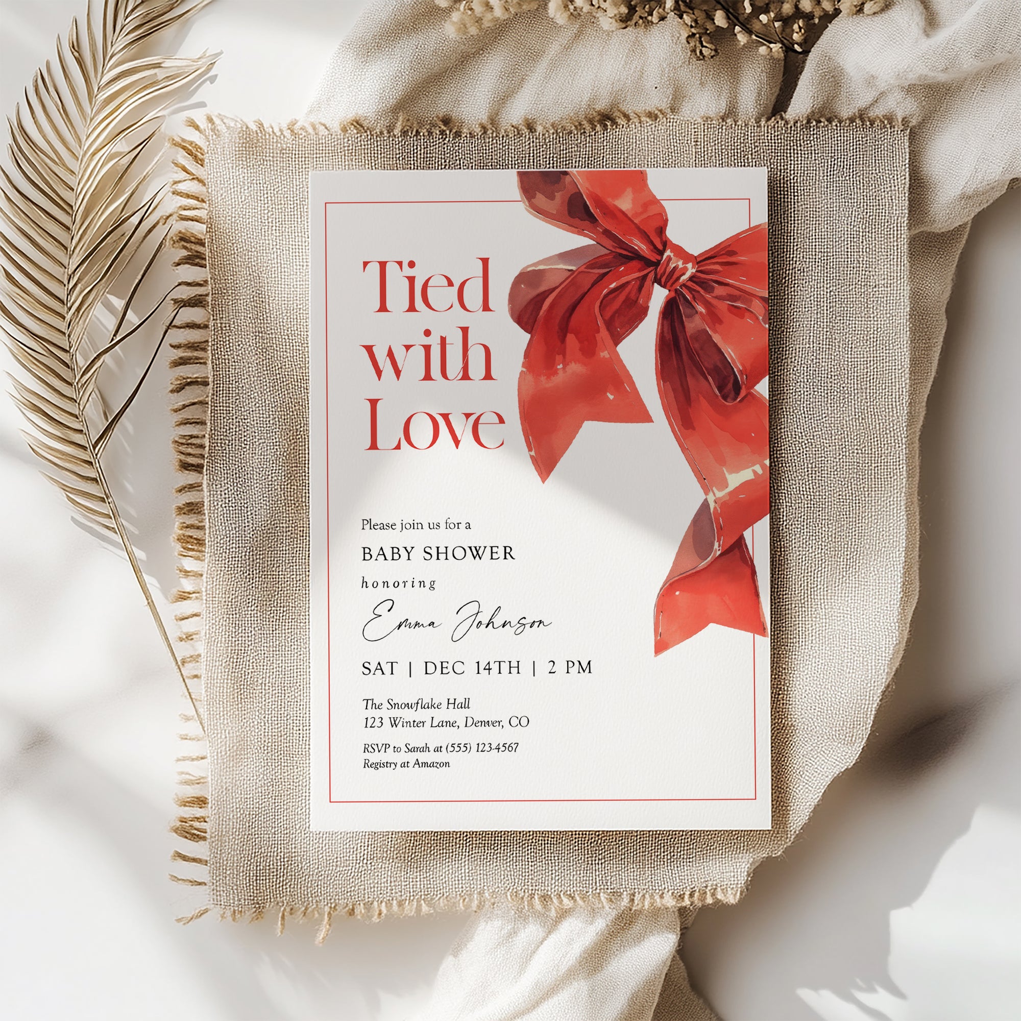 Celebrate your baby shower with festive style using this red bow “Tied with Love” invitation. Perfect for holiday or Christmas baby showers, this elegant and modern design is easy to edit and print. A beautiful choice for winter celebrations.