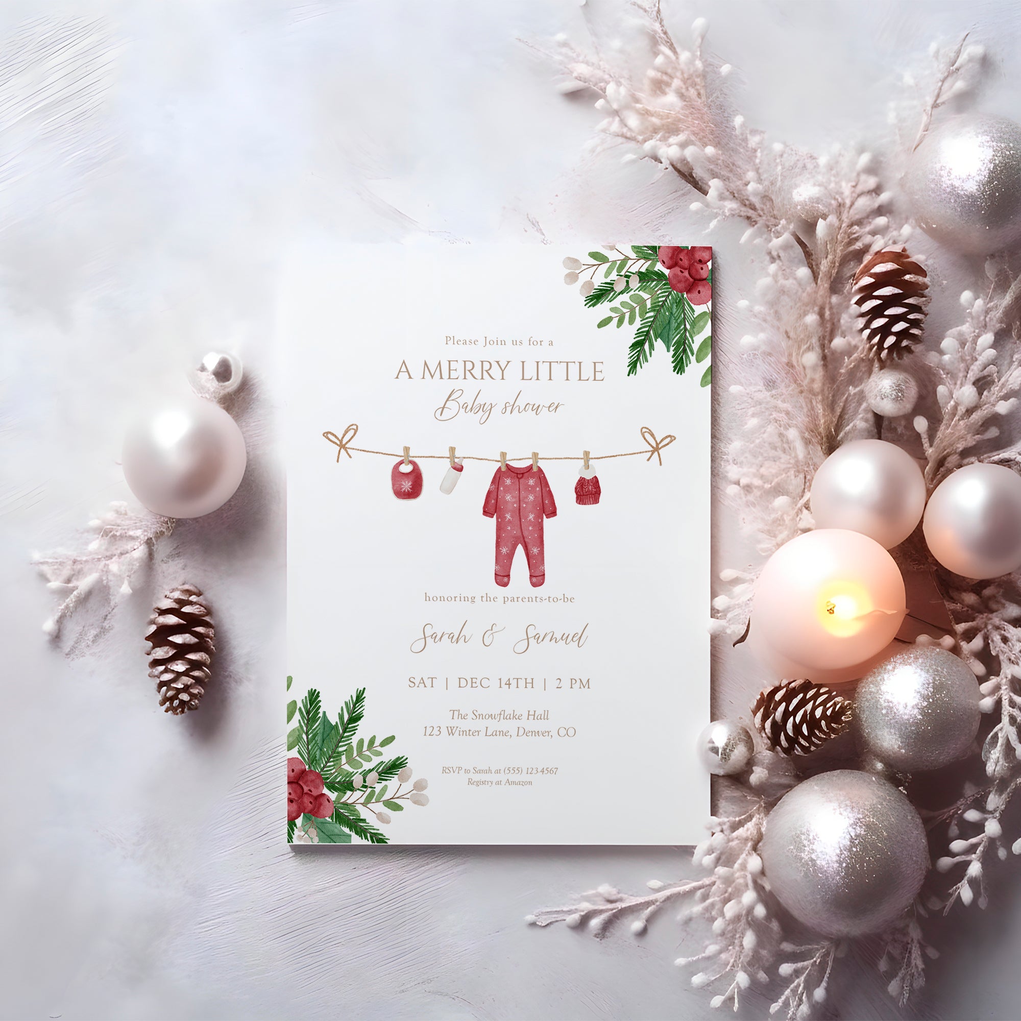 Celebrate your little one with our charming A Merry Little Baby Shower invitation! Perfect for a holiday baby shower, this editable template features a delightful winter theme with a sweet baby suite hanging design. Customize it easily to match your style and needs! Invite friends and family to join the festivities in celebration of your new bundle of joy. Make your holiday baby shower memorable with this unique and festive invitation! Download, edit, and print today!