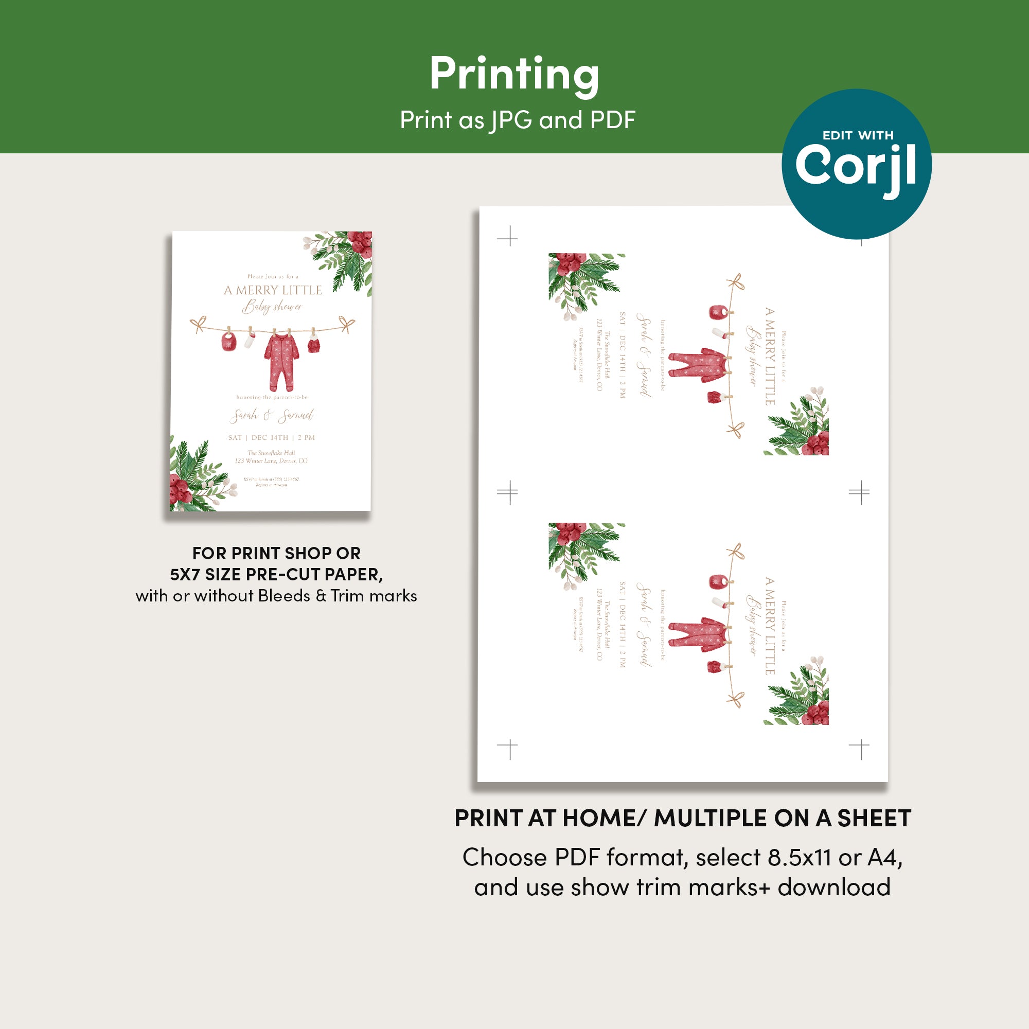 | Instructions | 1. After purchasing, check your email for a link to access your template (sent to your account email). If you can’t find it, log in at corjl.com with your order transaction number. 2. Make changes to the template and save. 3. Download your file in PDF or JPG format. Options include adding a bleed and saving paper. 4. Print on heavy matte white cardstock. You can print at home or use a professional print shop. |