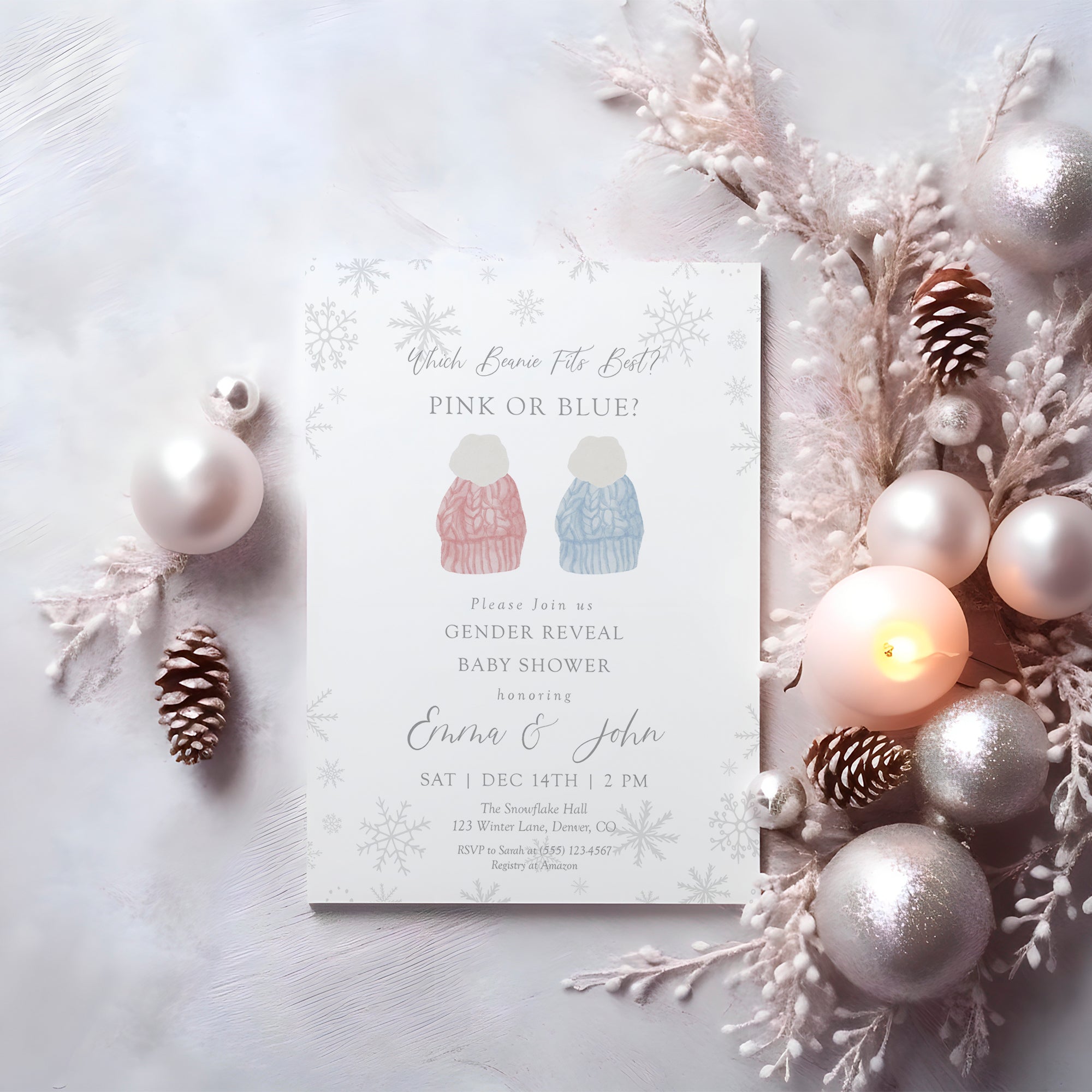 Celebrate your little one with our adorable Winter Pink Blue Beanie Gender Reveal Invitation! Perfect for a Holiday Baby Shower, this festive design features a cozy He or She Sweater Theme that captures the magic of the season. Easily customizable and printable, our Christmas Baby Shower Invite is a unique way to share your joy with friends and family. Make your winter celebration unforgettable with this charming invitation that sets the tone for an enchanting gathering!