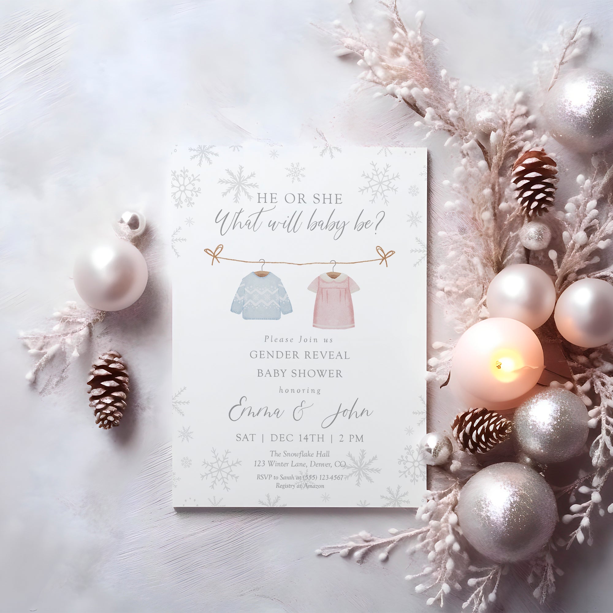 Celebrate your little one with our adorable Winter Gender Reveal Invitation! Perfect for a Holiday Baby Shower, this festive design features a cozy He or She Sweater Theme that captures the magic of the season. Easily customizable and printable, our Christmas Baby Shower Invite is a unique way to share your joy with friends and family. Make your winter celebration unforgettable with this charming invitation that sets the tone for an enchanting gathering!