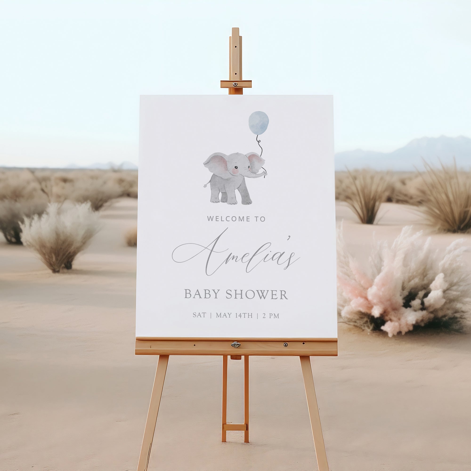 Welcome your little one with our adorable Blue Elephant Holding Blue Balloon watercolor hand-drawn art! This cute and minimal baby shower welcome sign template is perfect for celebrating your baby boy. Easy to use as a digital download, you can print and display it at your baby shower for a charming touch. Make your event memorable with this delightful design that captures the joy of welcoming a new life. Download today and create a beautiful atmosphere for your celebration!