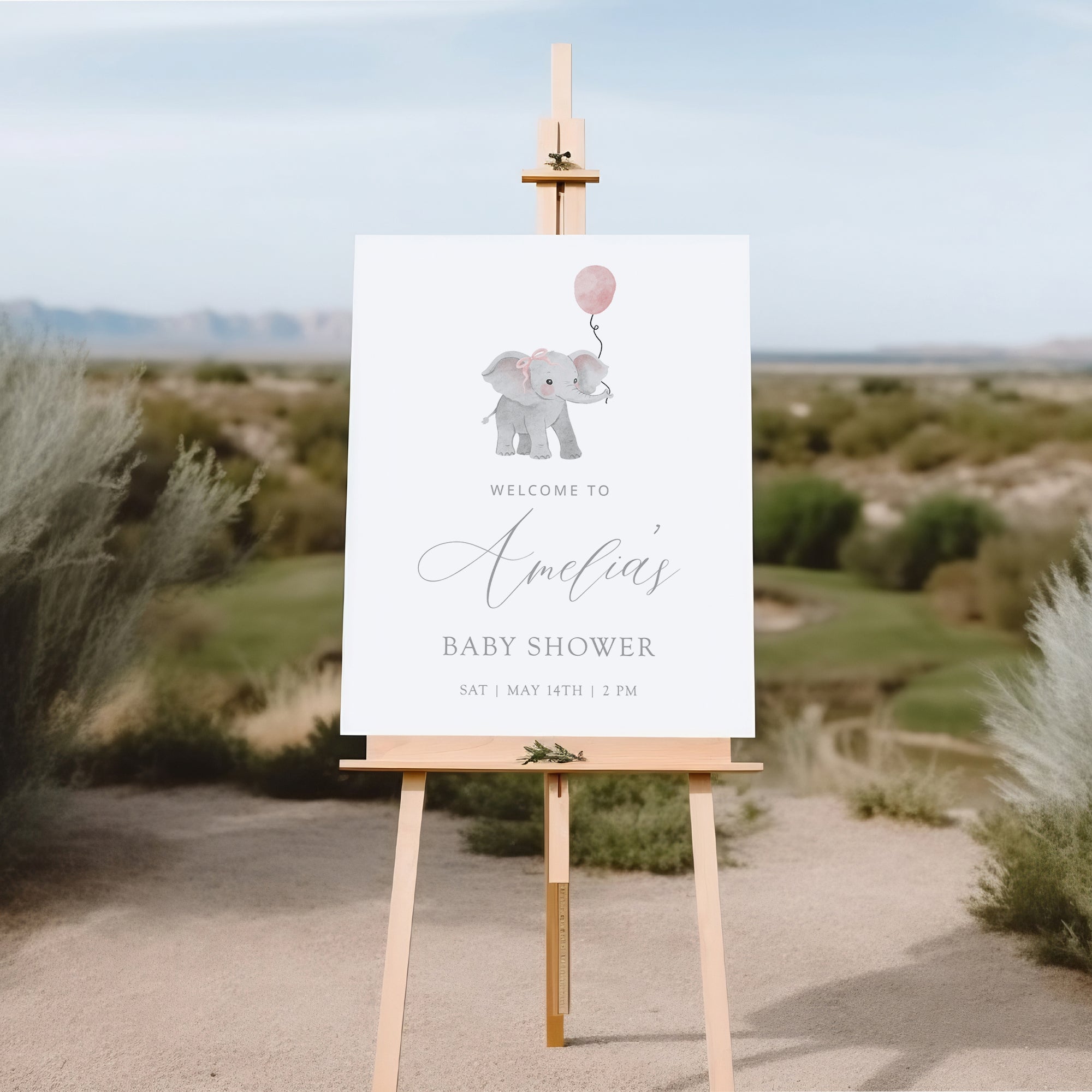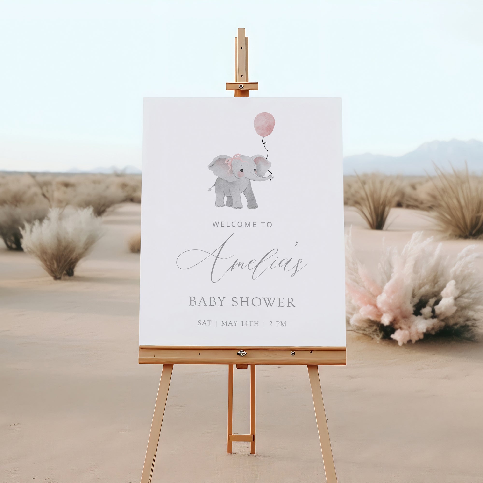 Welcome your little one with our adorable Pink Elephant Holding Pink Balloon watercolor hand-drawn art! This cute and minimal baby shower welcome sign template is perfect for celebrating your baby Girl. Easy to use as a digital download, you can print and display it at your baby shower for a charming touch. Make your event memorable with this delightful design that captures the joy of welcoming a new life. Download today and create a beautiful atmosphere for your celebration!
