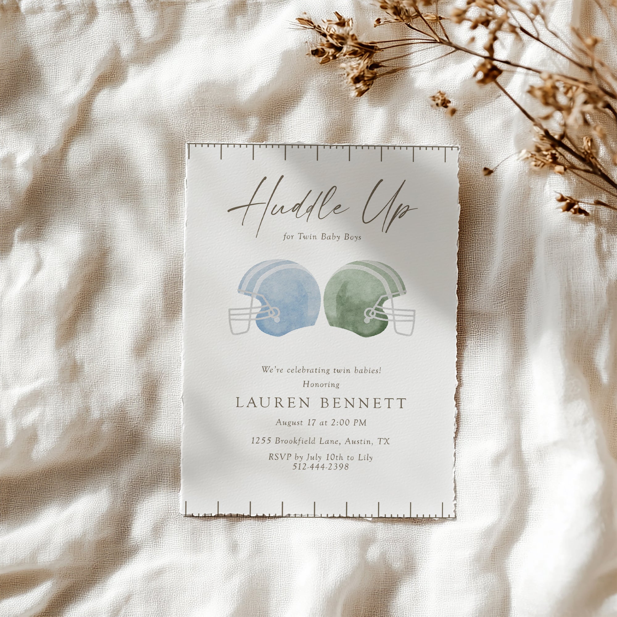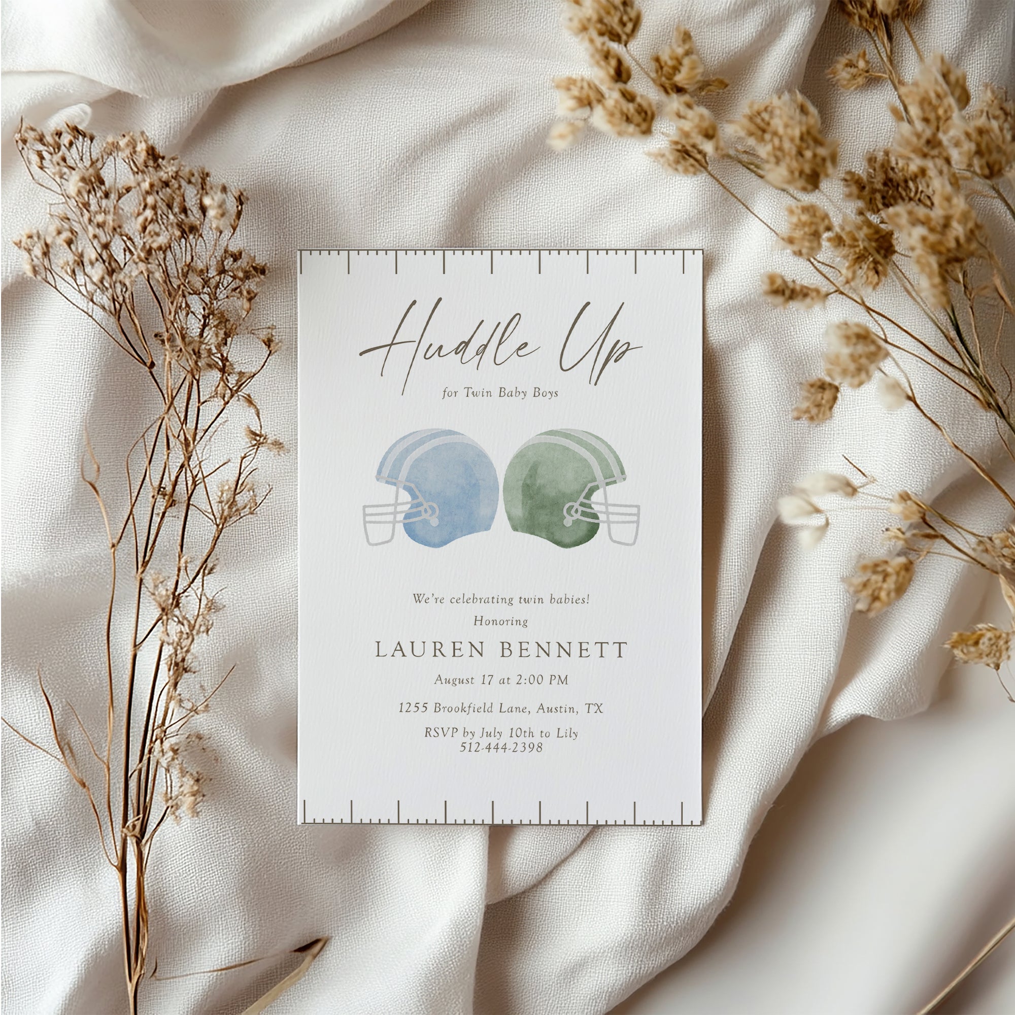 Get ready to celebrate with our adorable Huddle Up Football Baby Twins Shower Invite! Perfect for a sports-themed twins shower party, this editable template allows you to customize your invitation effortlessly. As a digital download, you can print it at home or share it online for a fun baby reveal or announcement. Create the perfect atmosphere for your special day with this unique and charming invite. Score big with your guests by choosing this delightful design!