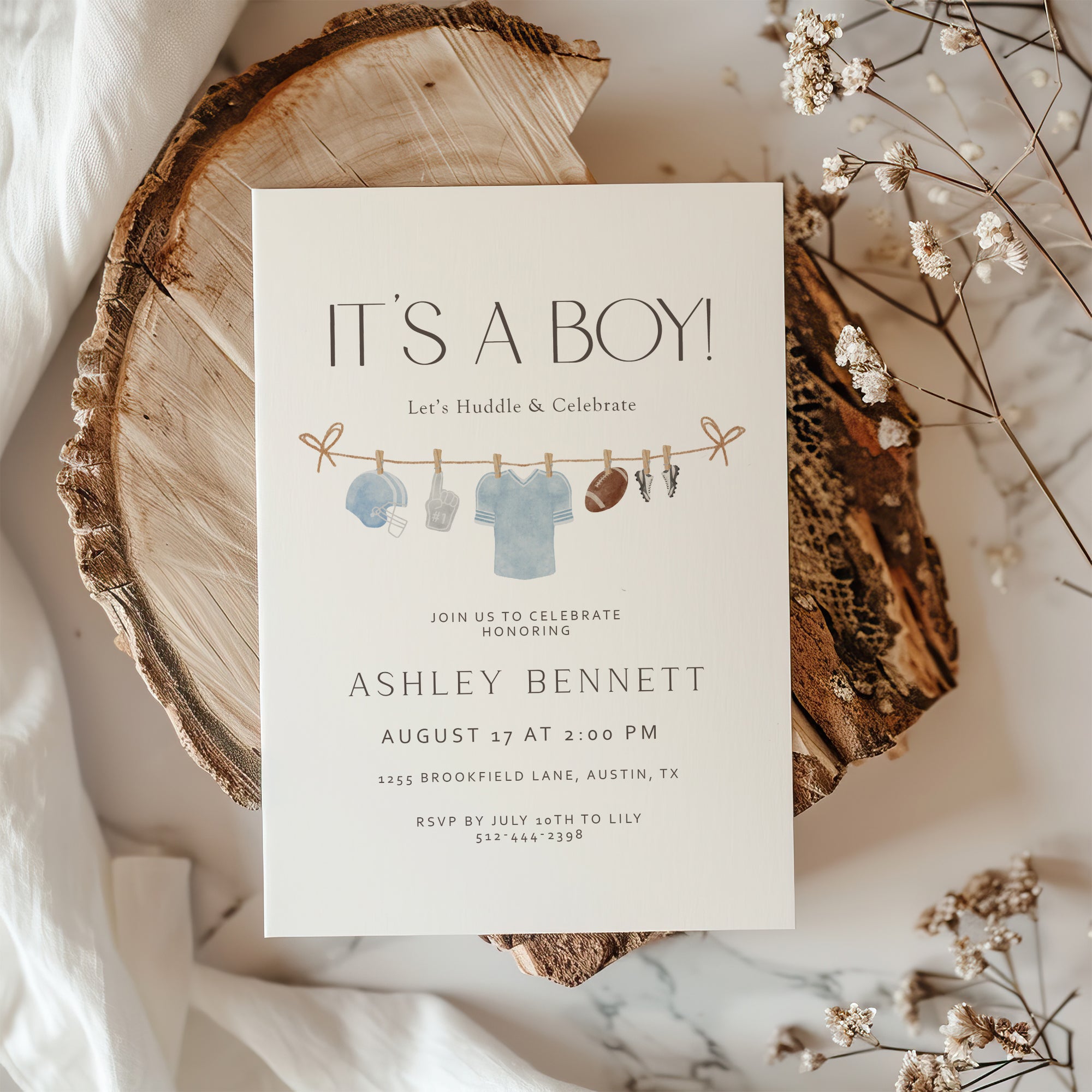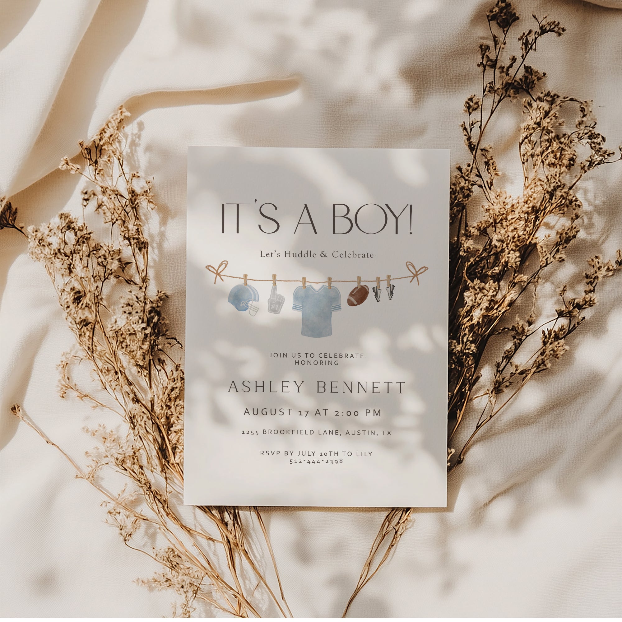 Celebrate your little champion with our It's a Boy American Football Invite! This editable template is perfect for a sporty baby shower party. Instantly download this digital invite and personalize it to fit your celebration. With fun designs and a baby clothes line theme, it’s sure to score big with your guests. Simply edit, print, and send out to friends and family. Make your event unforgettable with this unique football invite! Get started today!