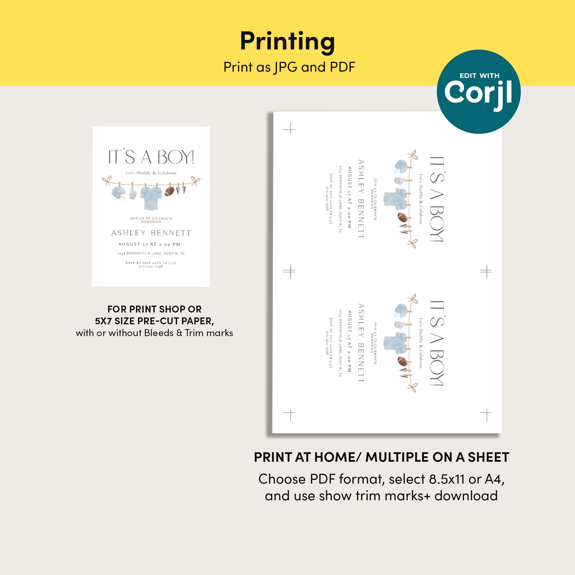 | Instructions | 1. After purchasing, check your email for a link to access your template (sent to your account email). If you can’t find it, log in at corjl.com with your order transaction number. 2. Make changes to the template and save. 3. Download your file in PDF or JPG format. Options include adding a bleed and saving paper. 4. Print on heavy matte white cardstock. You can print at home or use a professional print shop. |