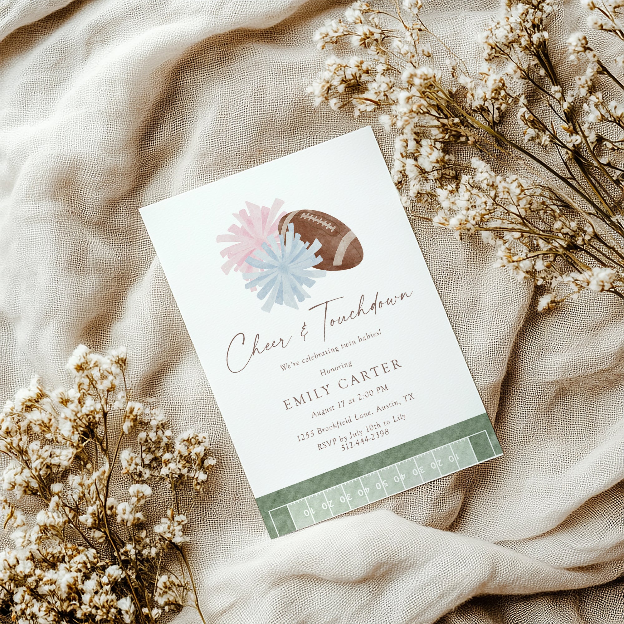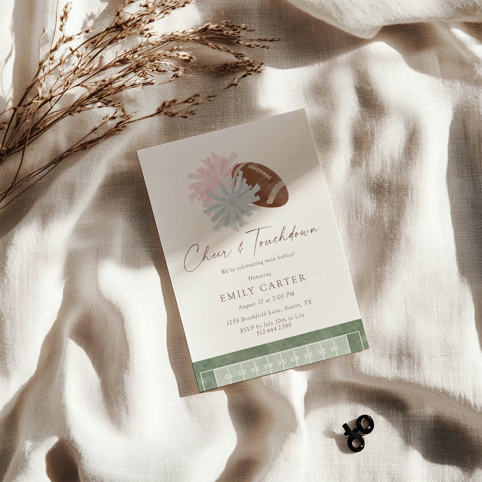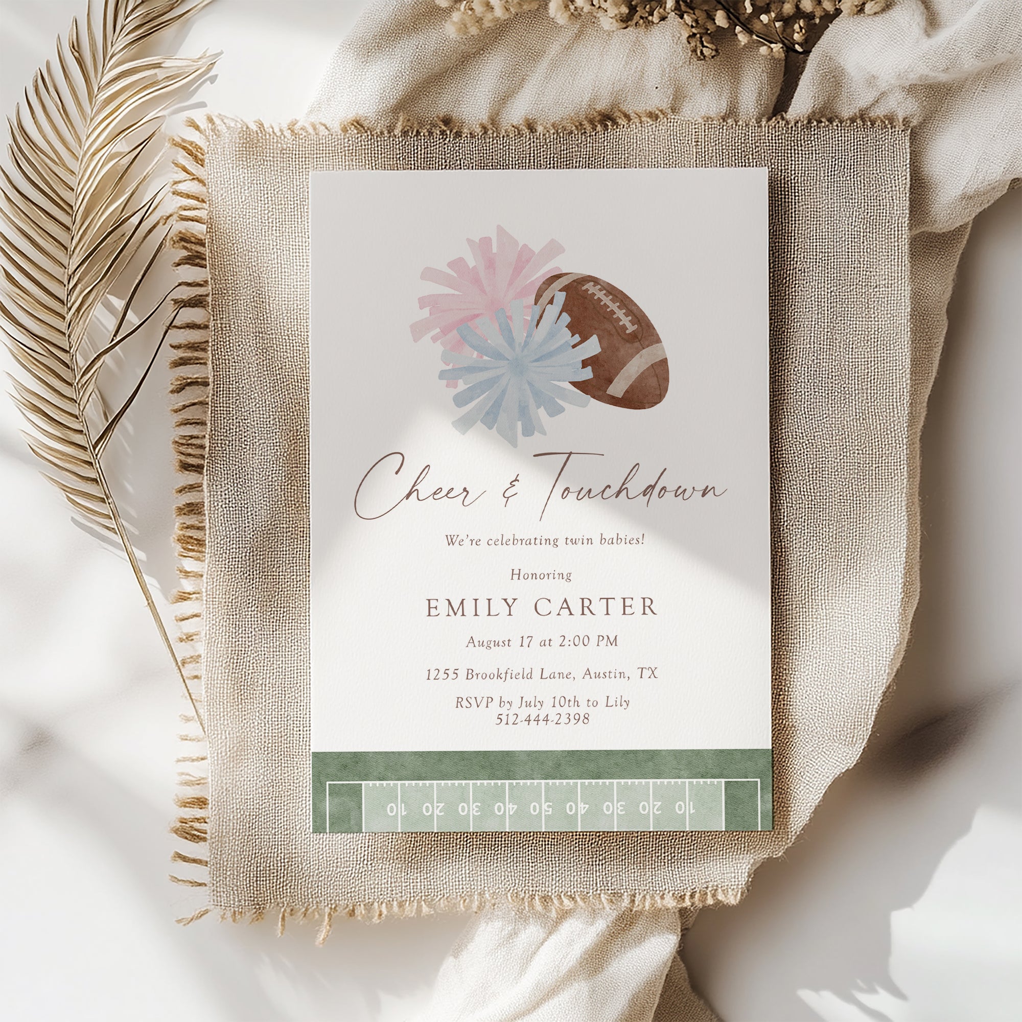 Celebrate your little MVPs with our Cheer & Touchdown Football Baby Shower Invite! This editable template makes planning your sports-themed twins shower party a breeze. Perfect for gender reveal invites, you can customize it to fit your style! Simply download the digital file and print at home or share online. Score big with your guests and make your event unforgettable. Grab yours now and kick off the festivities in style!