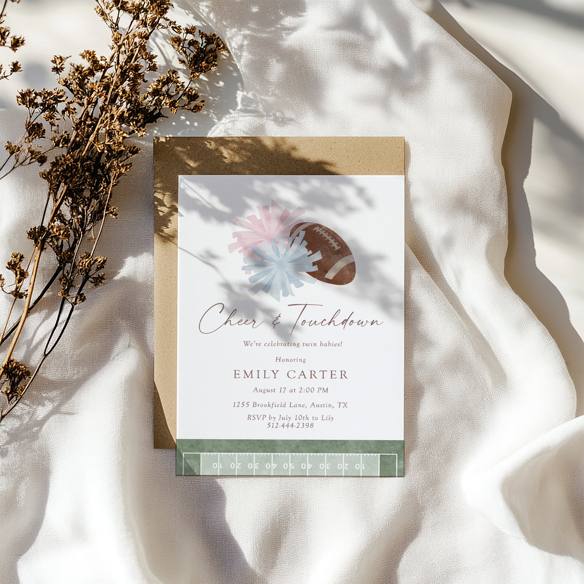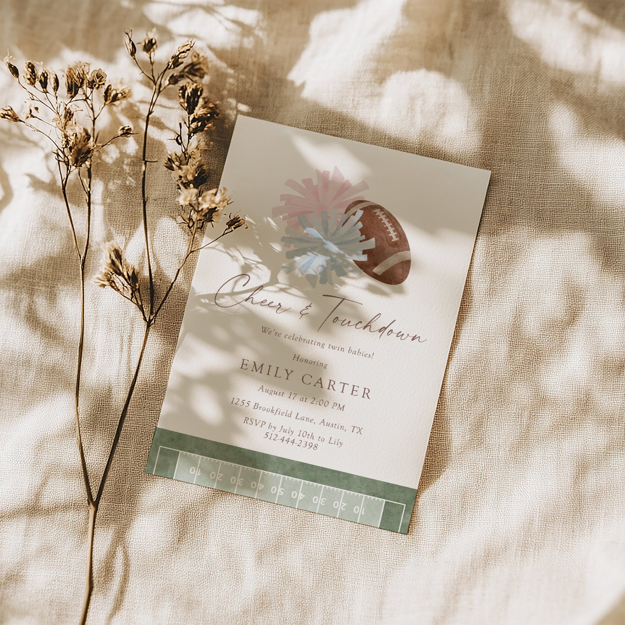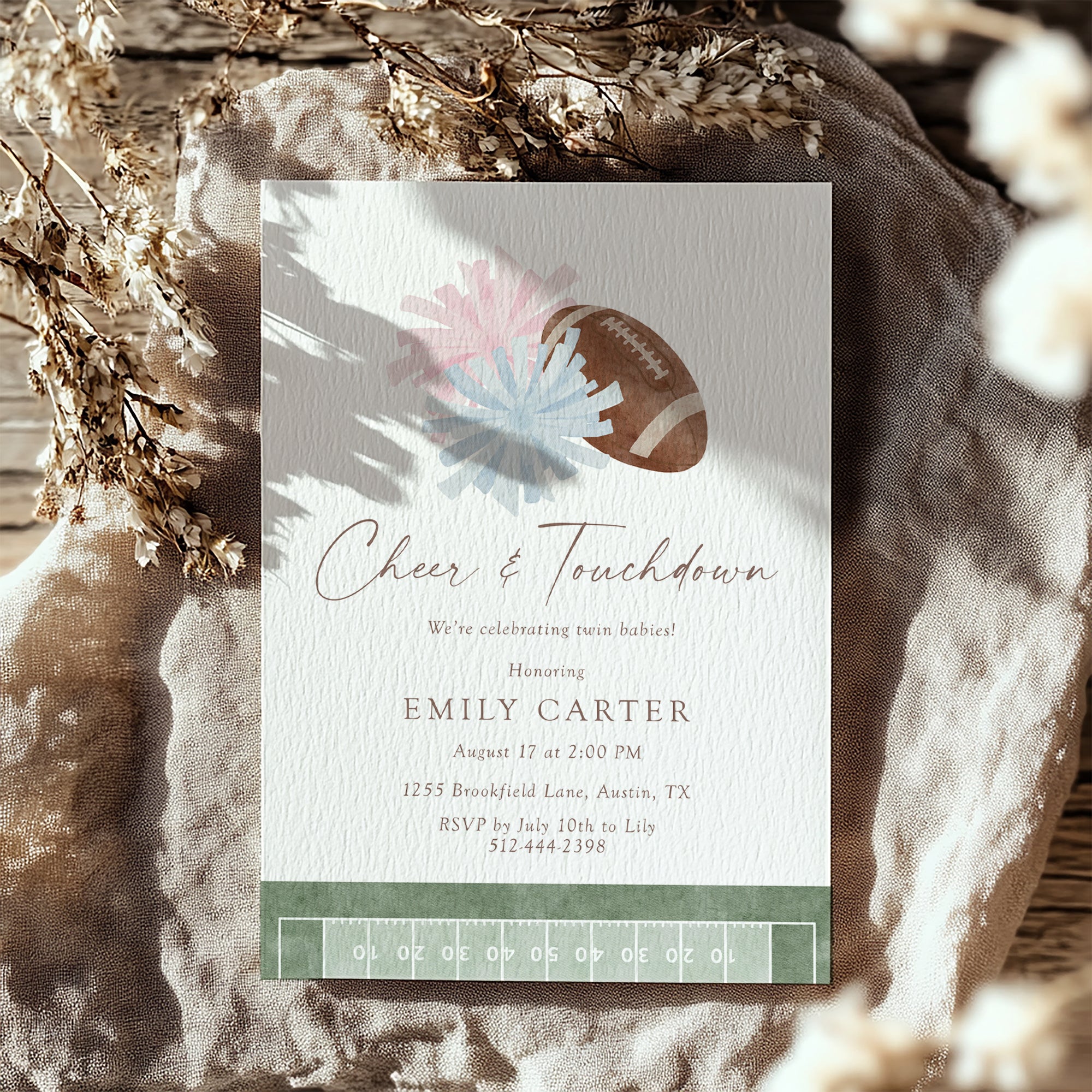 Celebrate your little MVPs with our Cheer & Touchdown Football Baby Shower Invite! This editable template makes planning your sports-themed twins shower party a breeze. Perfect for gender reveal invites, you can customize it to fit your style! Simply download the digital file and print at home or share online. Score big with your guests and make your event unforgettable. Grab yours now and kick off the festivities in style!