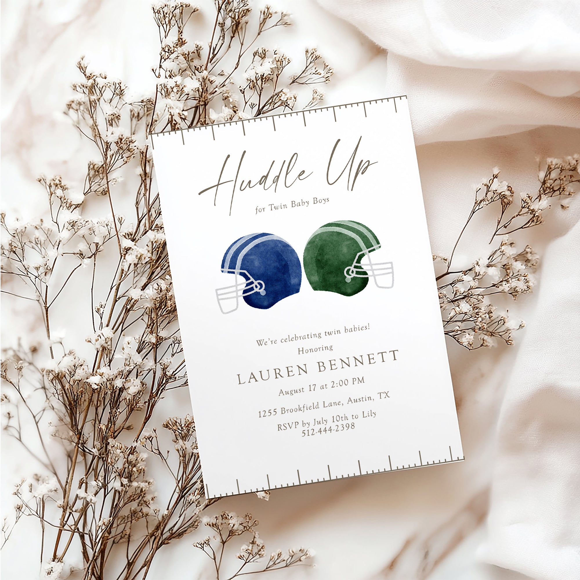 Get ready to celebrate with our adorable Huddle Up Football Baby Twins Shower Invite! Perfect for a sports-themed twins shower party, this editable template allows you to customize your invitation effortlessly. As a digital download, you can print it at home or share it online for a fun baby reveal or announcement. Create the perfect atmosphere for your special day with this unique and charming invite. Score big with your guests by choosing this delightful design!