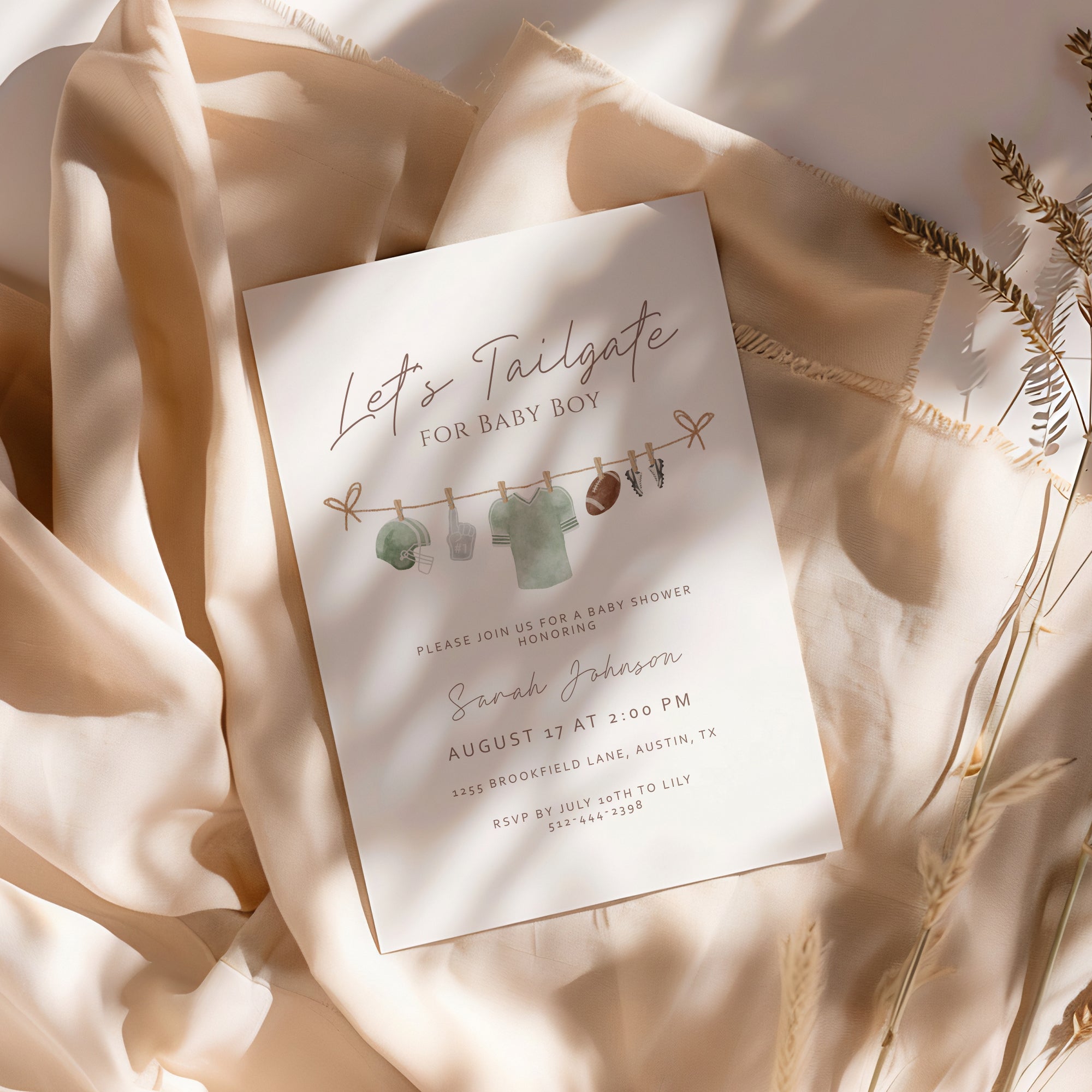 Get ready for the ultimate sports baby shower with our Sage Green Let's Tailgate Football Invite! This editable template allows you to personalize your invitations easily. Perfect for celebrating the newest little MVP, this digital download means you can create stunning invites from the comfort of your home. Whether it’s a baby clothes line theme or a football fanatic gathering, make your party unforgettable with this charming invite. Download, edit, and print in minutes – let the games begin!
