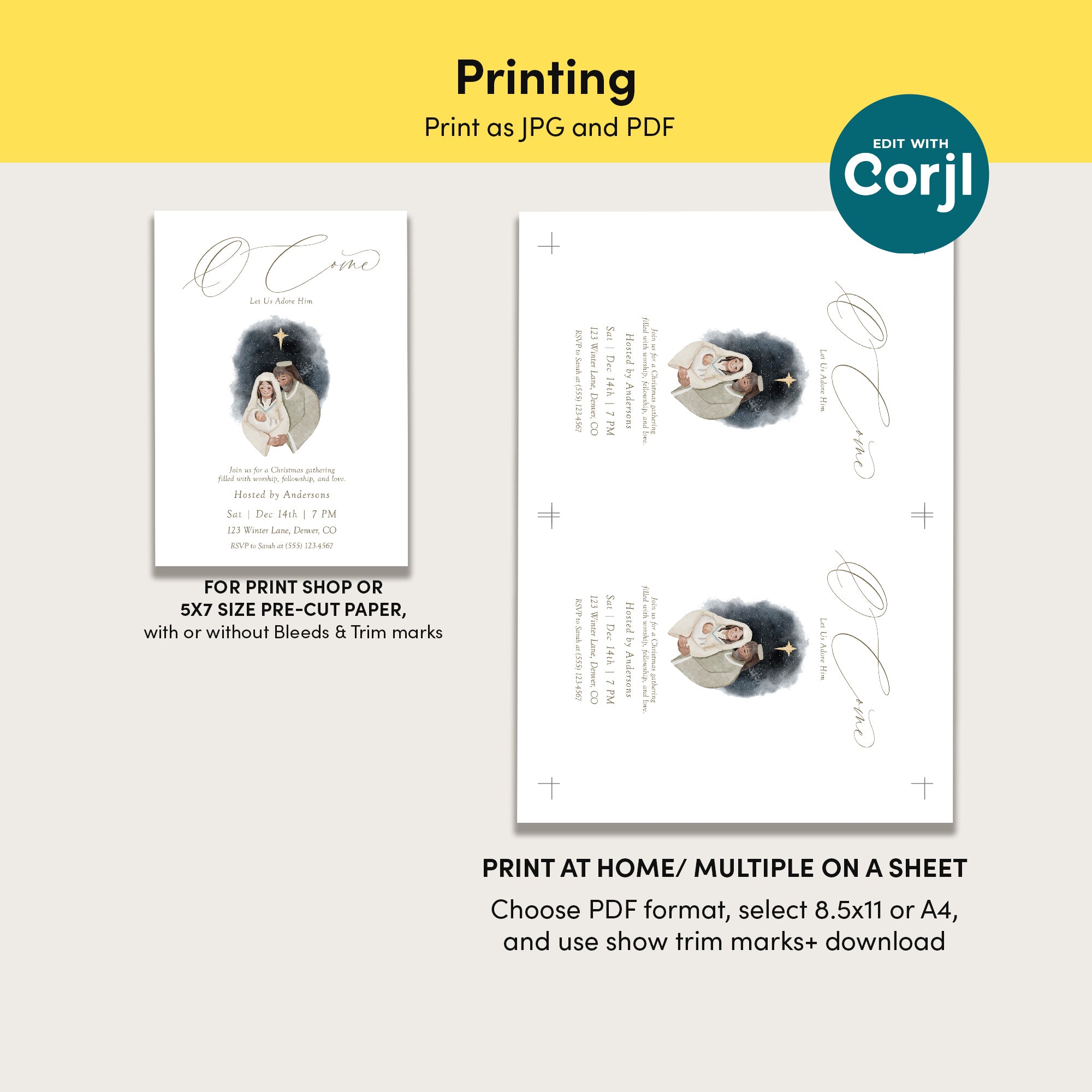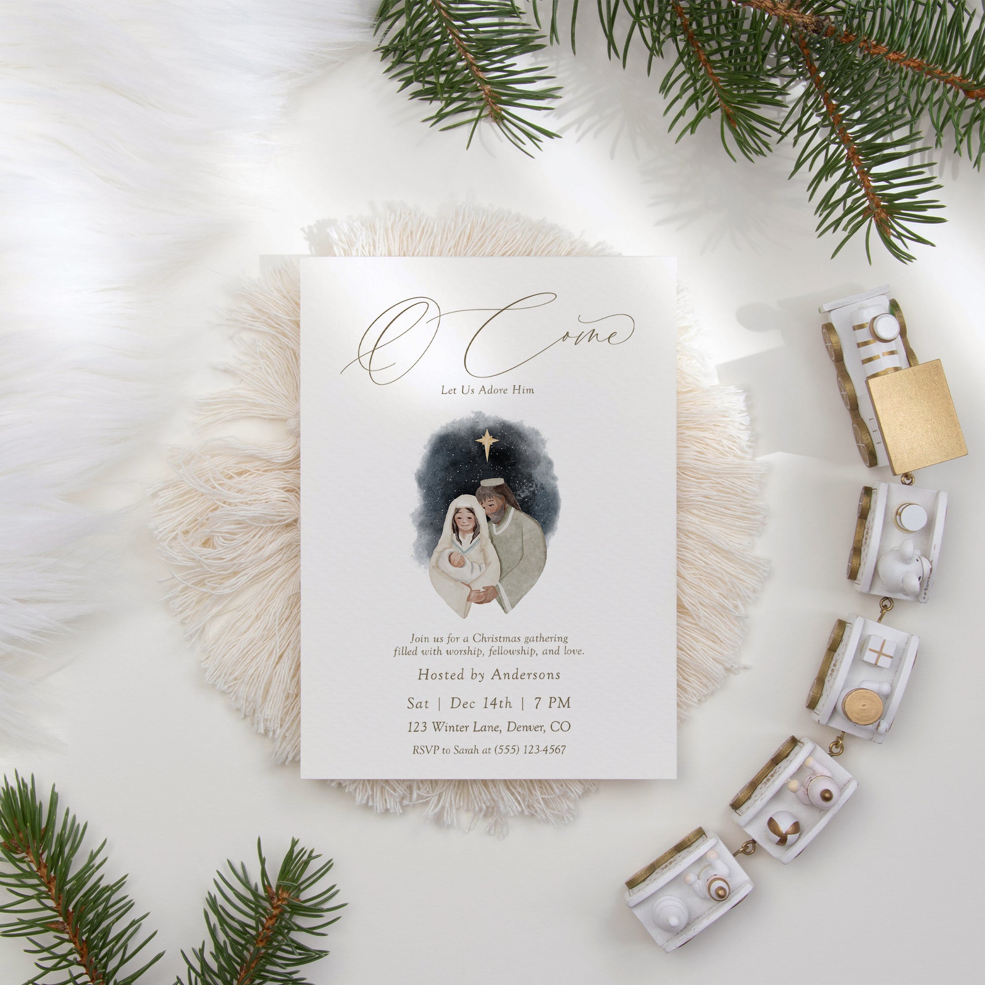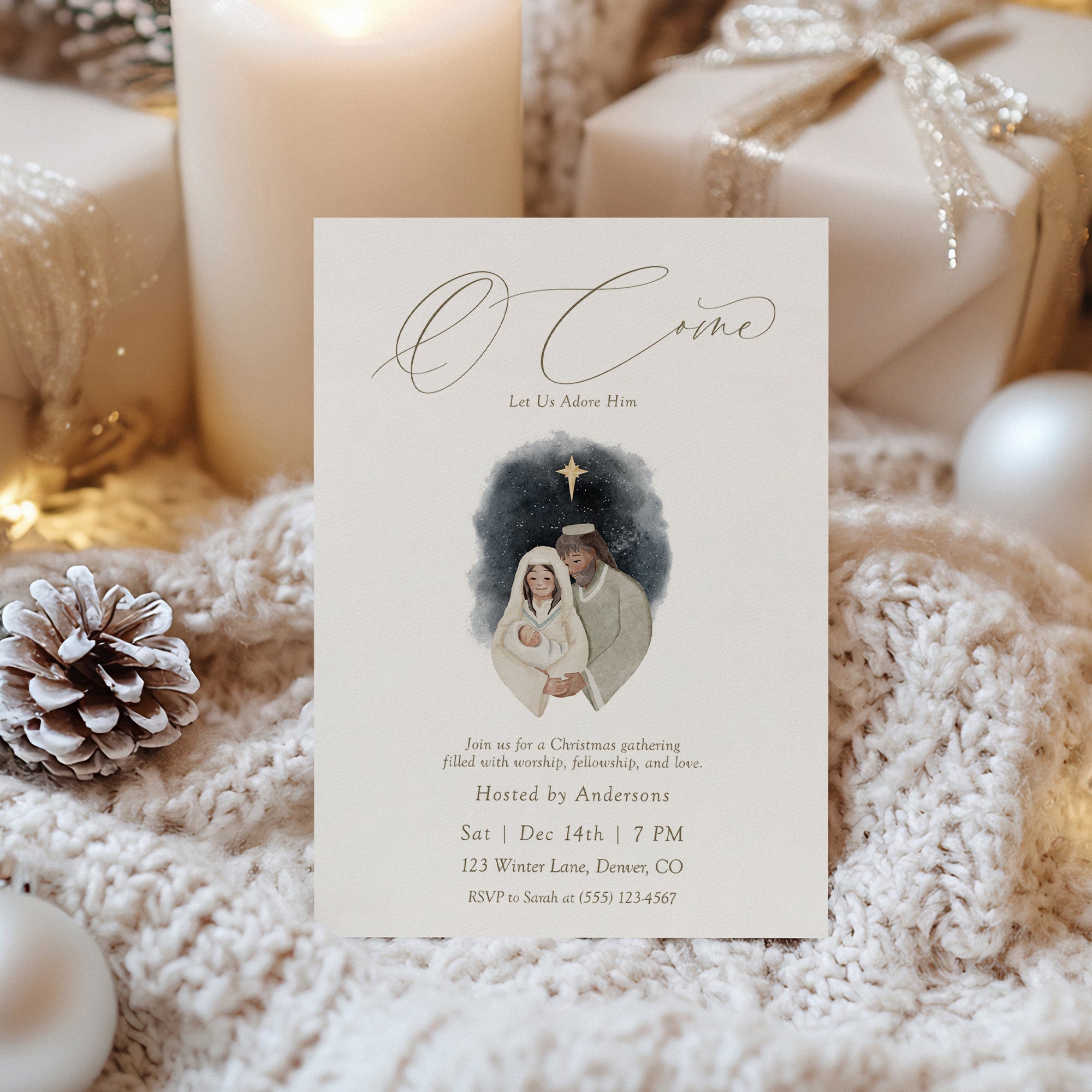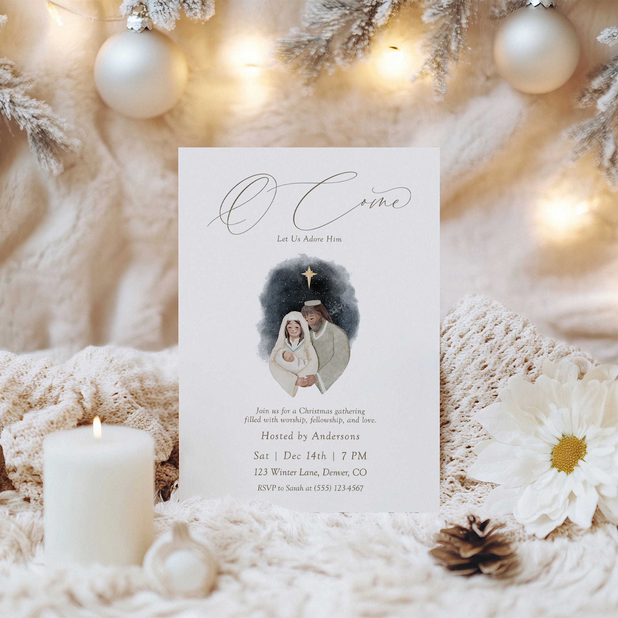 Celebrate the true meaning of Christmas with our Nativity Scene Christian Christmas Party Invite! This beautifully designed digital download features the heartfelt message O come let us adore him. Perfect for inviting friends and family to your festive gathering, this editable template allows for personalized touches to make it uniquely yours. Easily customize it to fit your celebration's specifics. Download, edit, and print — spread the joy of the season with this religious invite!