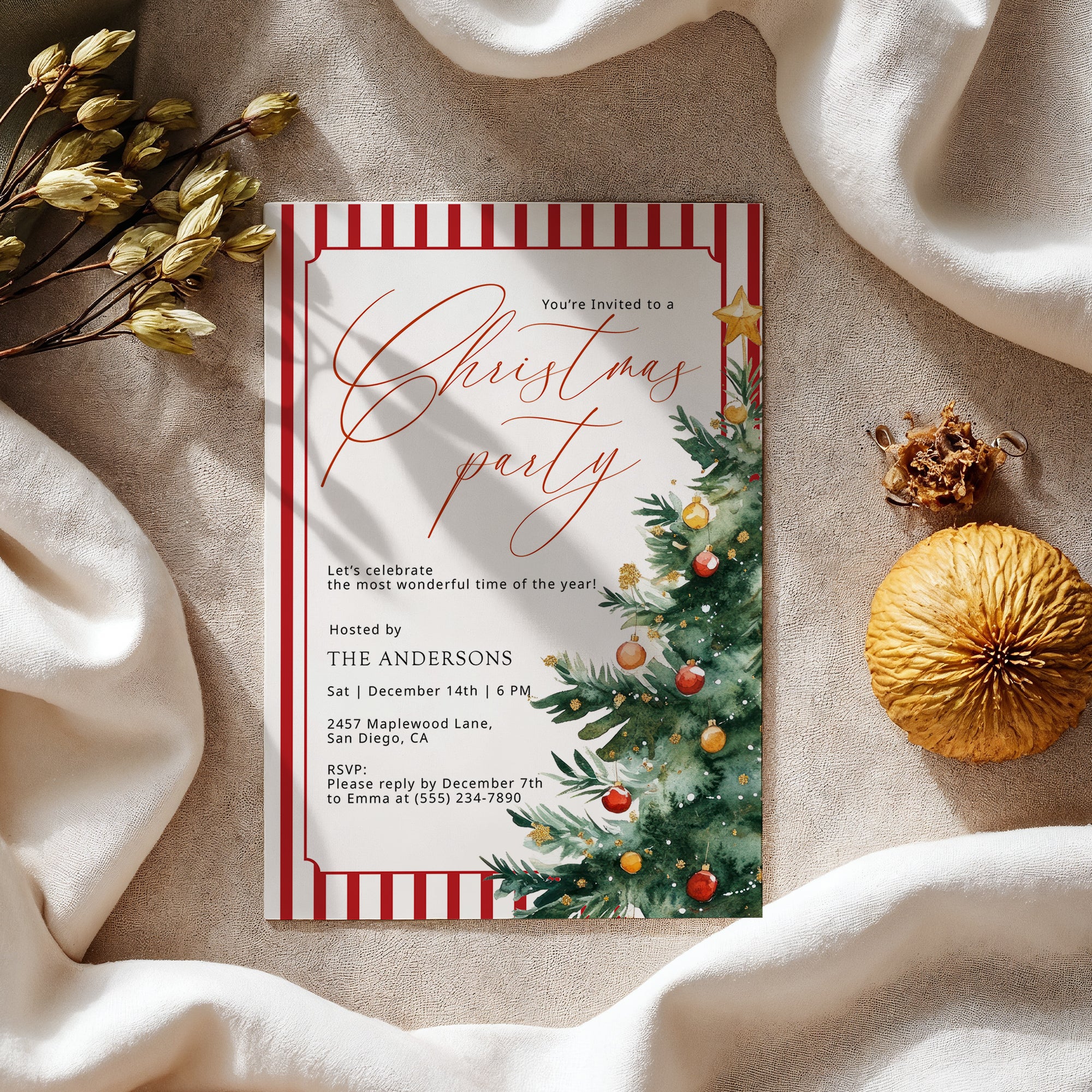 Elevate your holiday celebrations with our elegant minimal modern Christmas tree winter holiday dinner party invitation! This digital download features a beautiful ornament design with classic red decor, perfect for inviting your loved ones to a festive gathering. Customize easily with our editable template, allowing you to add your personal touch. Perfect for sharing the joy of the season, this invitation will set the tone for a memorable celebration. Download, customize, and spread holiday cheer!