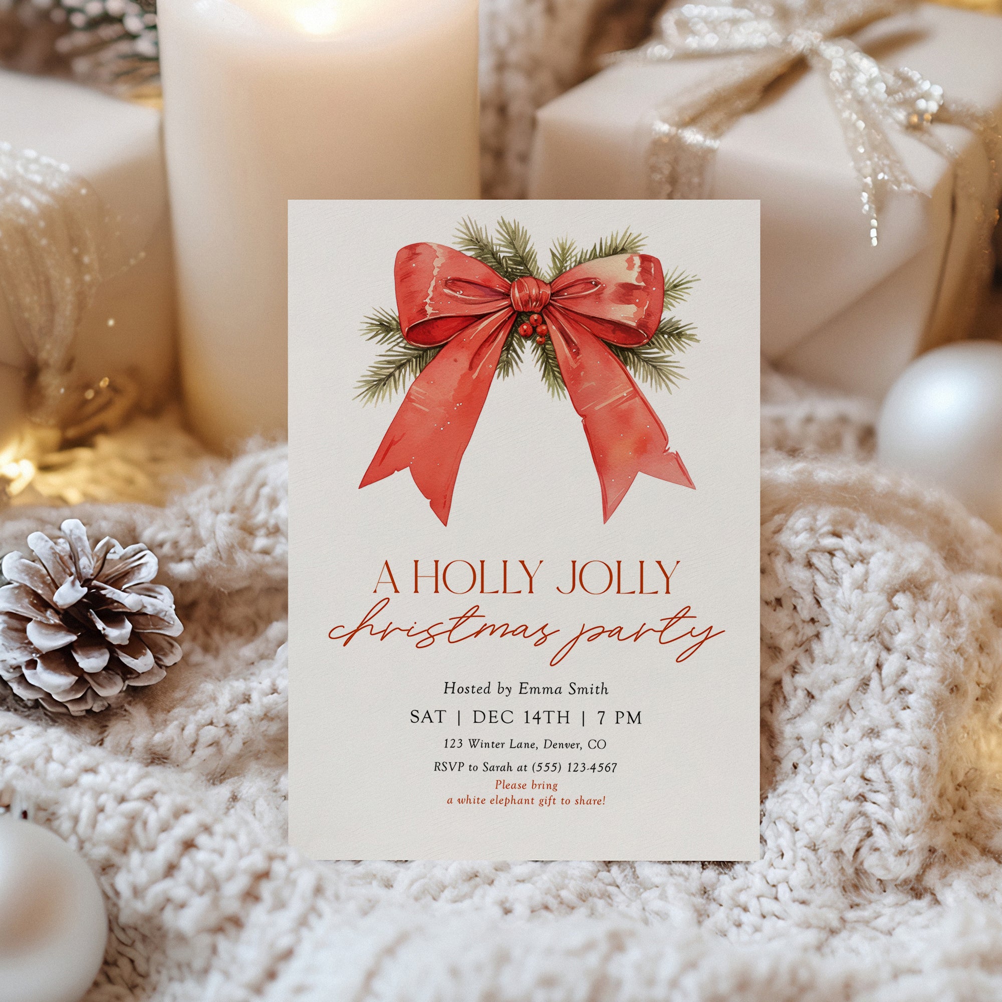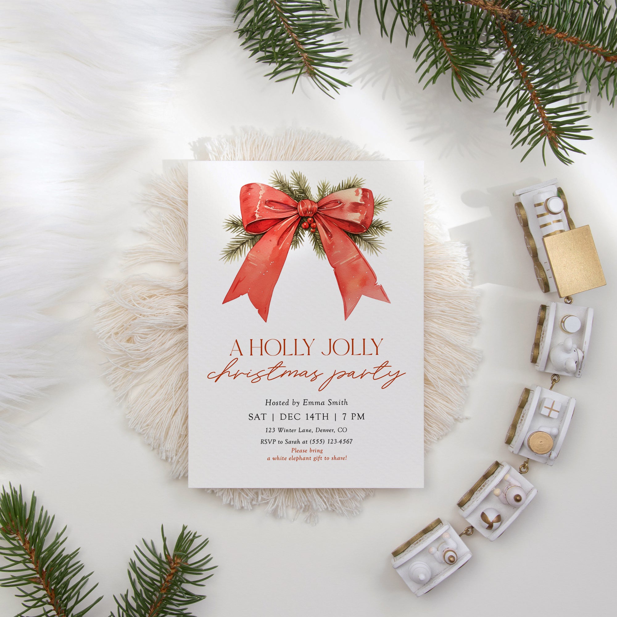 2033 Red Bow Christmas Party Invite, Editable Holiday Gathering Template, Coquette, Digital Download