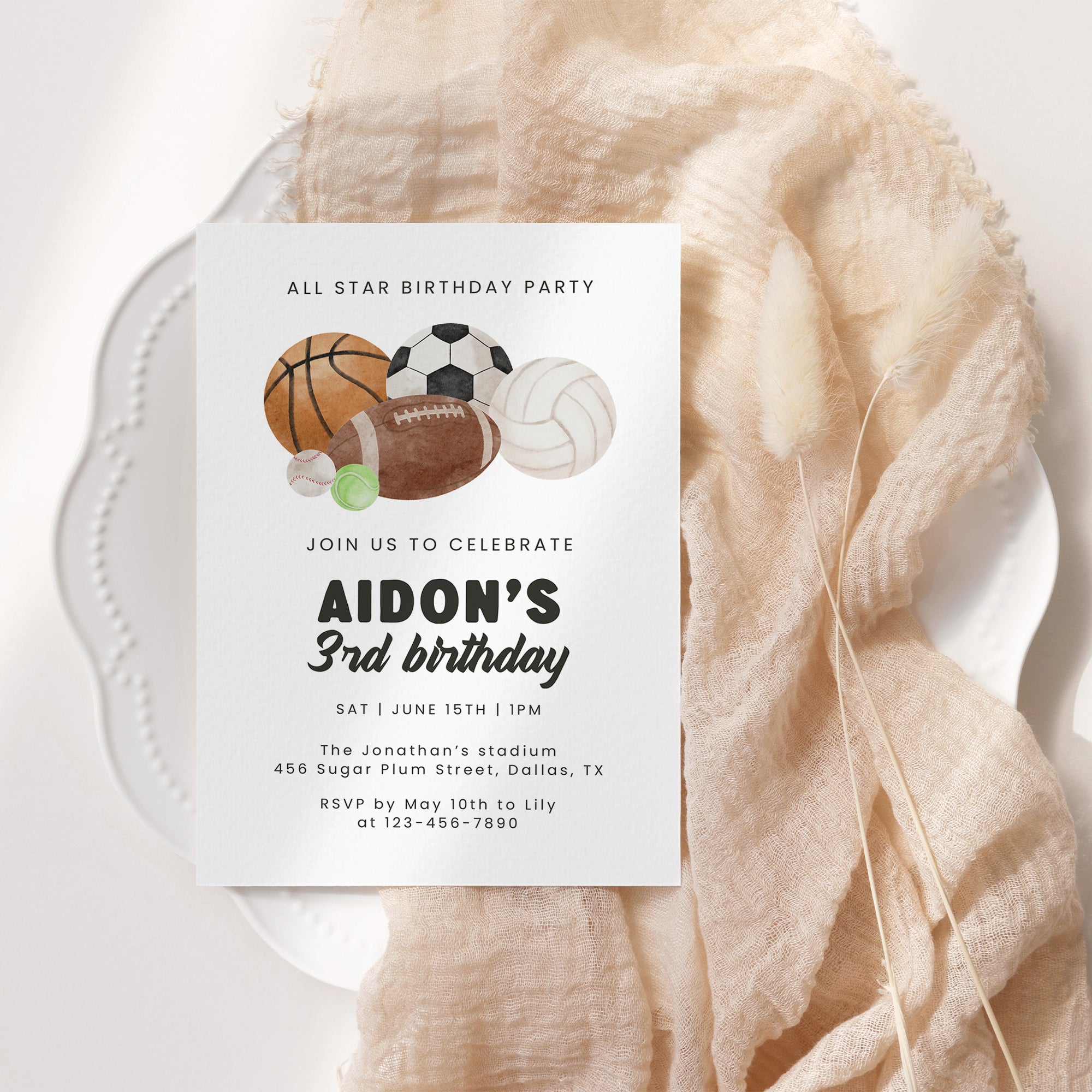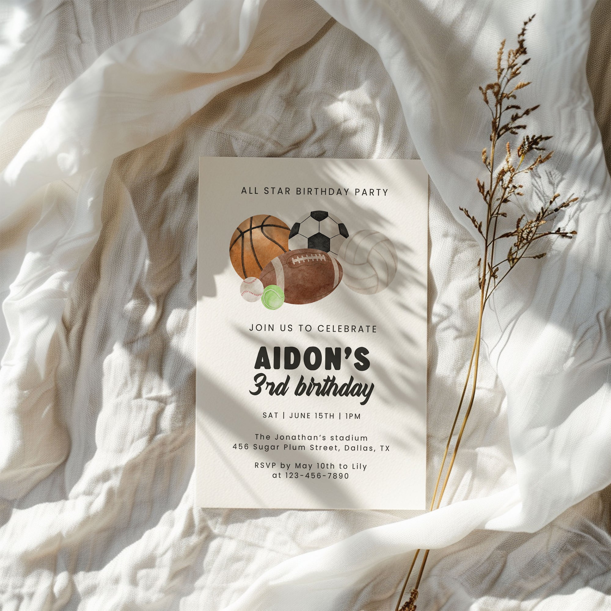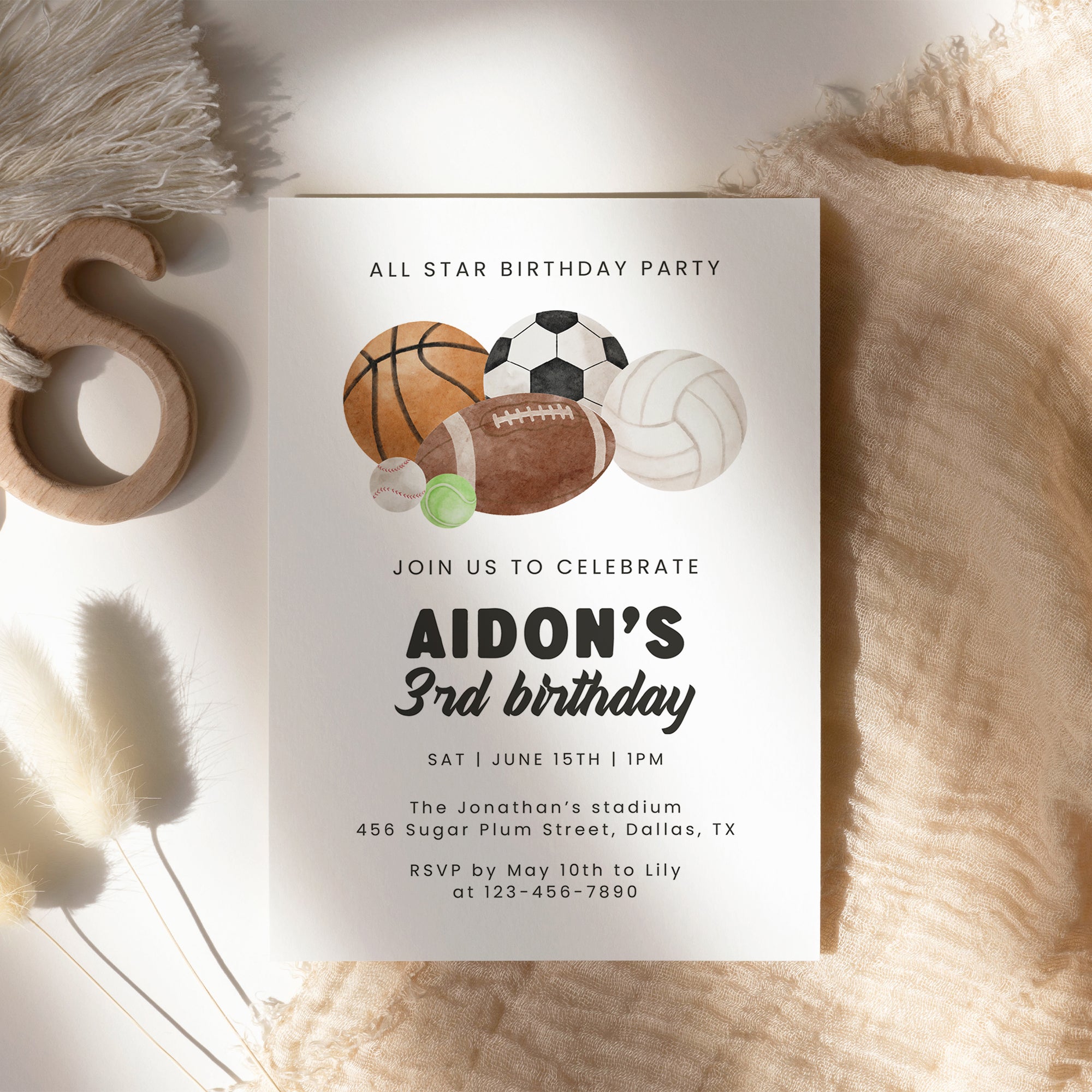 All Star Sports Birthday Invitation for Boys Multi-Sports Balls Party Invite Watercolor Template 0334