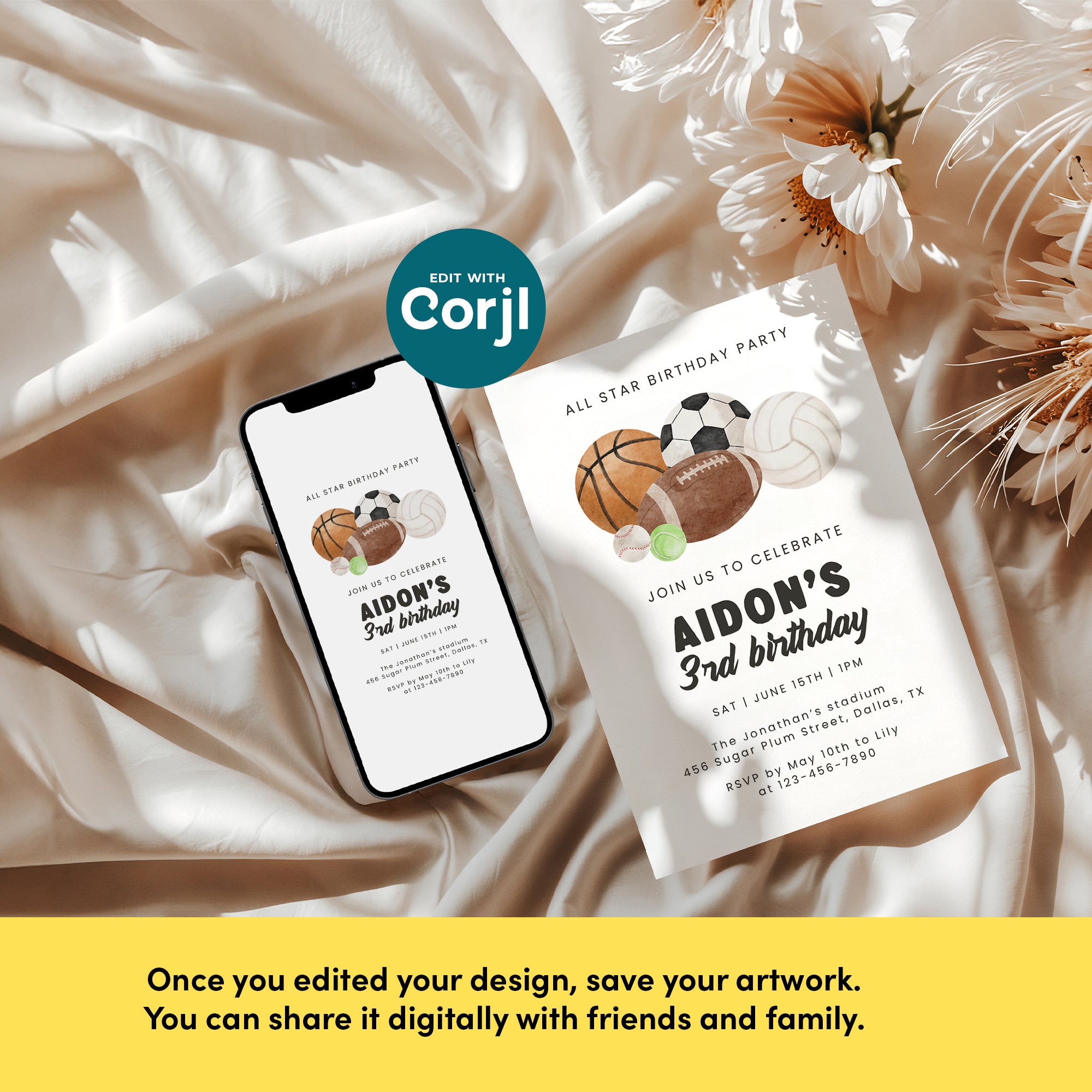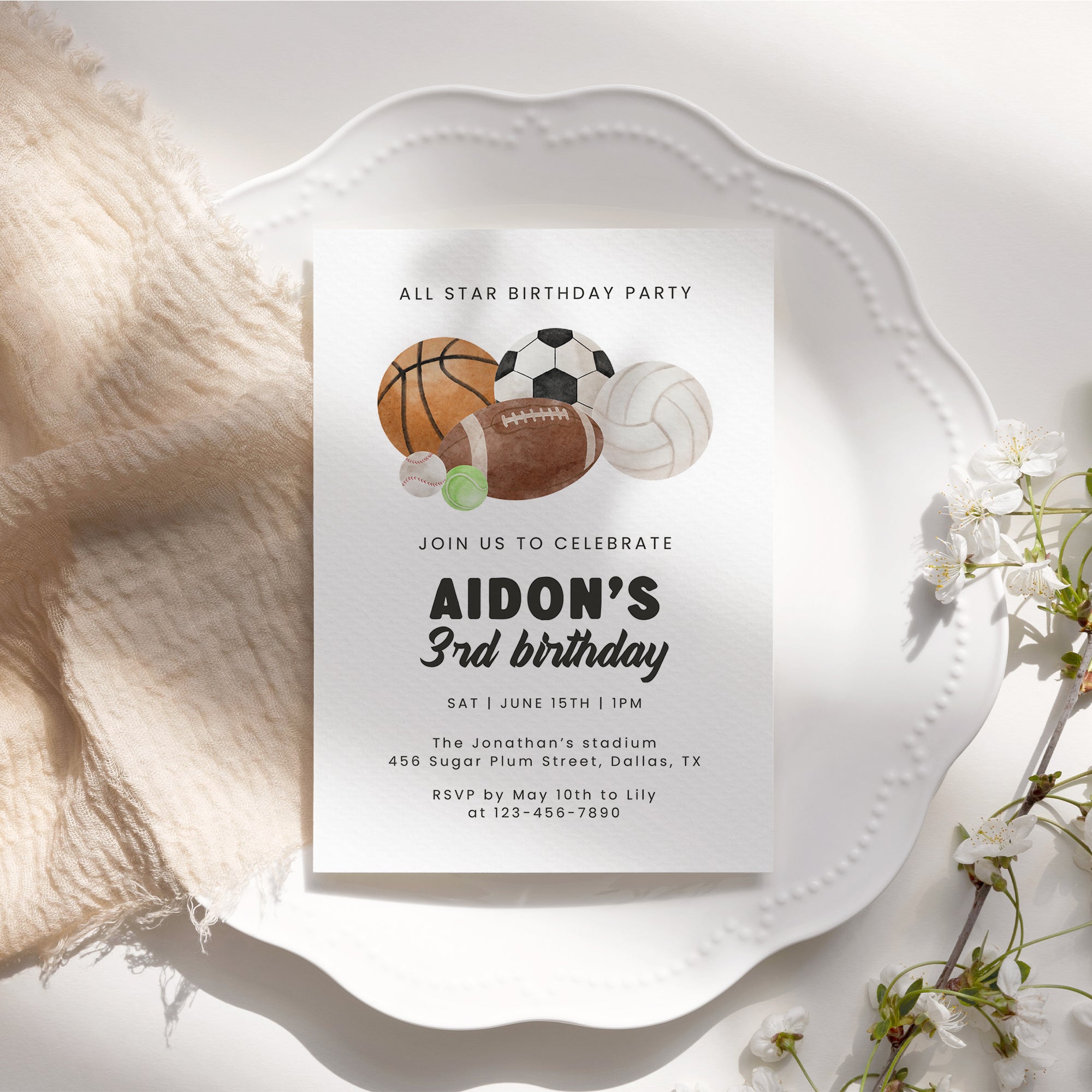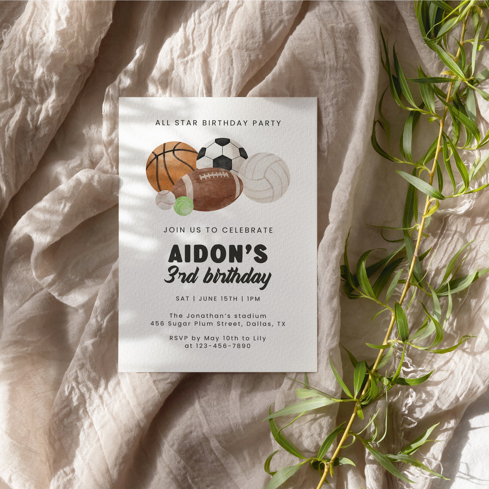 All Star Sports Birthday Invitation for Boys Multi-Sports Balls Party Invite Watercolor Template 0334