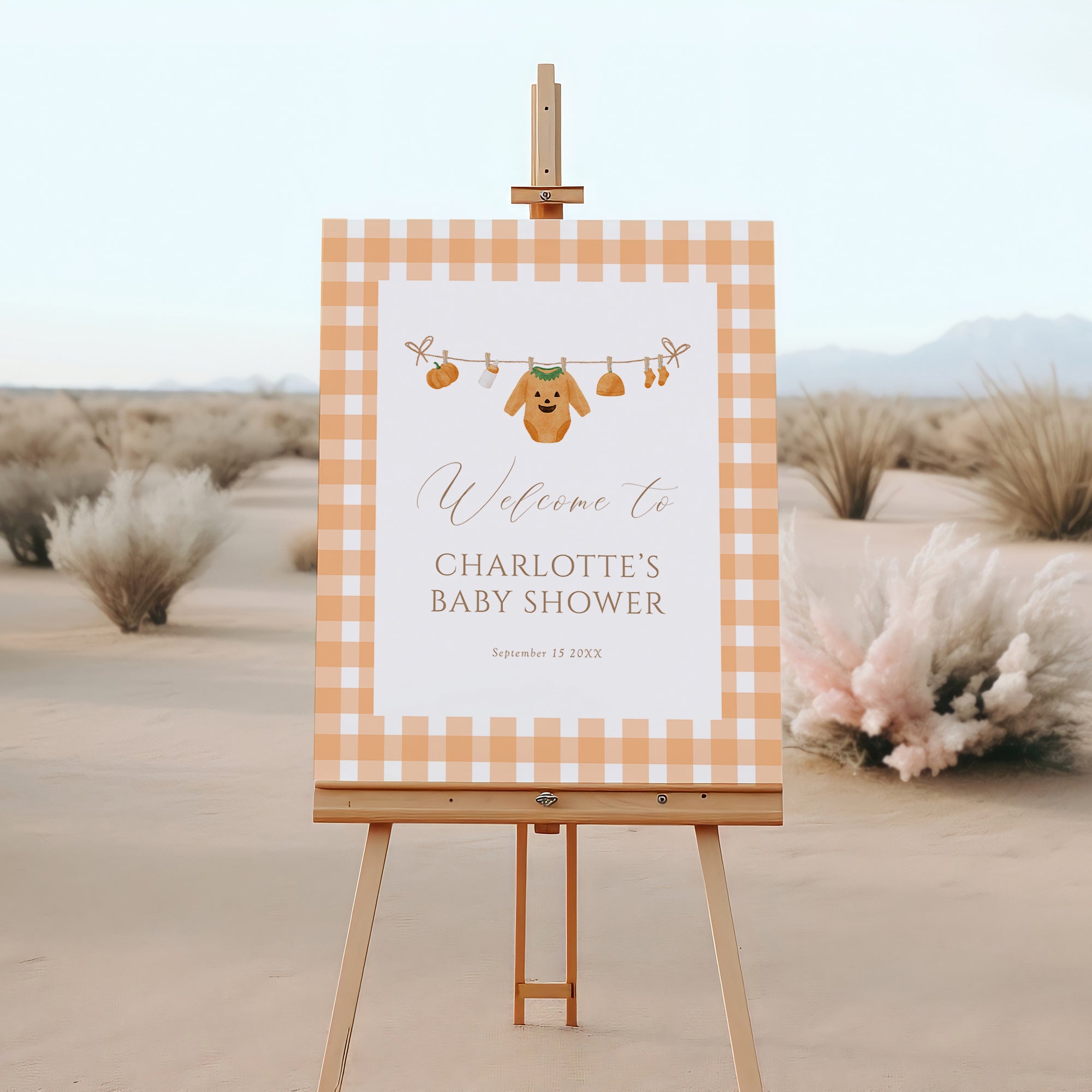 Welcome your guests in style with our Little Pumpkin is on the Way fall baby shower welcome sign! This editable template features a charming gingham pattern, perfect for an autumn celebration. Easily customize with our user-friendly Corjl template to add personal touches. Ideal for embracing the cozy vibes of your autumn baby shower, this sign sets the perfect tone for your event. Download, edit, and print for a delightful addition to your decor! Celebrate this special season with ease!