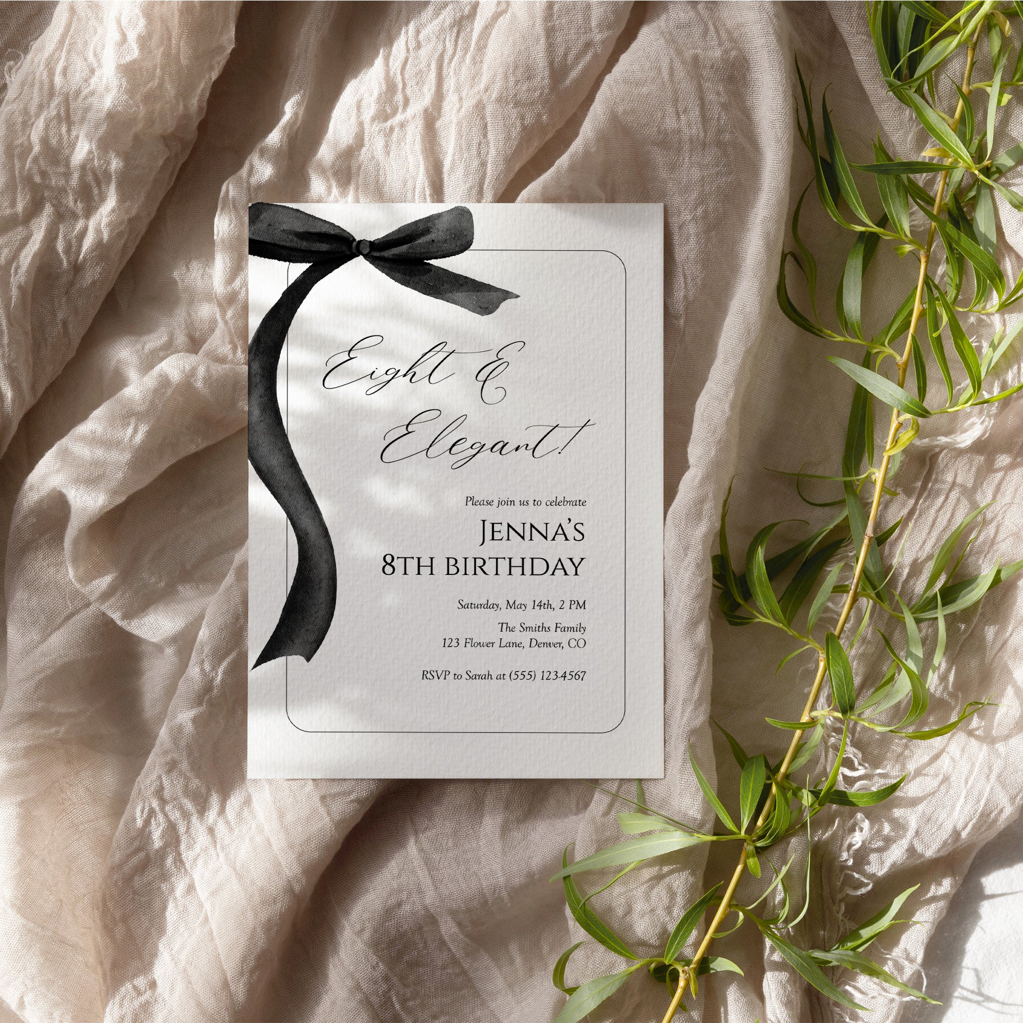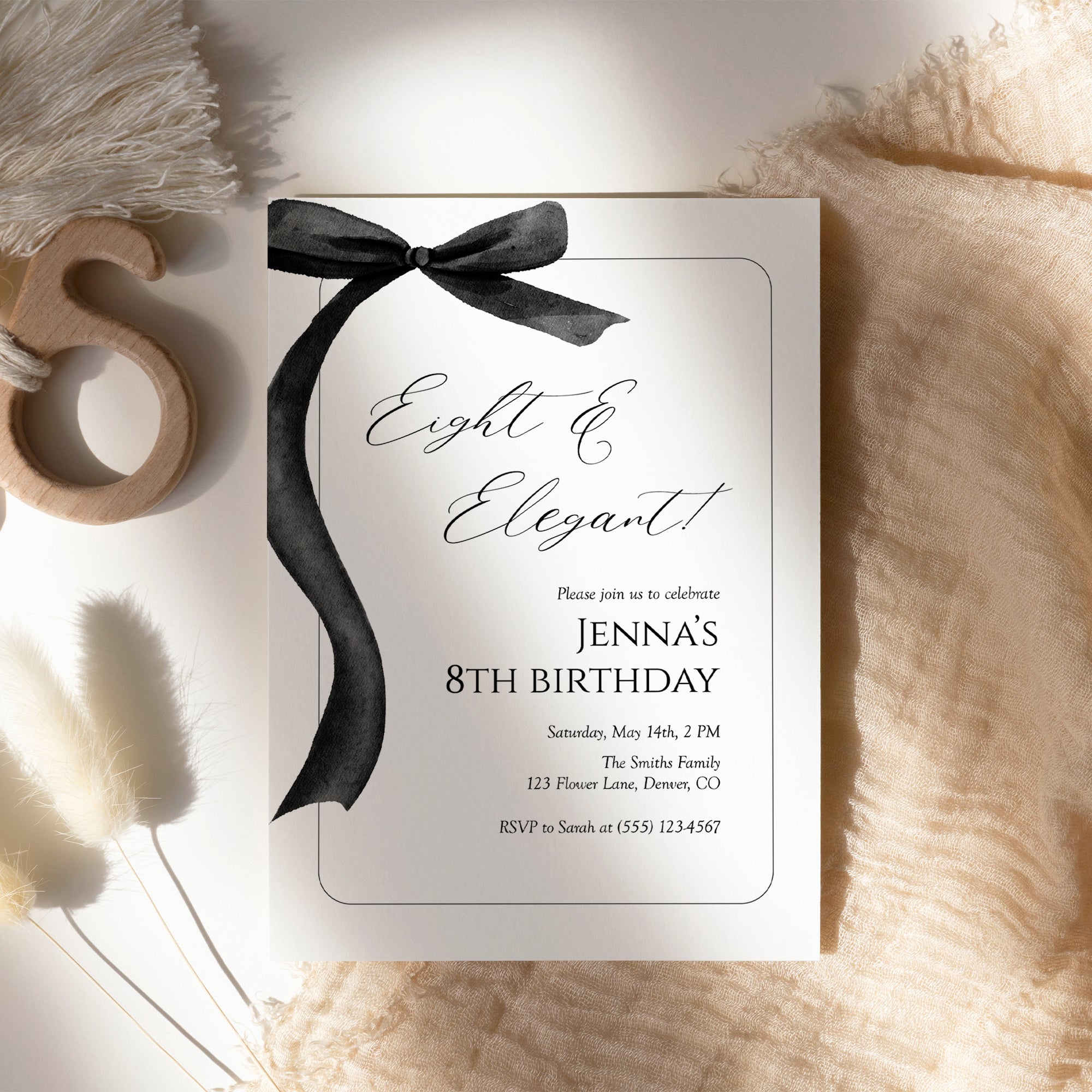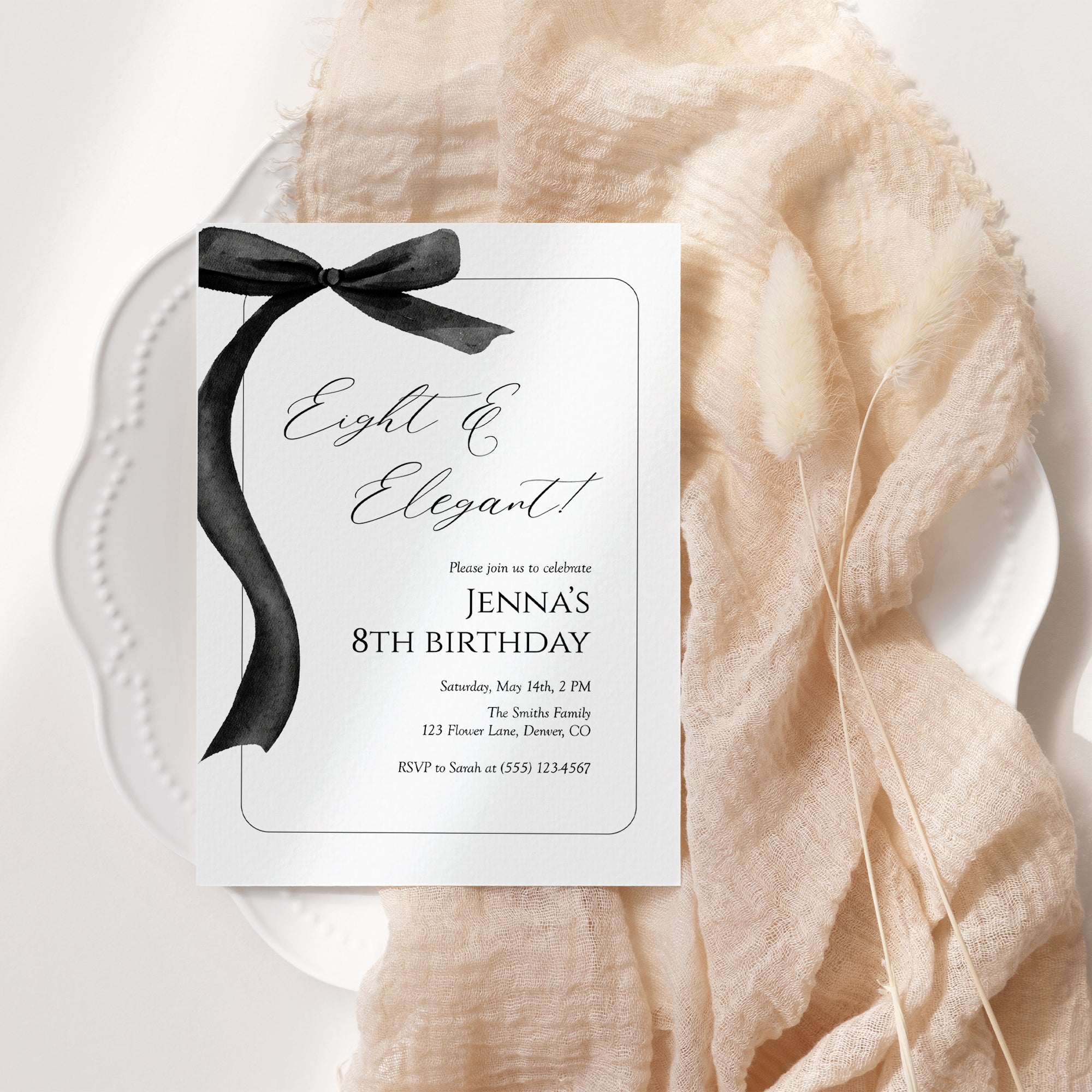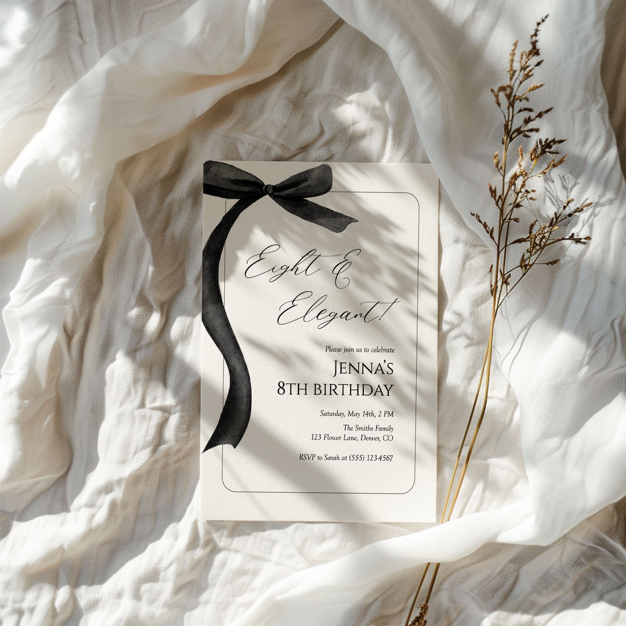 Celebrate your little one's special day with our elegant invite for an 8th birthday girl! This stunning eight and elegant invitation features a chic black bow design. Perfect for modern celebrations, this editable template allows you to personalize the details with ease. Instantly download and print your invitations at home or share digitally with friends and family. Make her birthday unforgettable with a touch of sophistication!